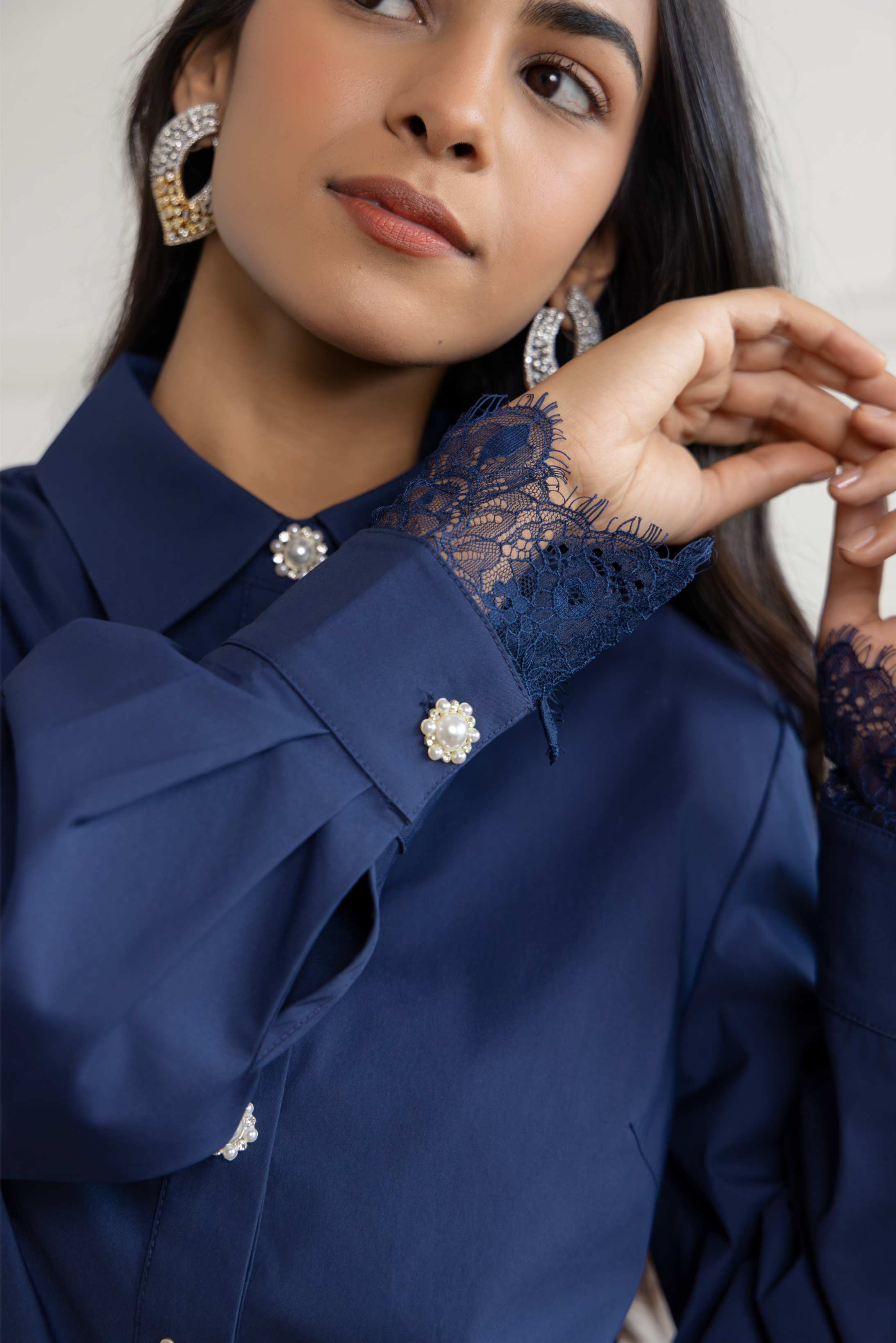 Navy Blue Habotai Silk bow shirt adorned with French lace and hand embroidered floral motifs, embodying quiet sophistication.
