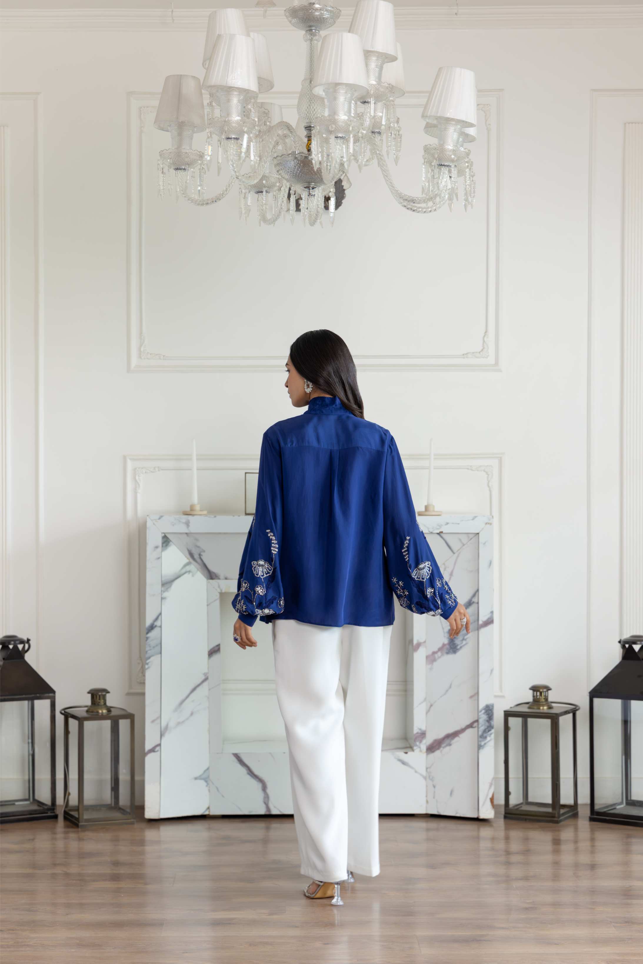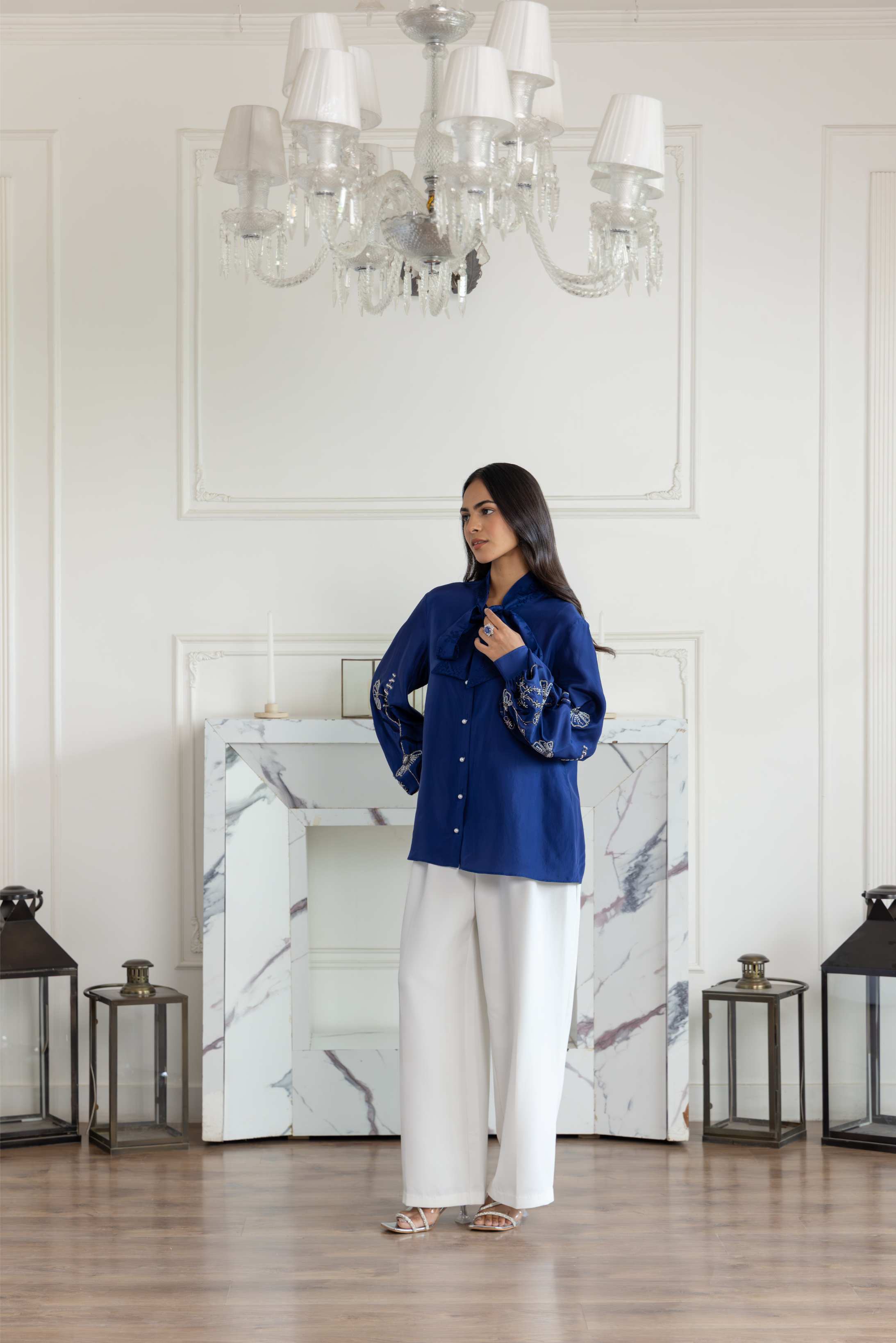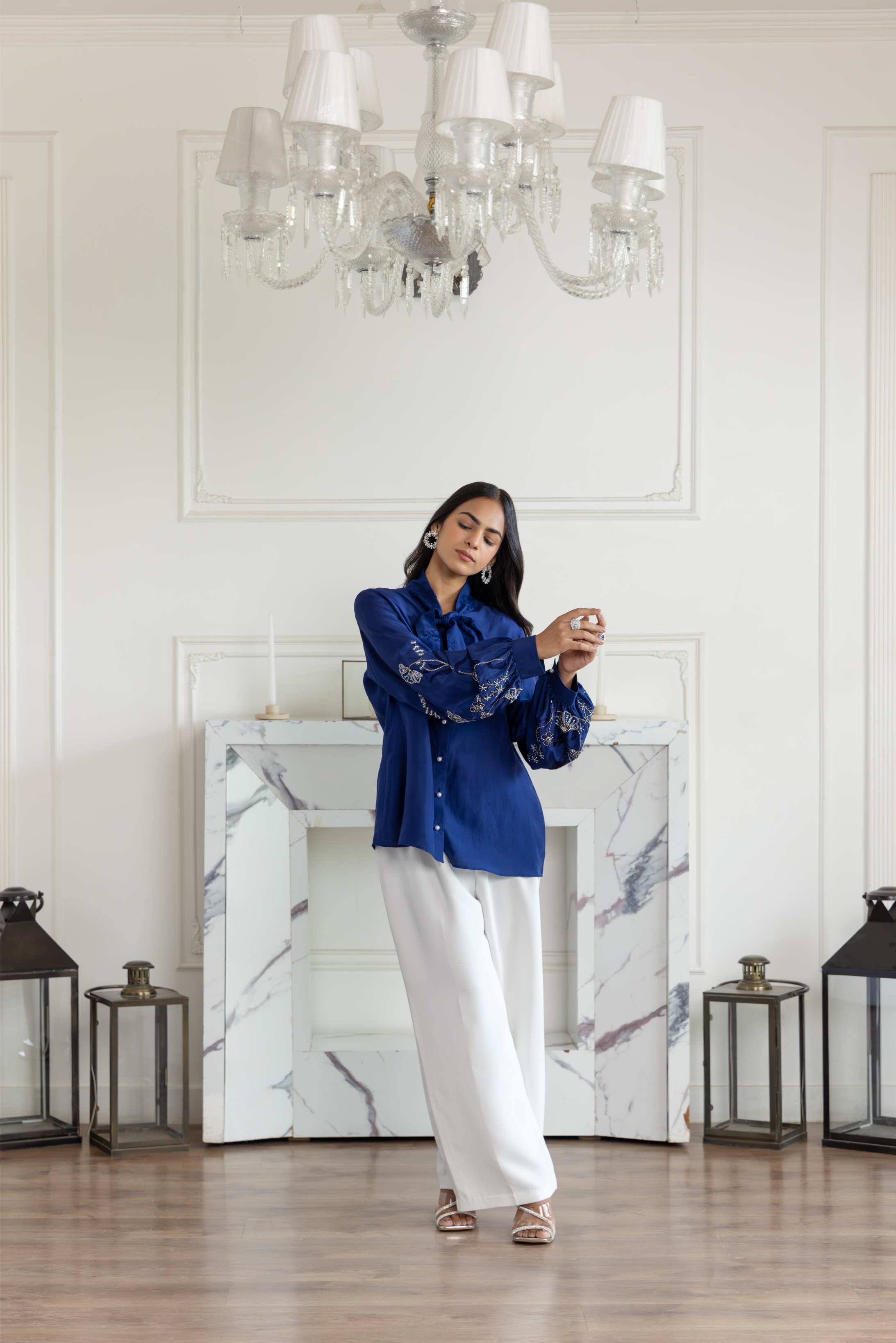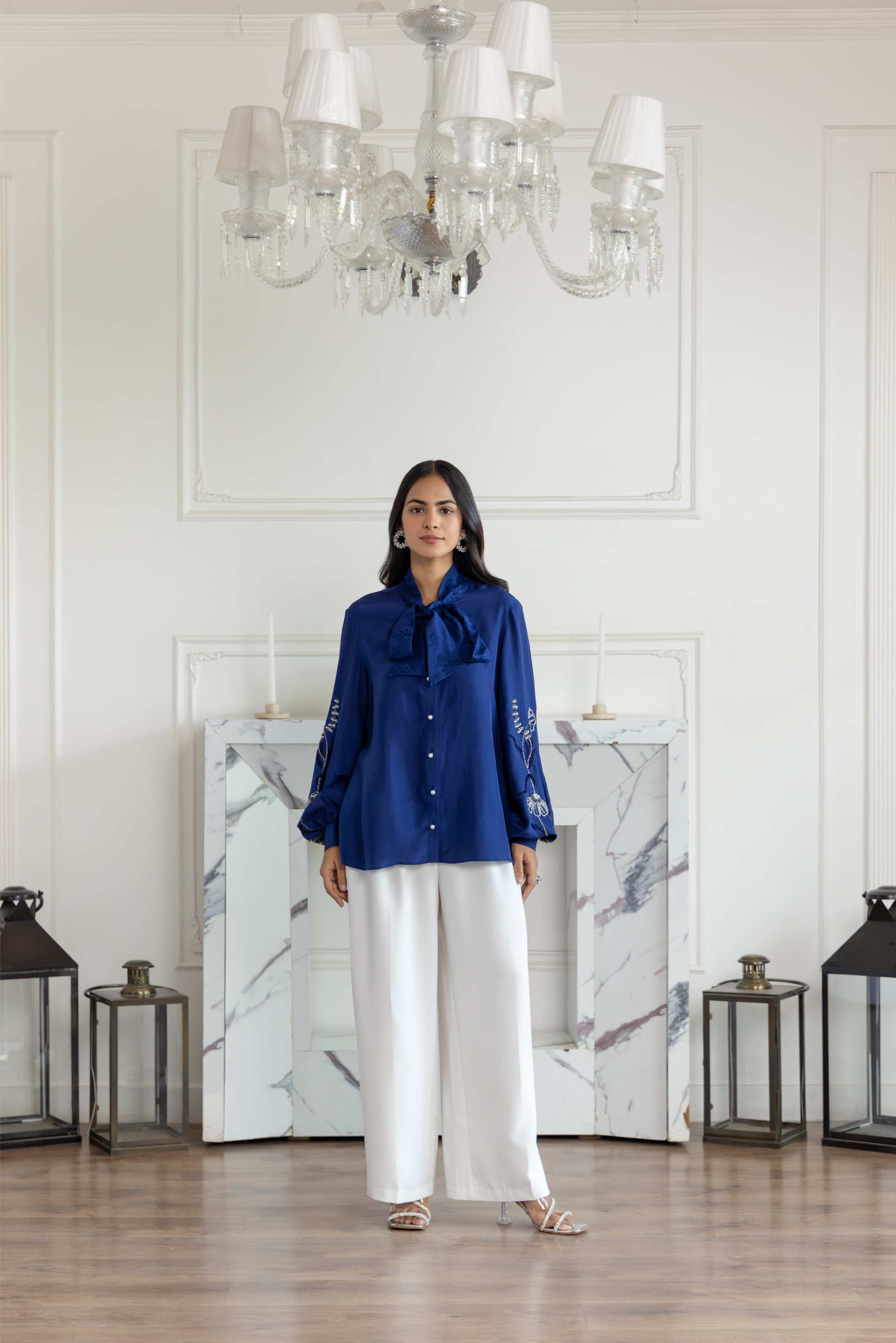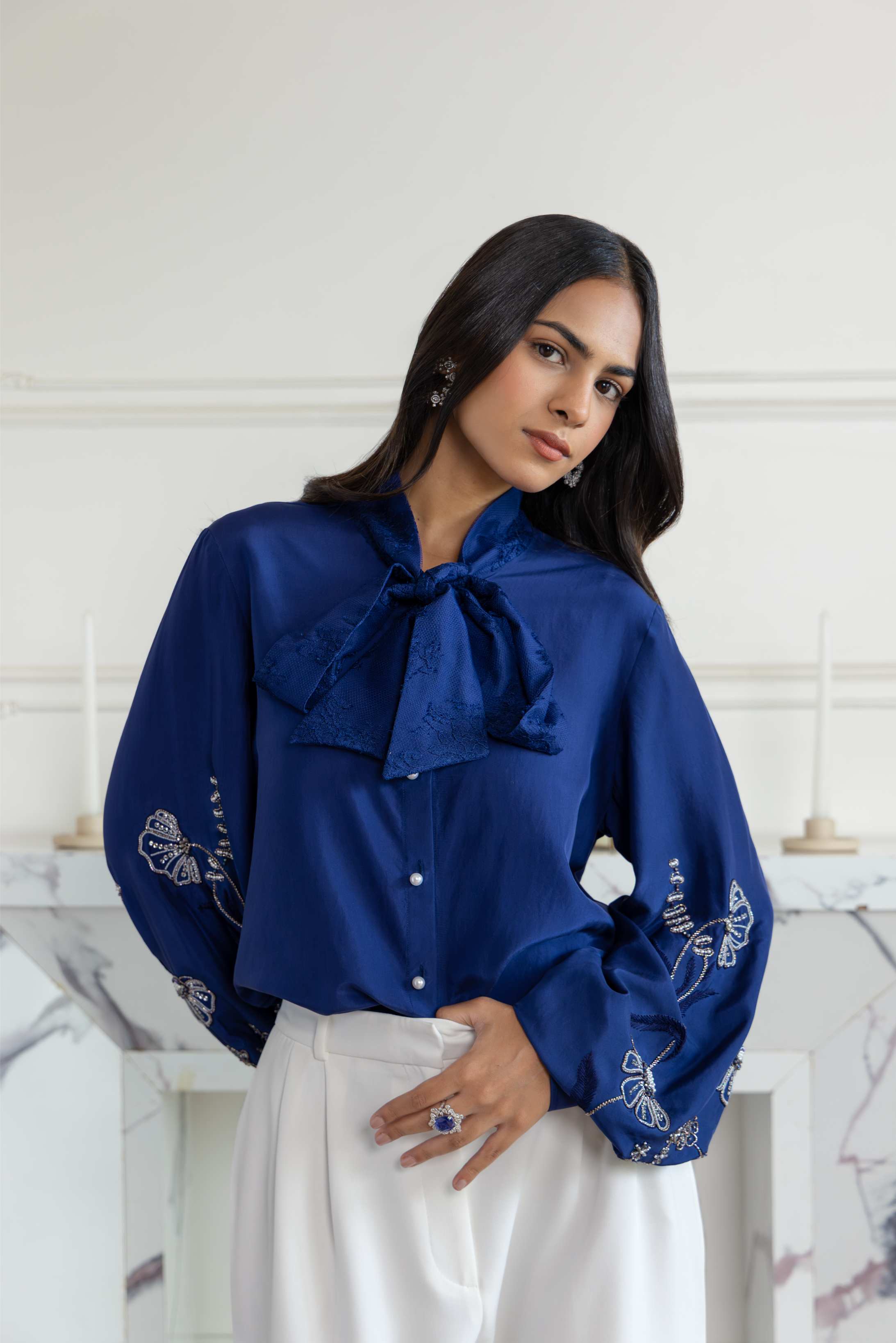 Crafted in 100% pure Habotai Silk and accented with certified Dentelle de Calais-Caudry® French lace, this Blue bow shirt is elevated with 50 hours of meticulous hand embroidery. The full sleeves are adorned with intricate floral motifs and swirling patterns, brought to life with antique cutdana, Jaipuri beads, and delicate nalkis. Finished with a refined bow and lace accents, it strikes the perfect balance between modern elegance and