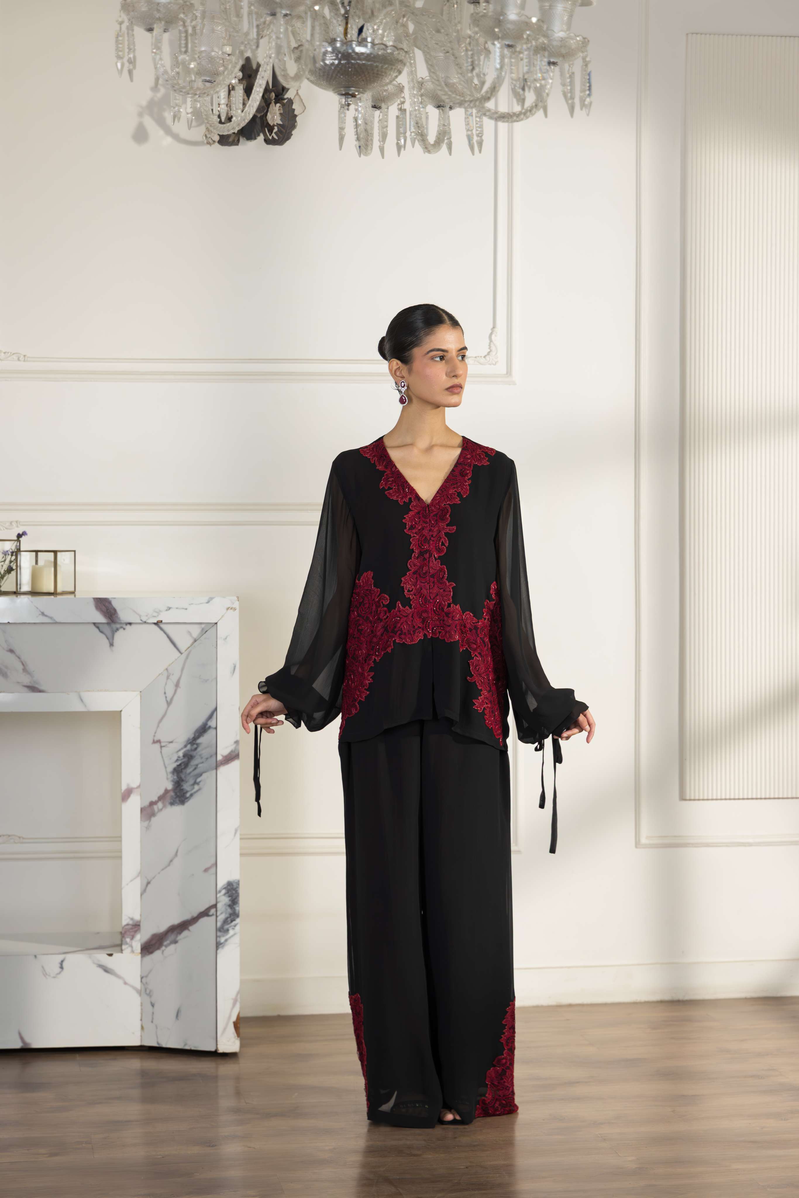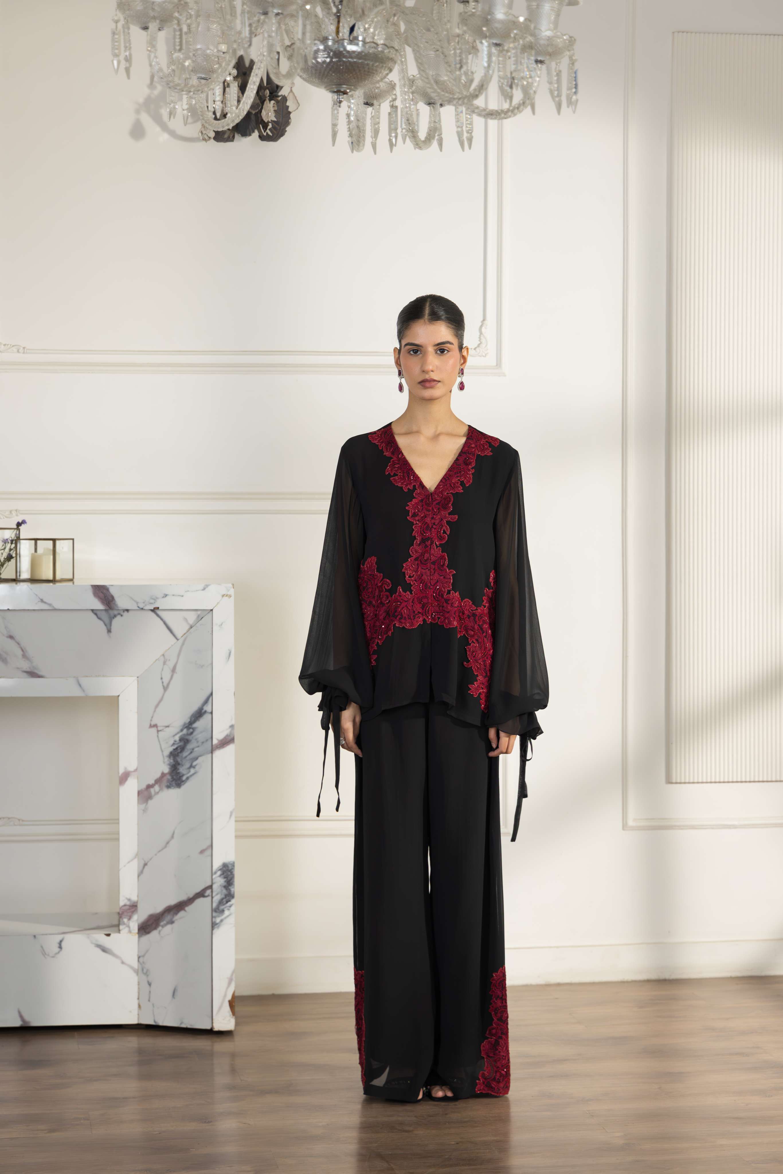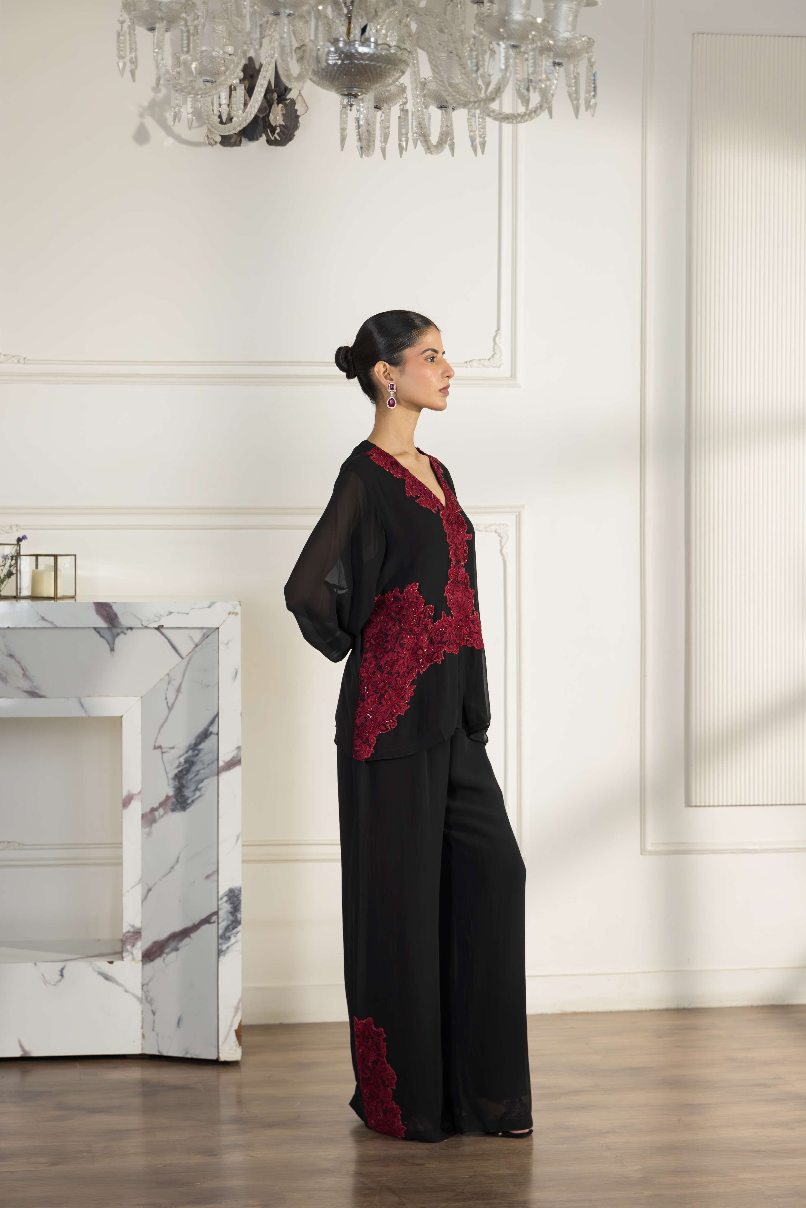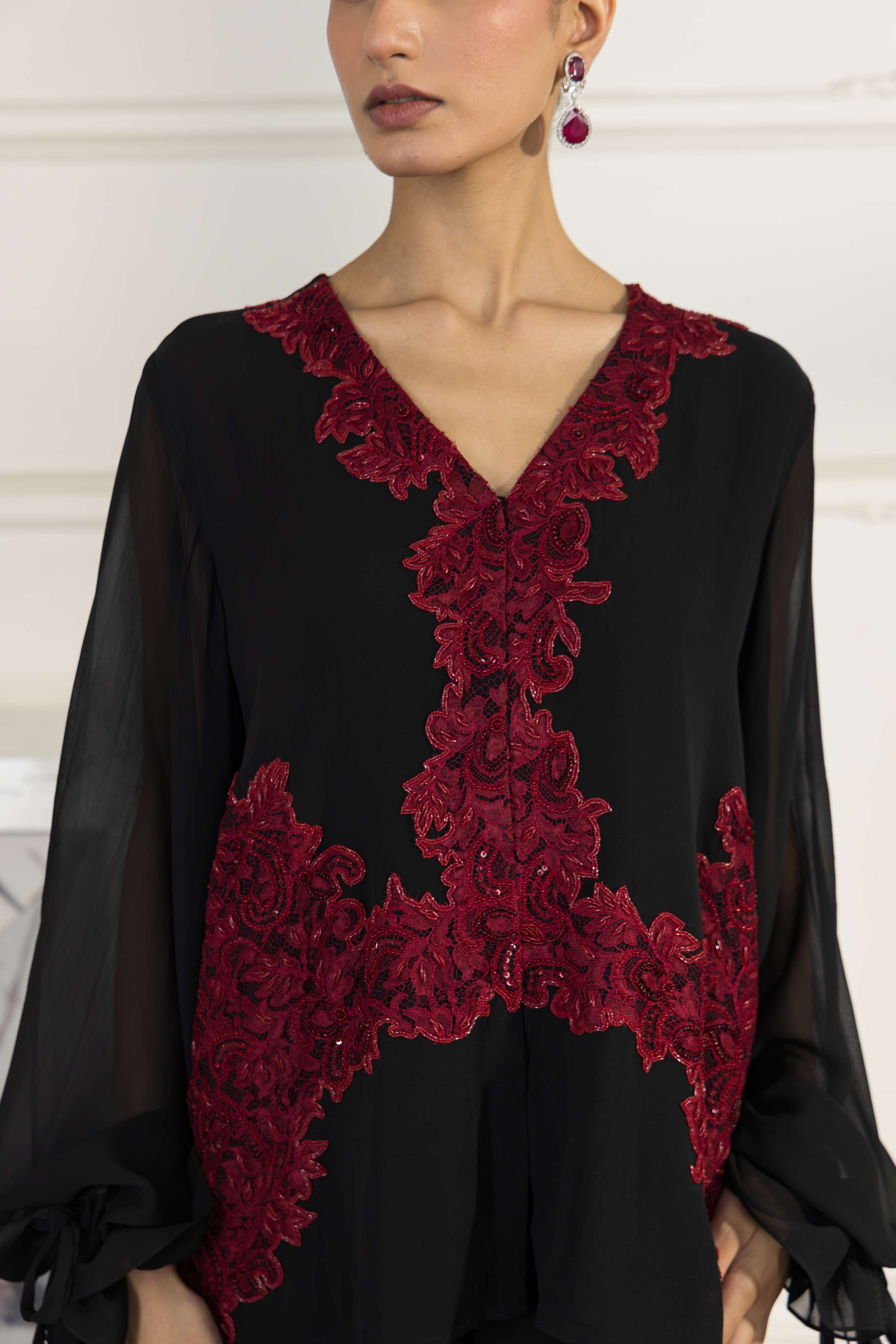 A stunning Black and Cherry red Crepe Silk co-ord set, elevated with hand embellished French Chantilly lace for refined tailoring.