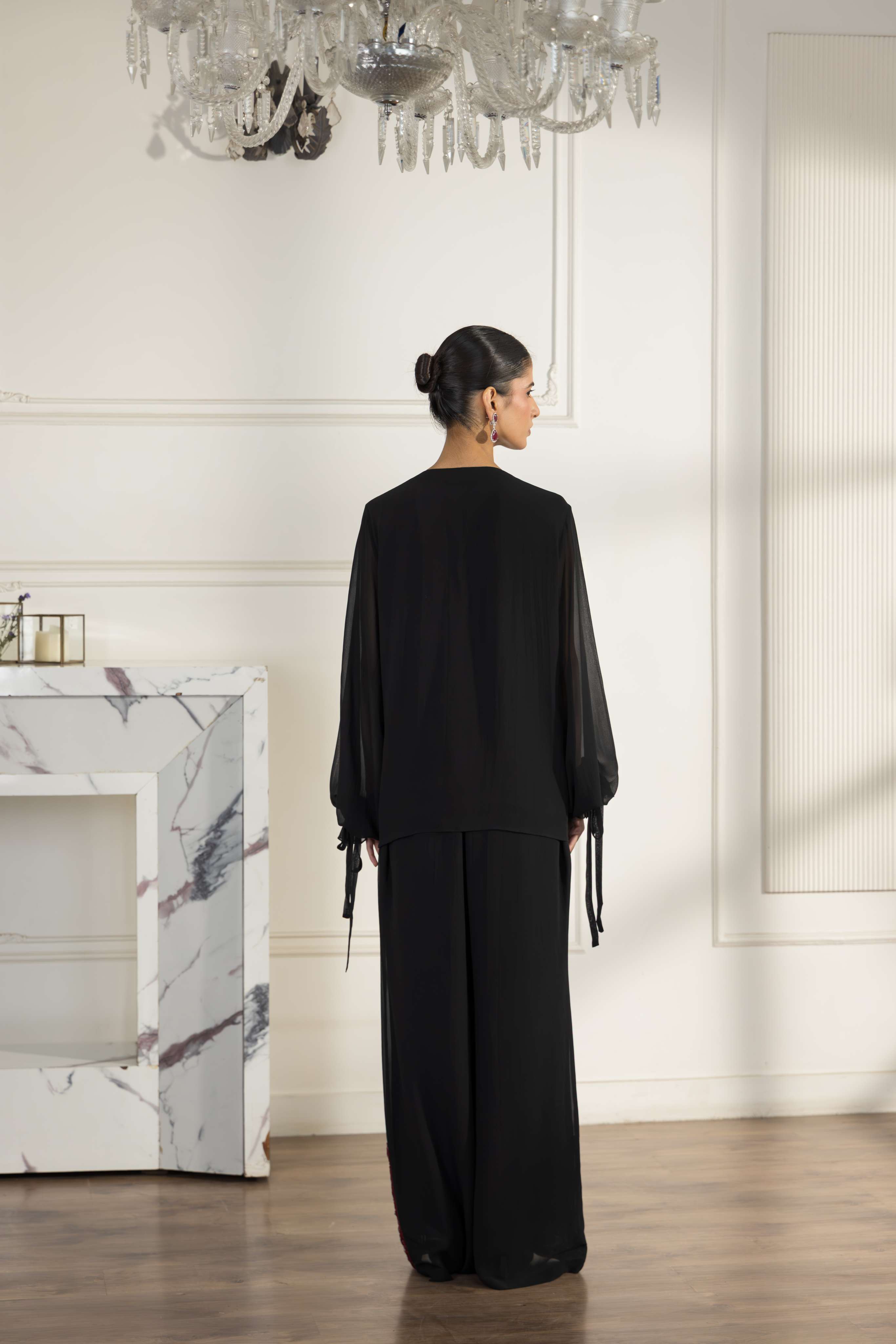 Designed in 100% Crepe Silk, this co-ord set brings together bold contrast and artisanal detail. The Dentelle de Calais-Caudry French Chantilly lace is hand-embellished over 25 hours, with intricate patchwork and delicate highlighting across both the top and pants. Enhanced with adjustable balloon sleeves, a centre opening, and straight flowy pants, the set combines structure and fluidity in a distinctive statement look. This silhouette is perfect for evening gatherings, festive occasions, and celebratory evenings.