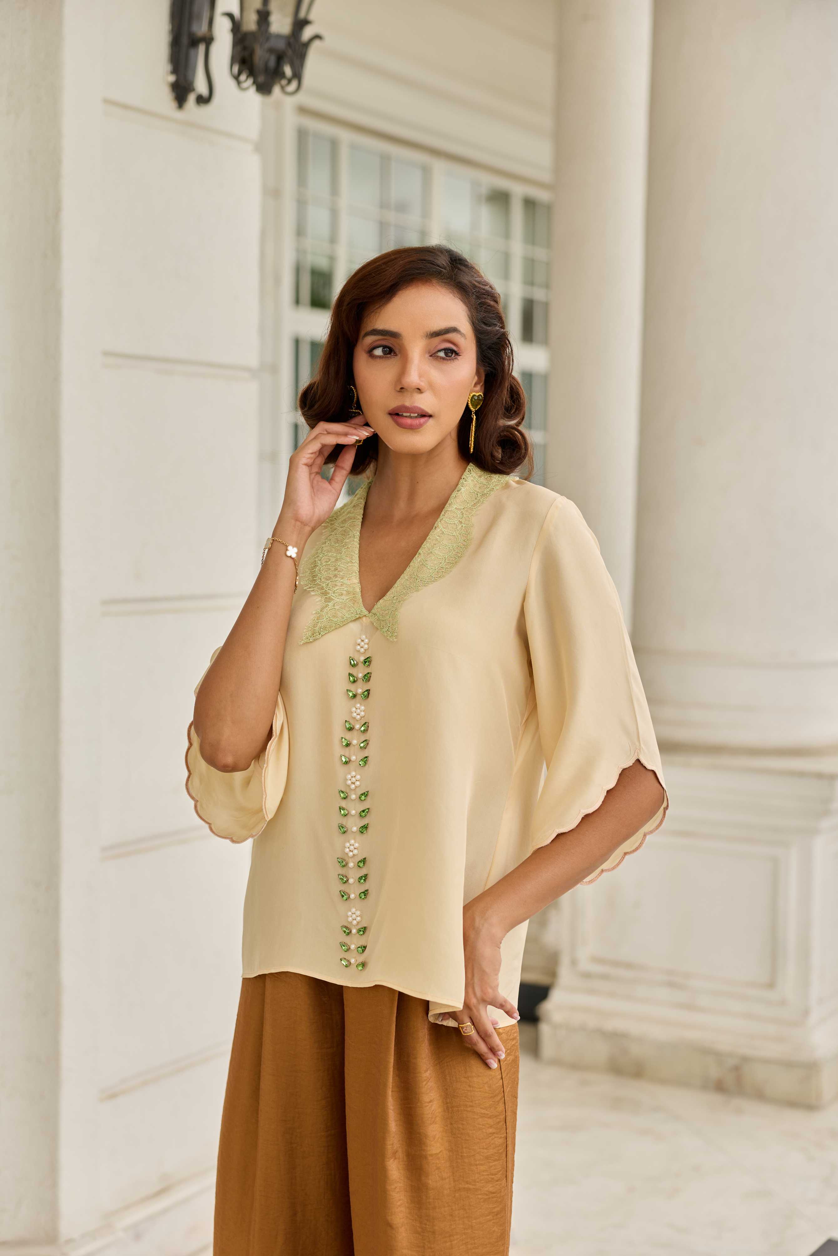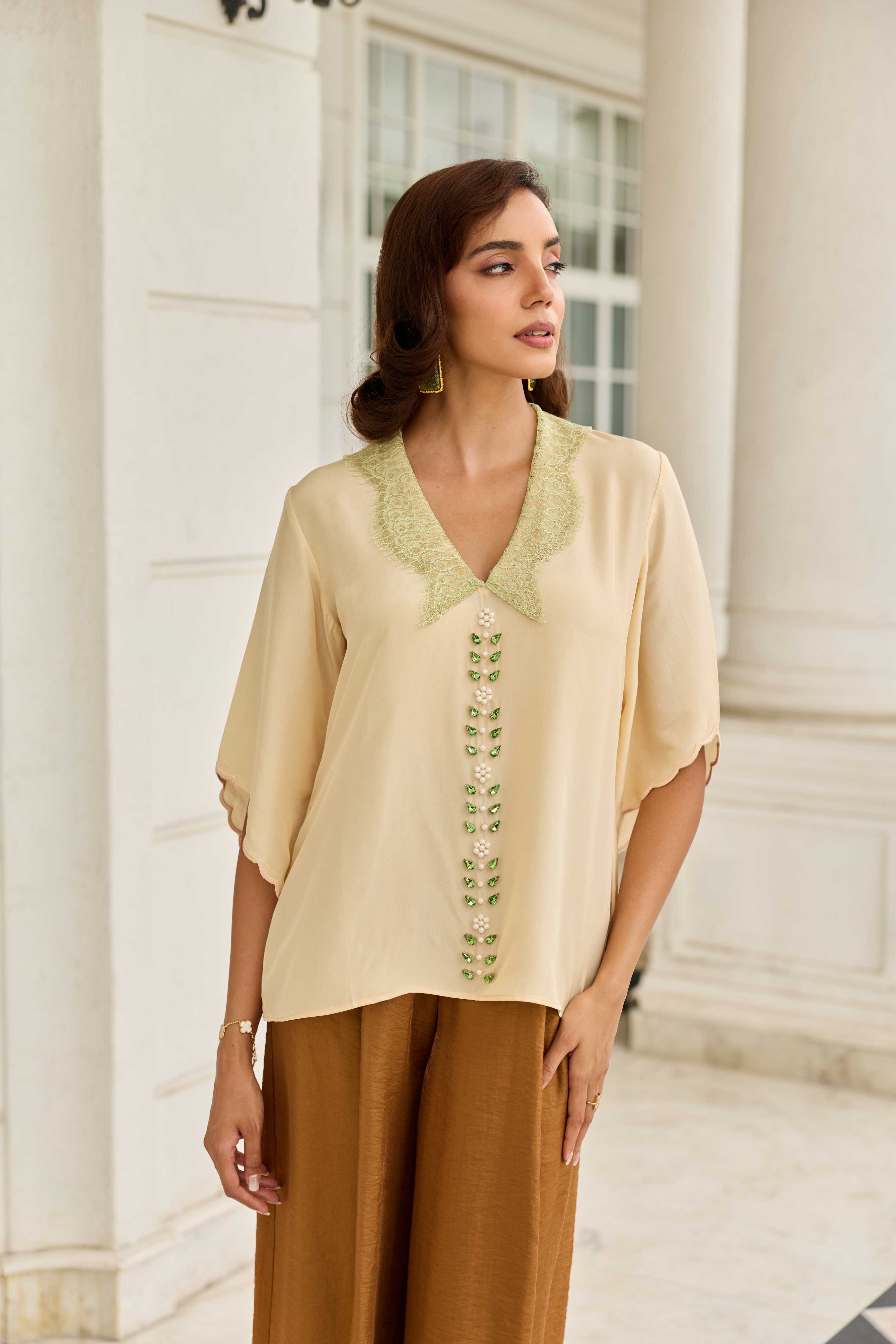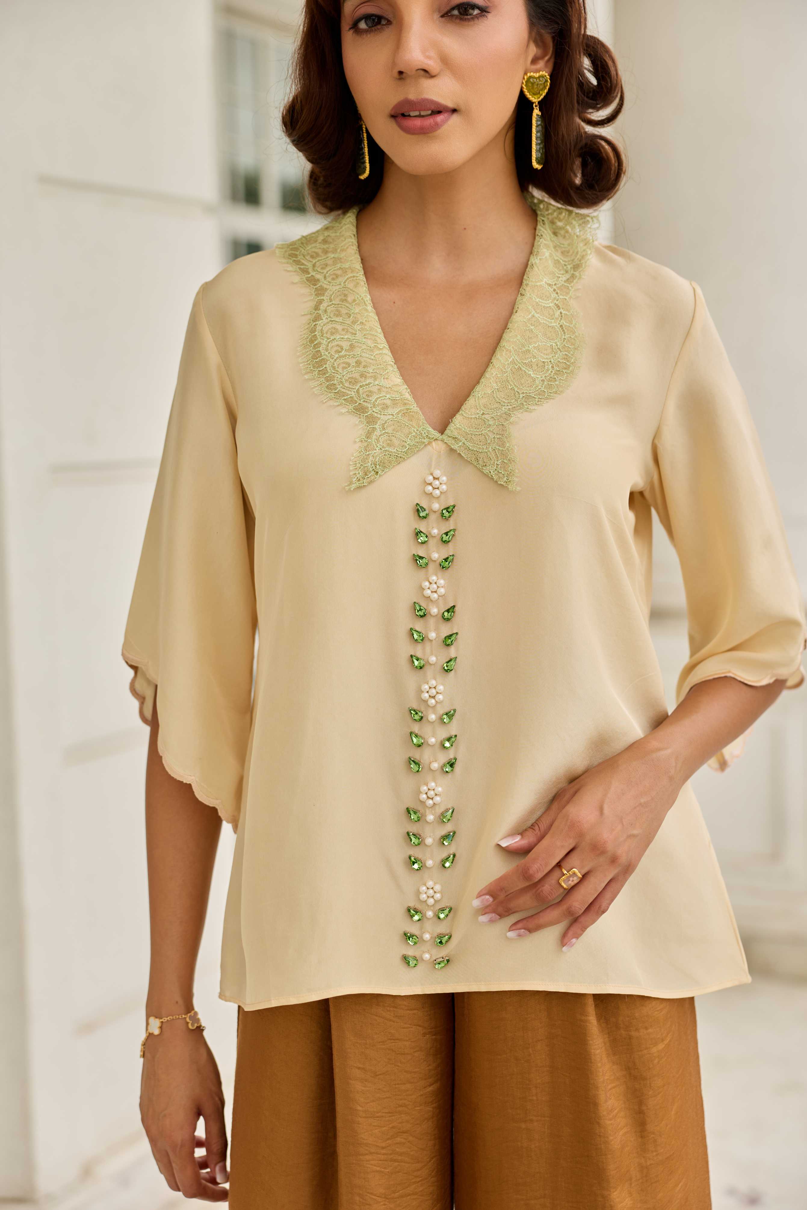 A soft beige silk top featuring a scalloped French lace collar and pearl-studded floral embroidery, crafted for refined elegance from day to night.