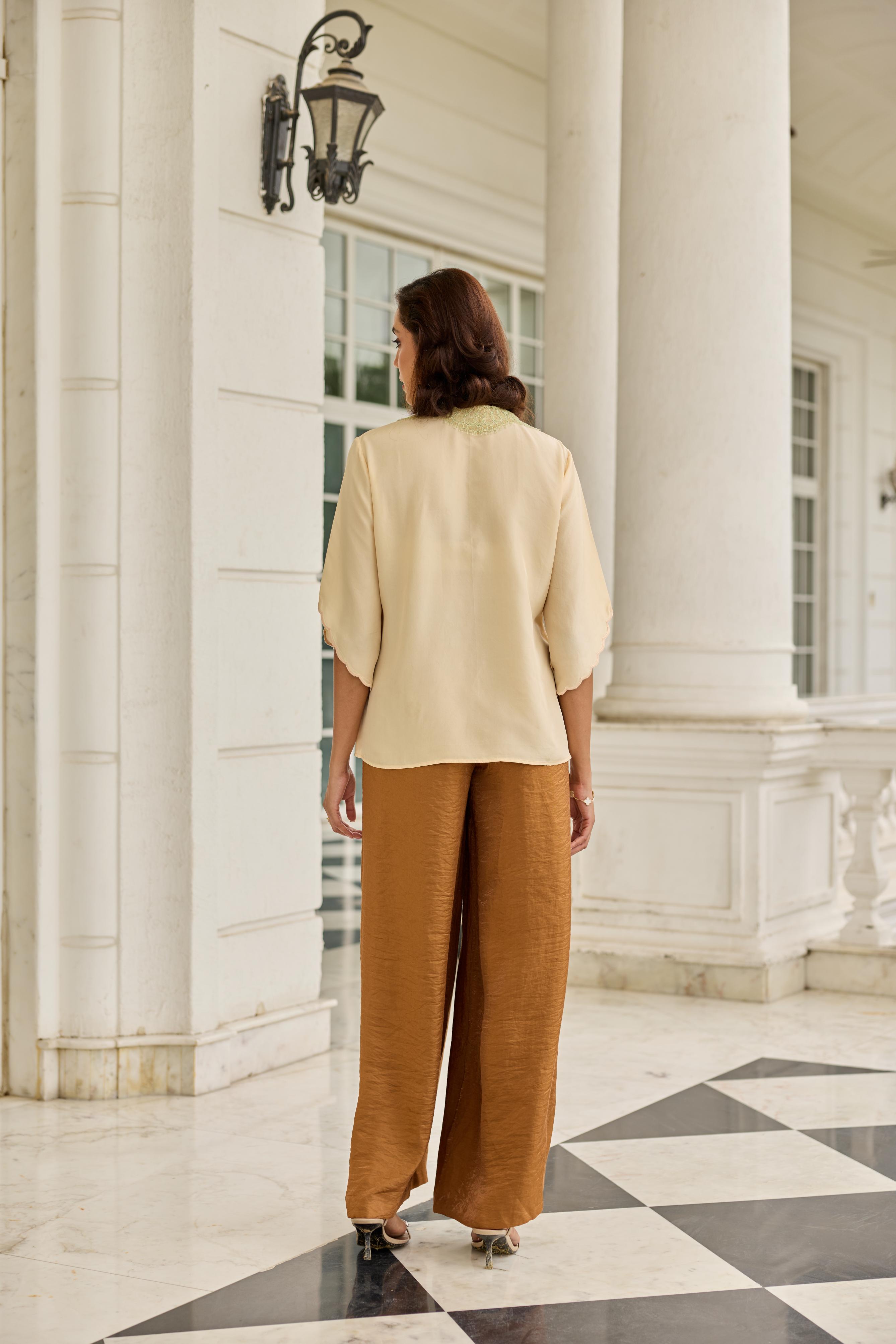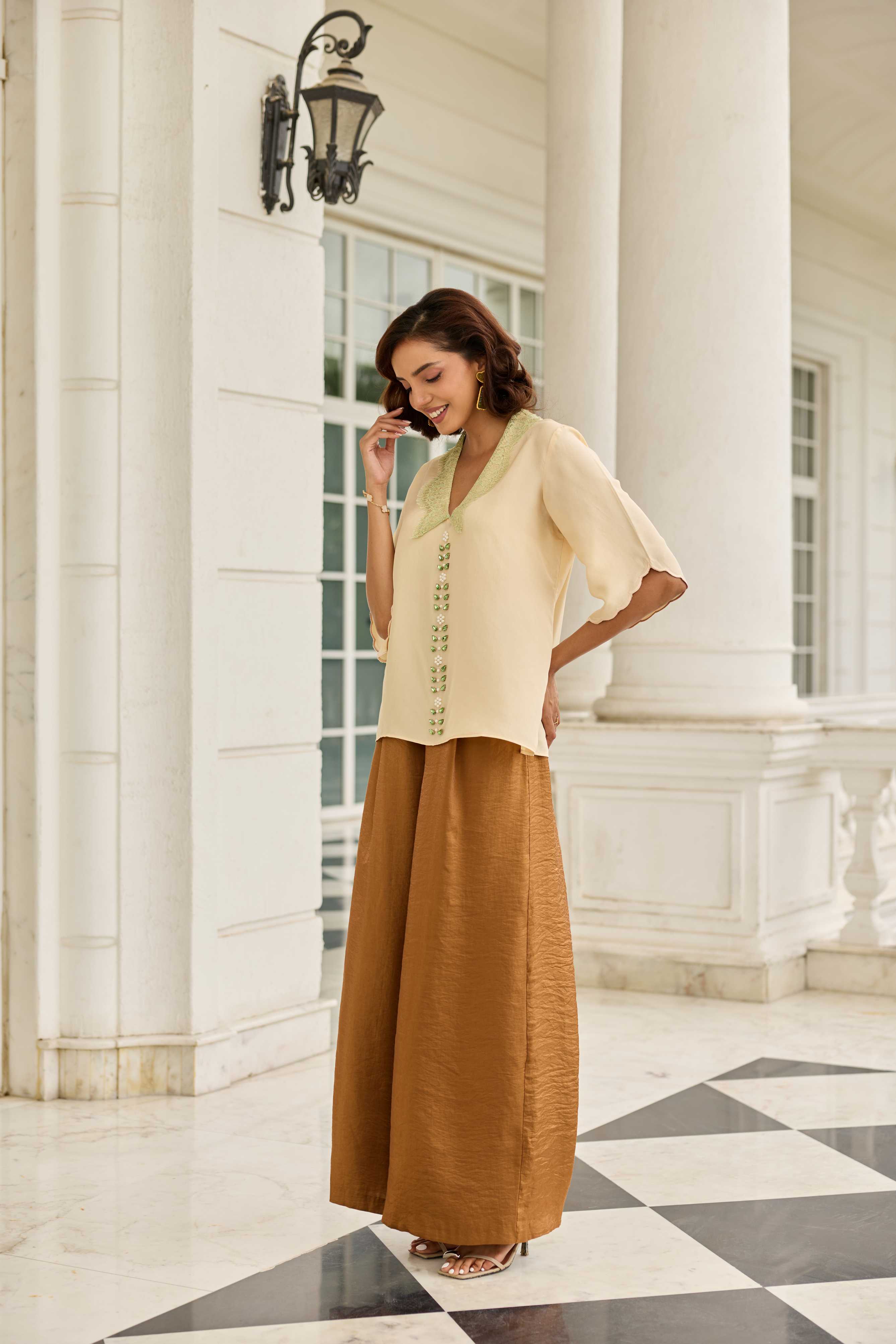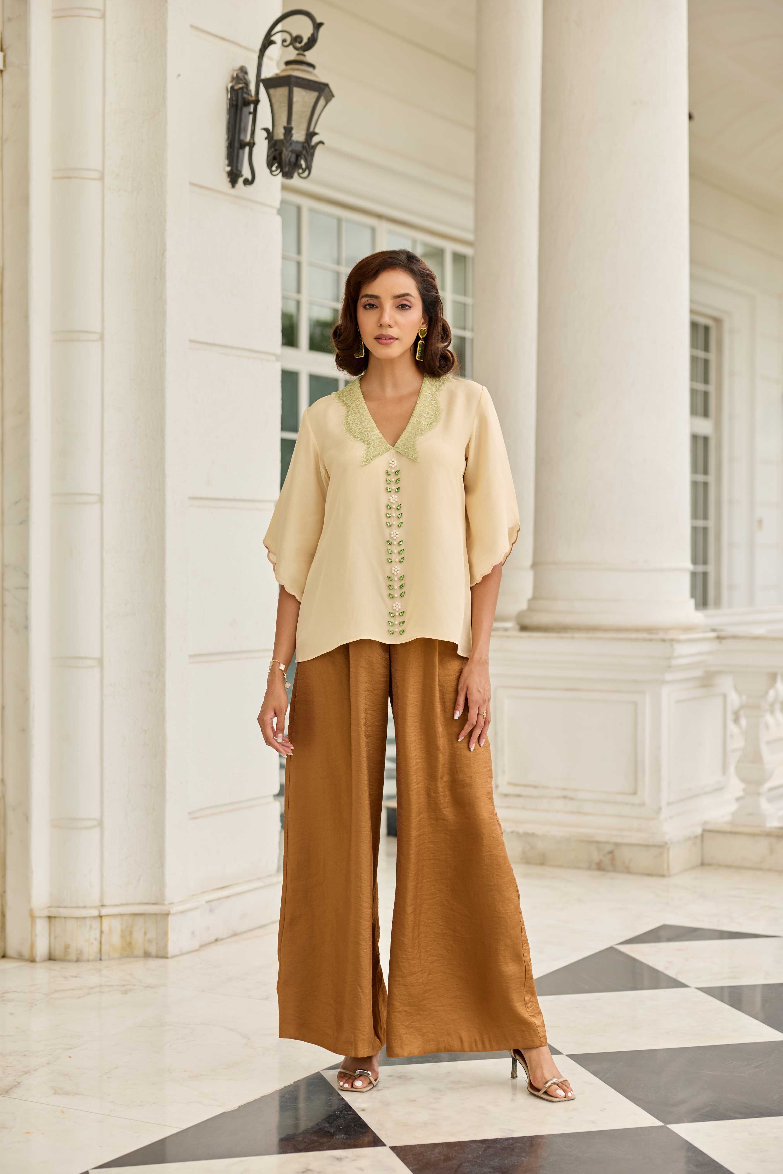 A soft beige silk top featuring a scalloped French lace collar and pearl-studded floral embroidery, crafted for refined elegance from day to night.