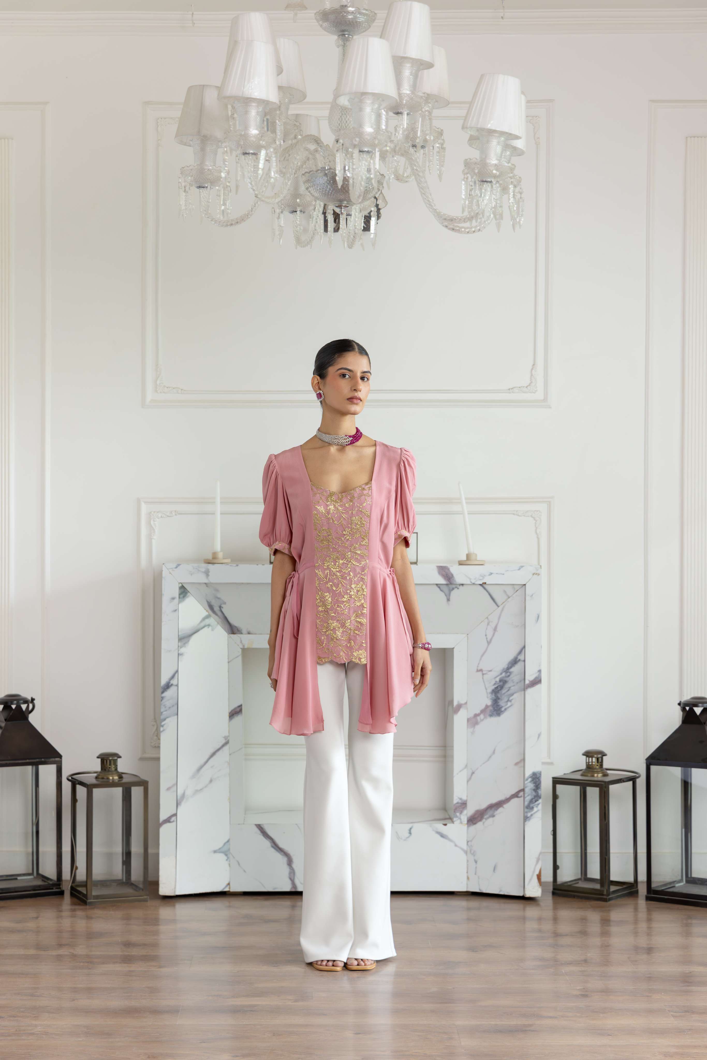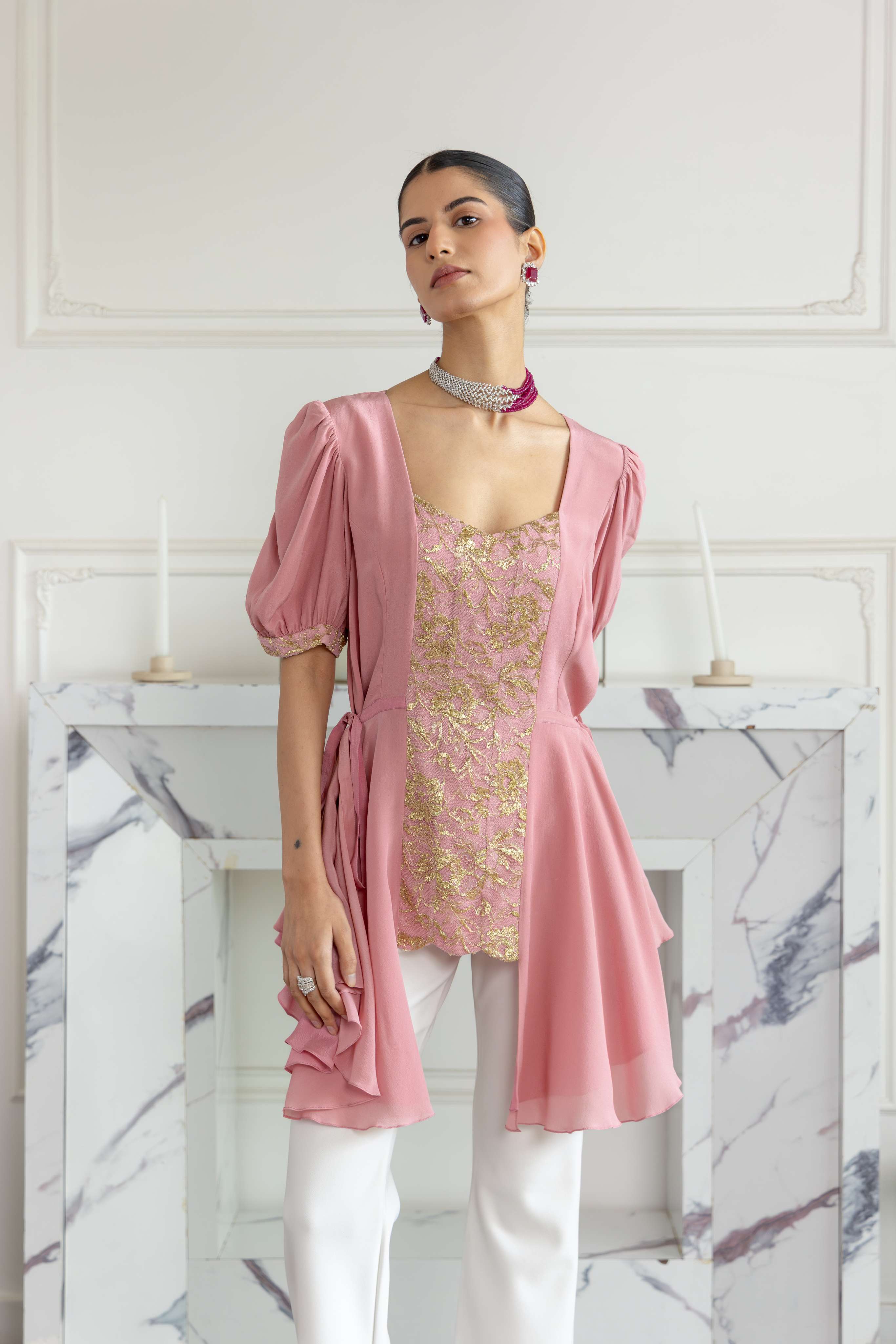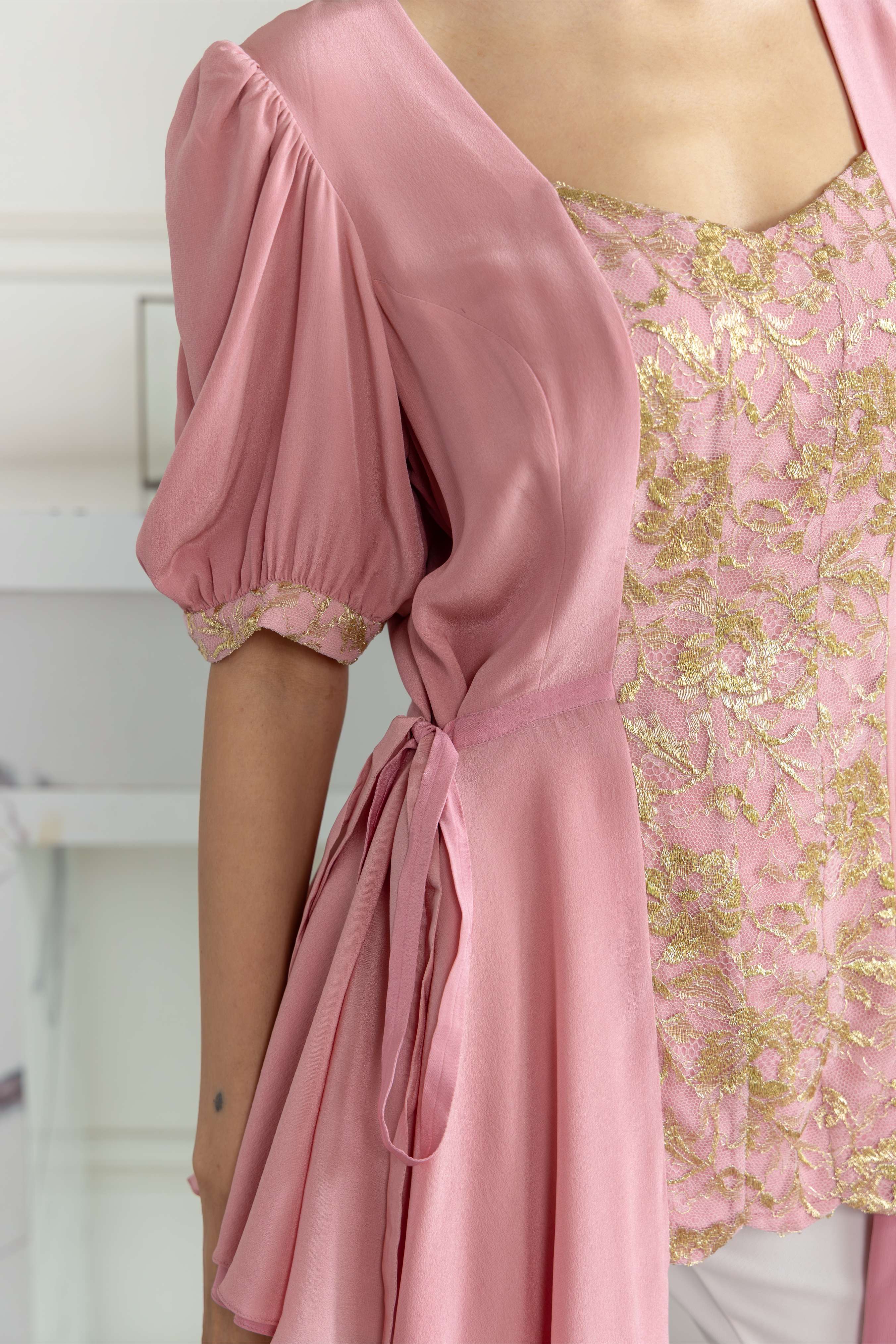 Pink Crepe Silk top with metallic Gold French lace panels, puffed sleeves, and delicate bow ties details for a graceful and feminine finish.