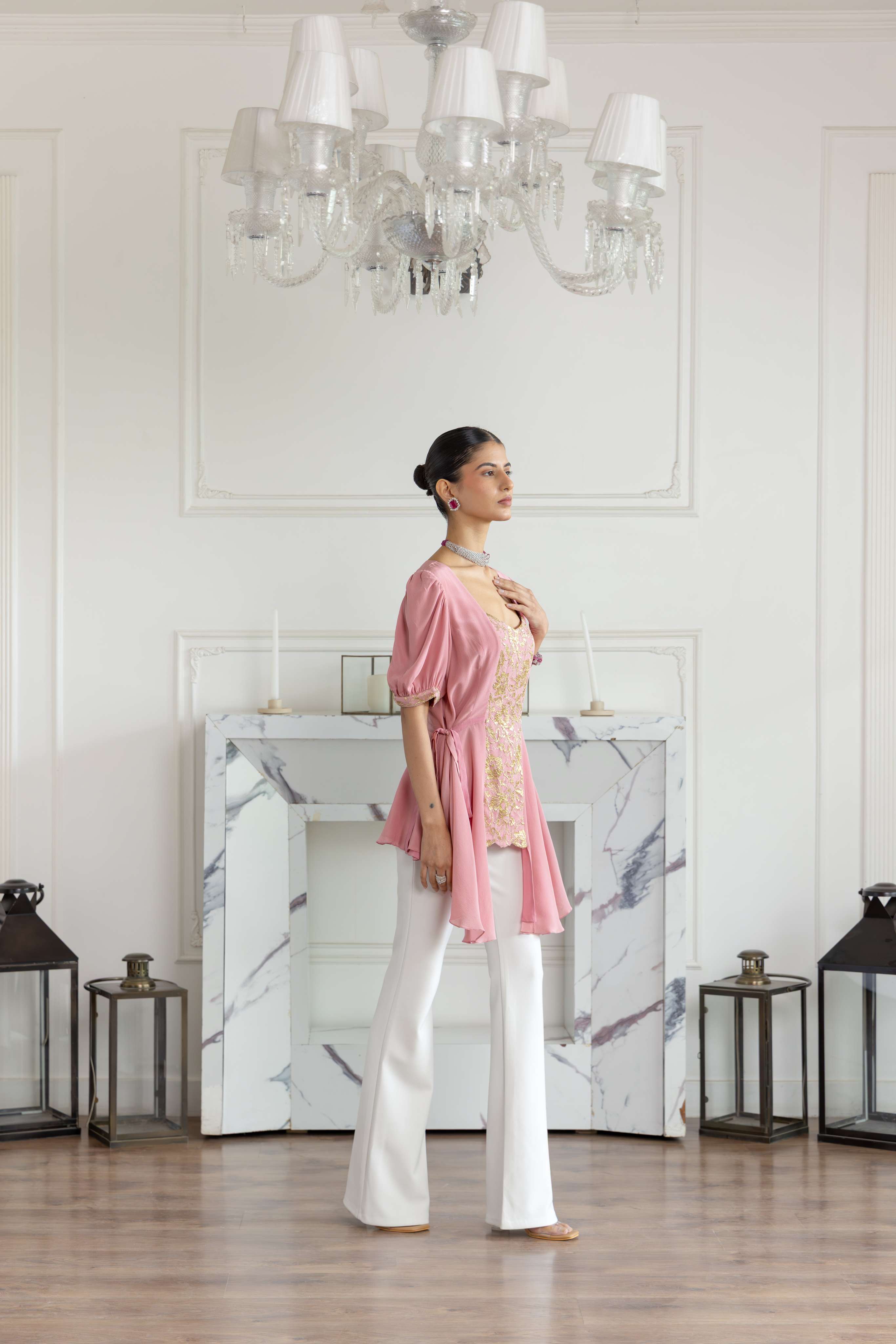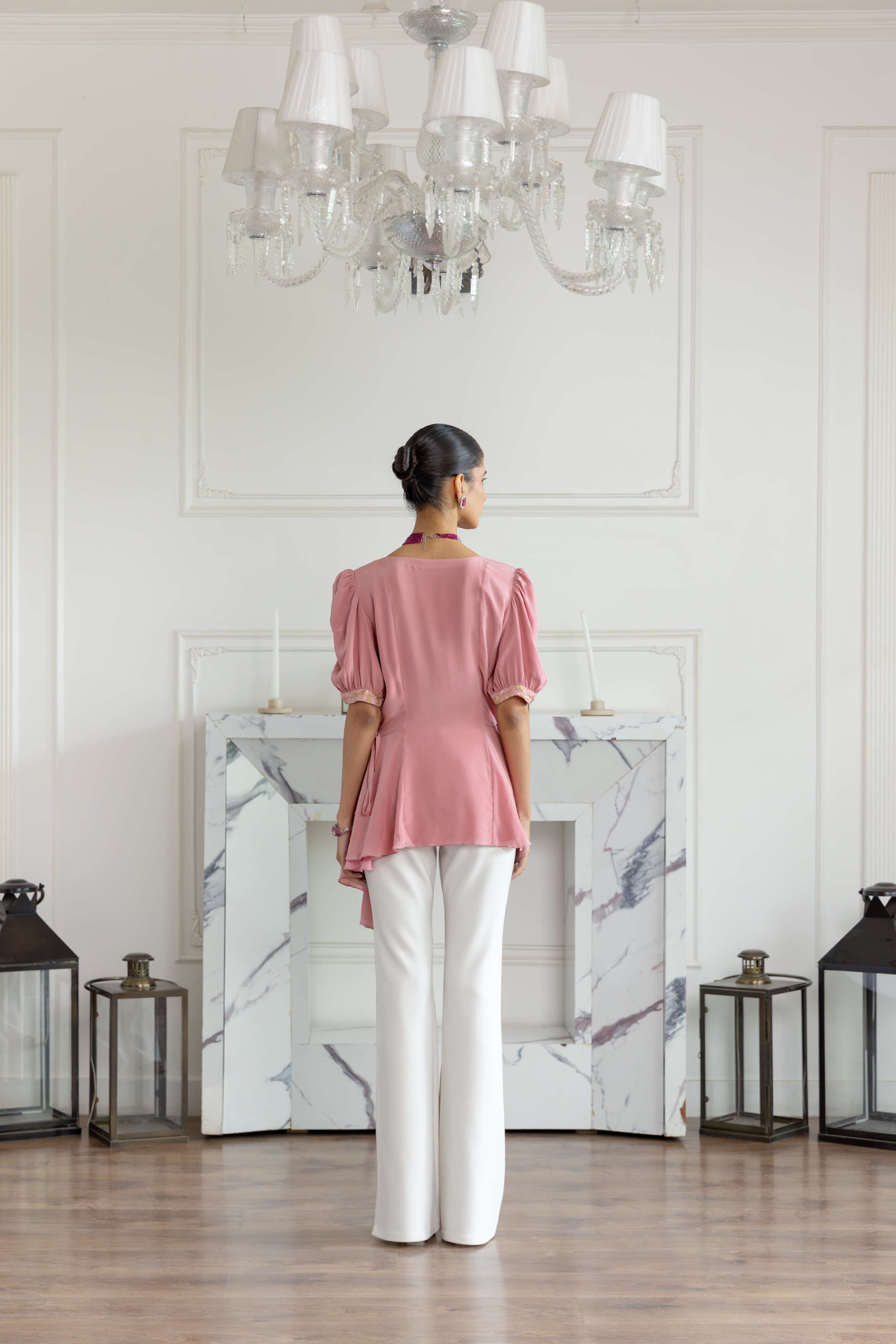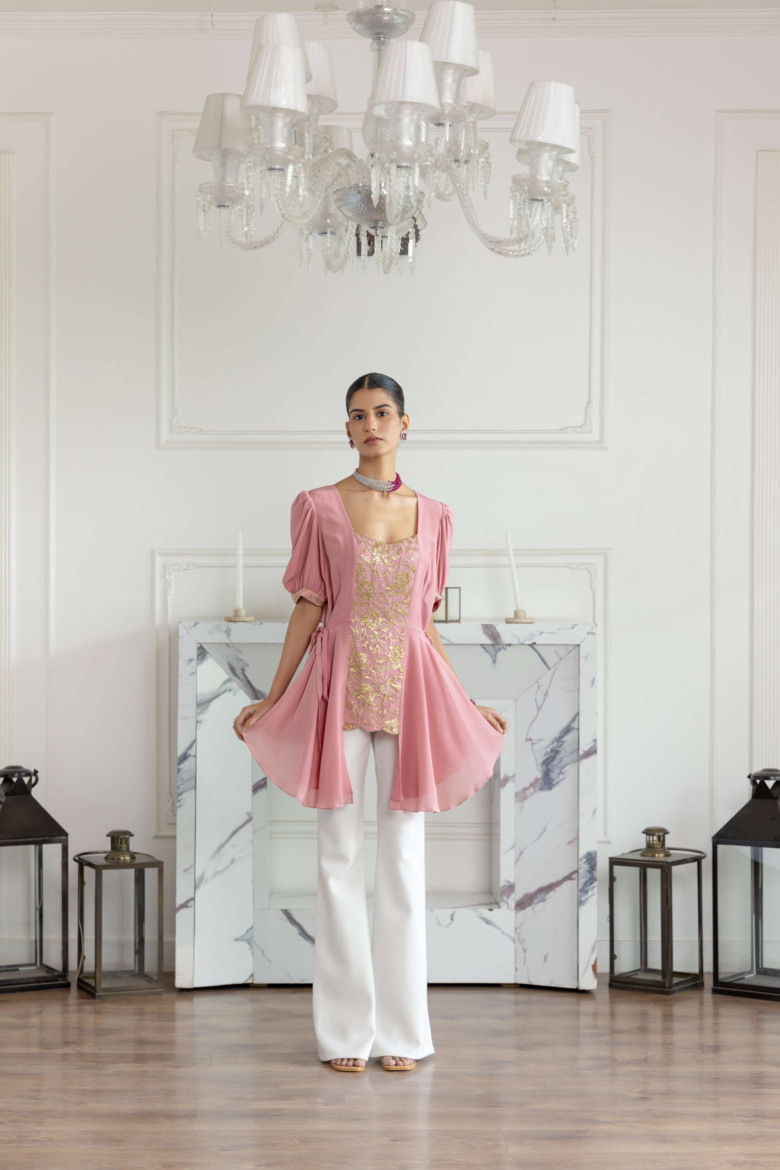 Pink Crepe Silk top with metallic Gold French lace panels, puffed sleeves, and delicate bow ties details for a graceful and feminine finish.