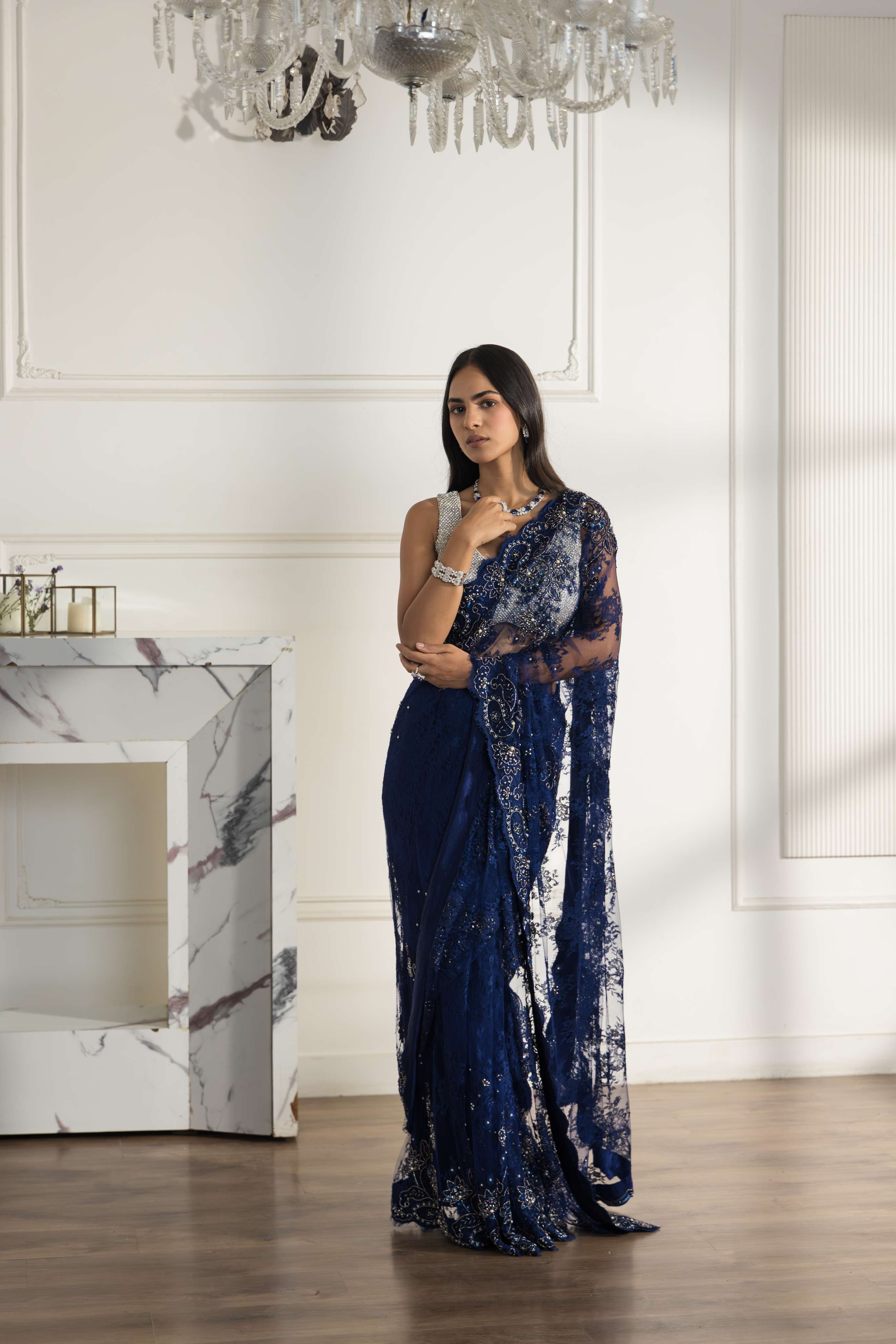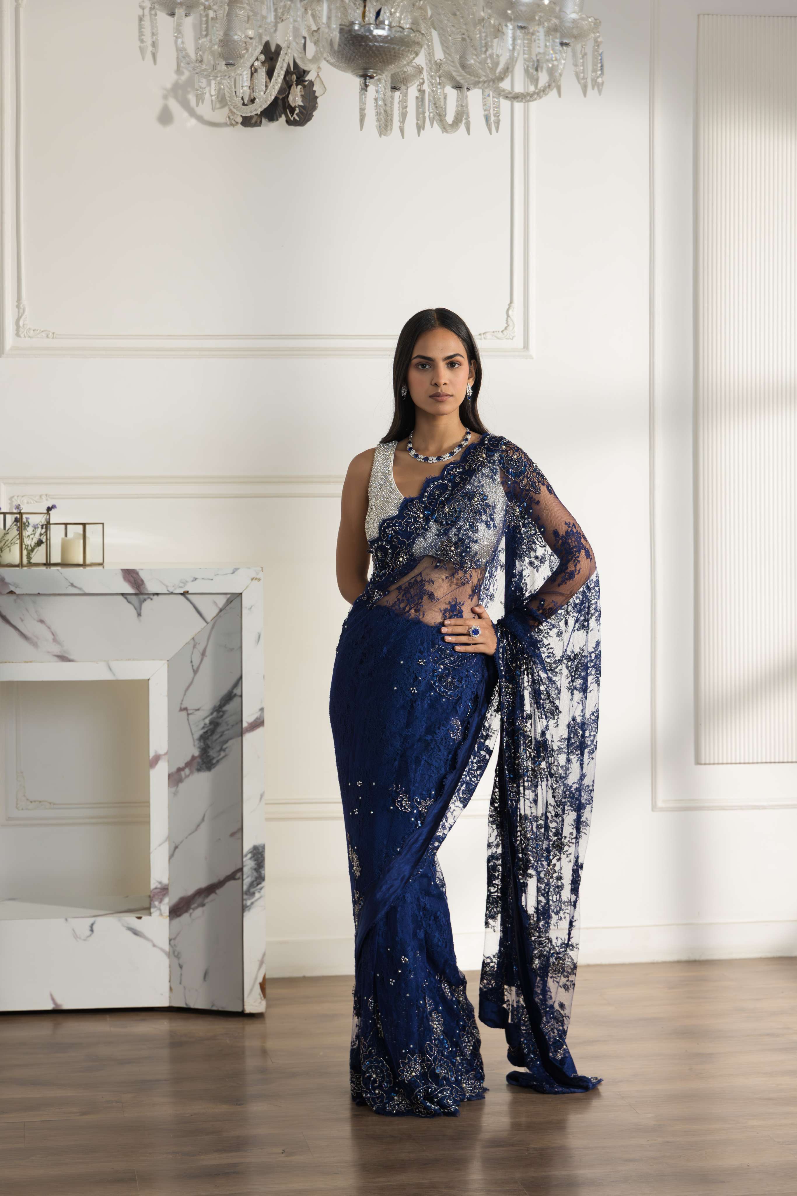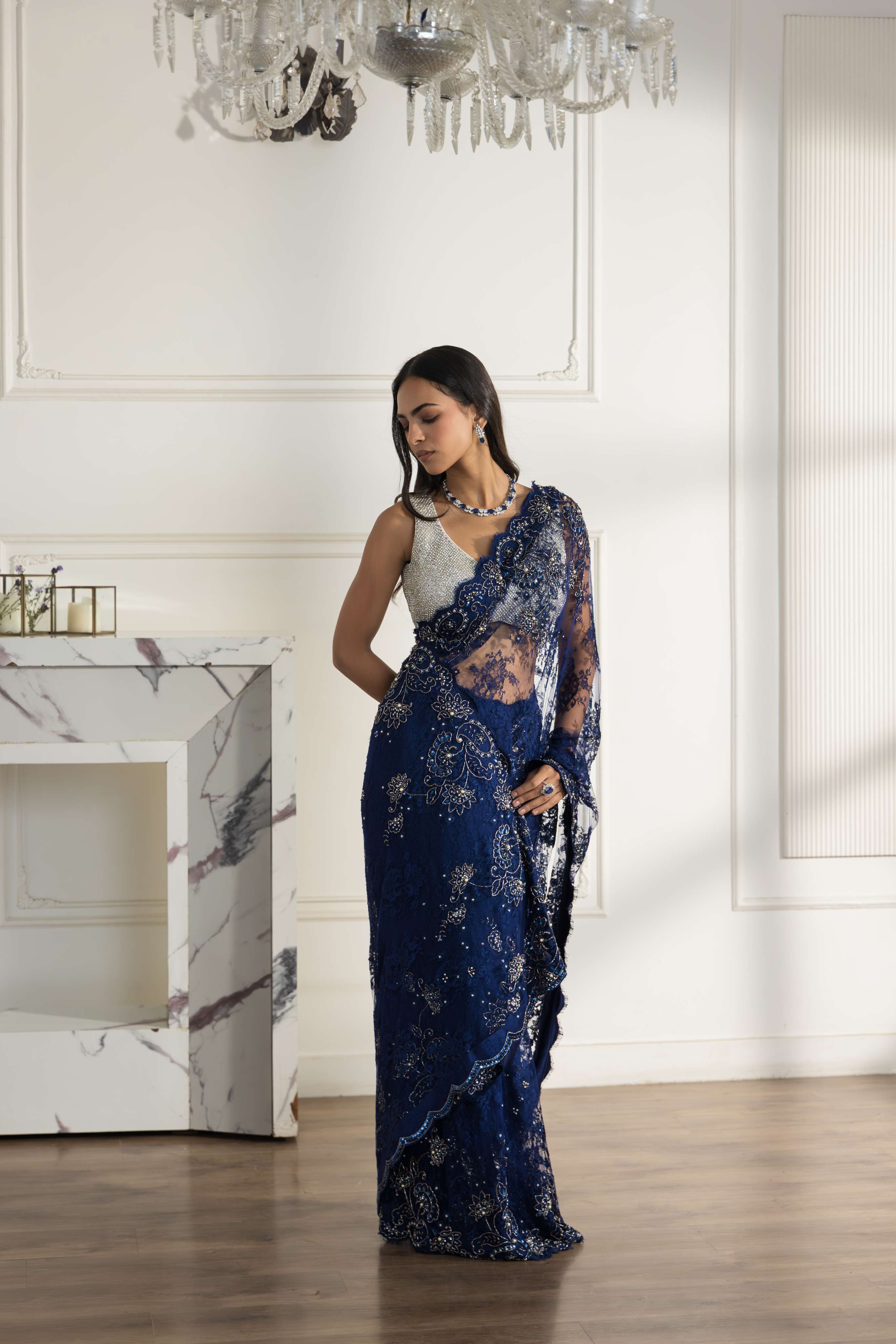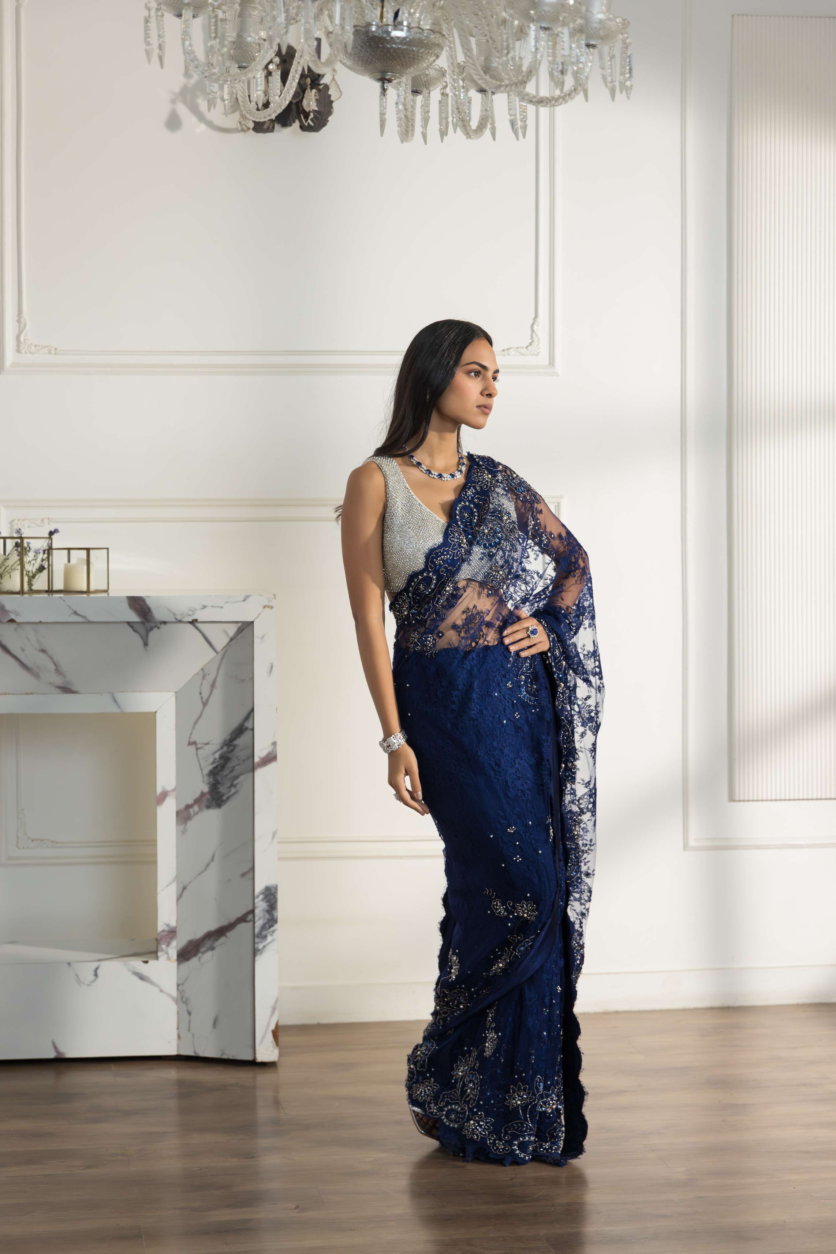 Crafted in authentic Chantilly Lace, this Navy Blue saree is a refined showcase of heritage craftsmanship. Its certified Dentelle de Calais-Caudry French lace is adorned with 250 hours of intricate hand embroidery, featuring floral highlights that extend across the heavy border and falls, creating depth and richness in every detail. Accompanying the saree are matching blouse and petticoat fabrics in Satin Silk for a perfectly coordinated ensemble. A piece that blends artistry and tradition, this saree is designed for weddings and special occasions where statement luxury is desired.