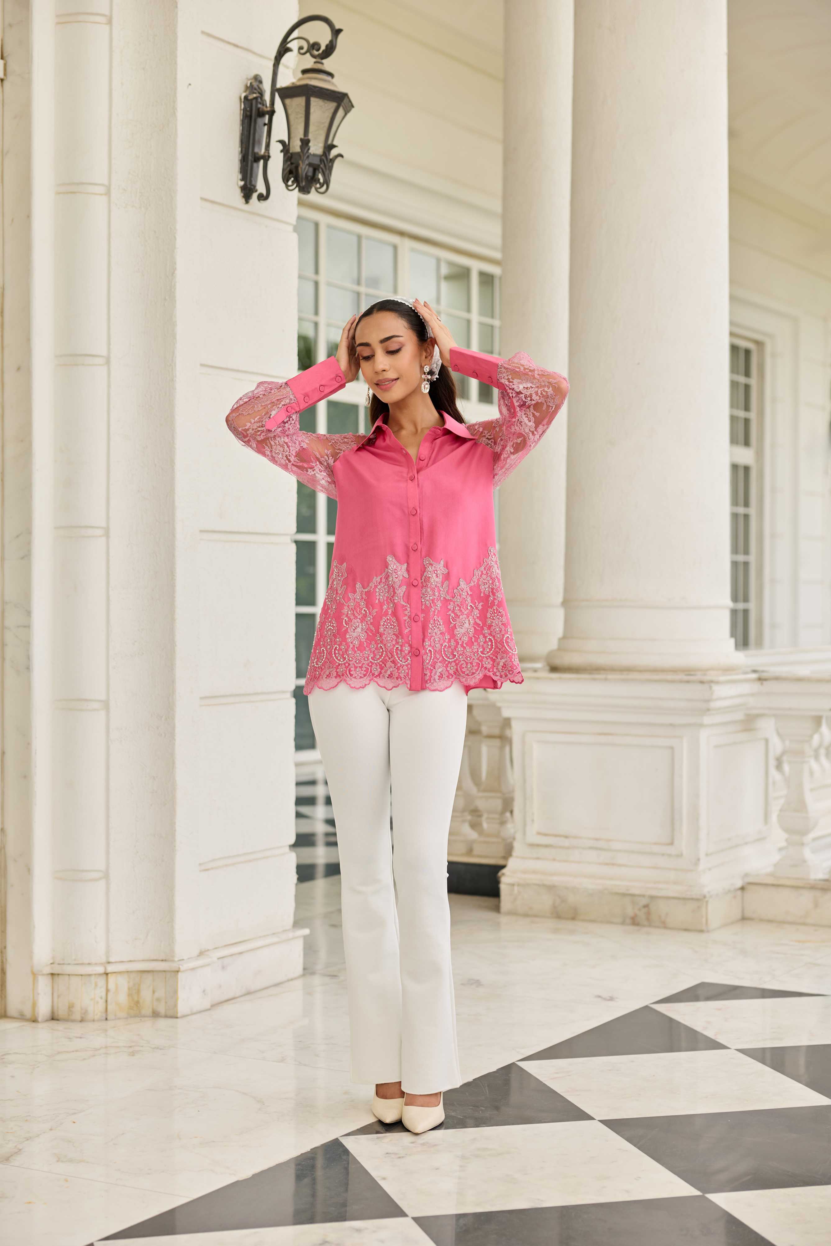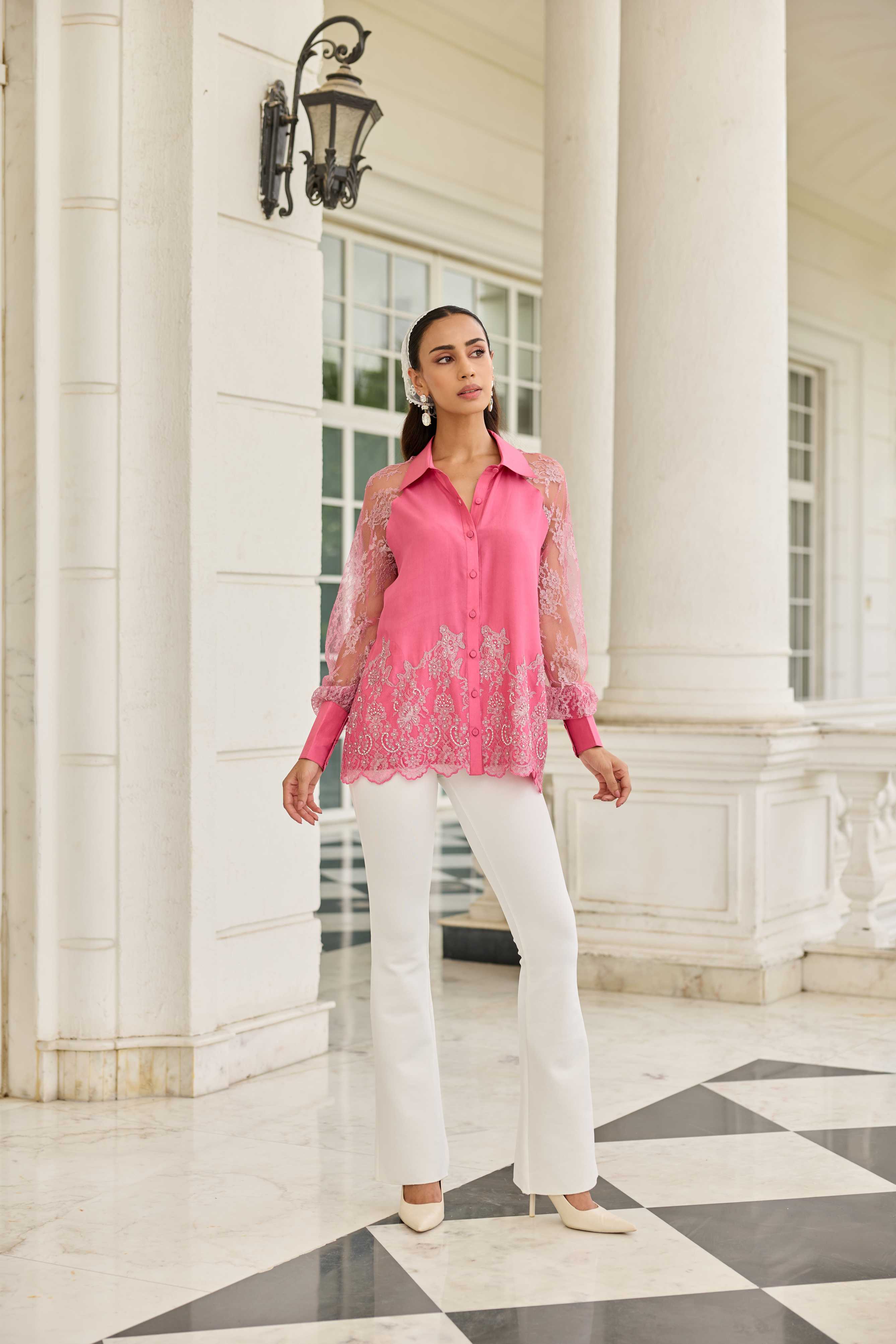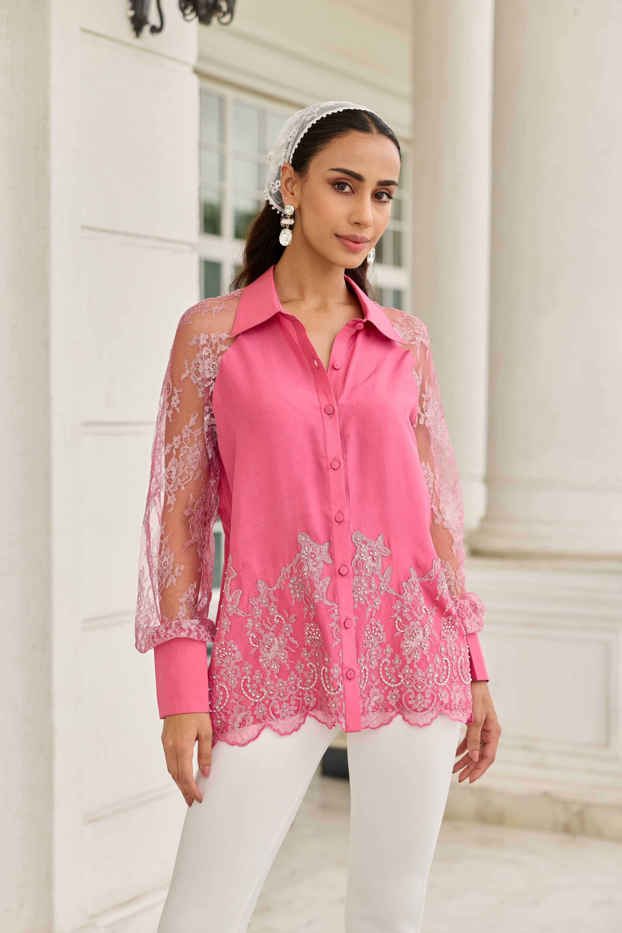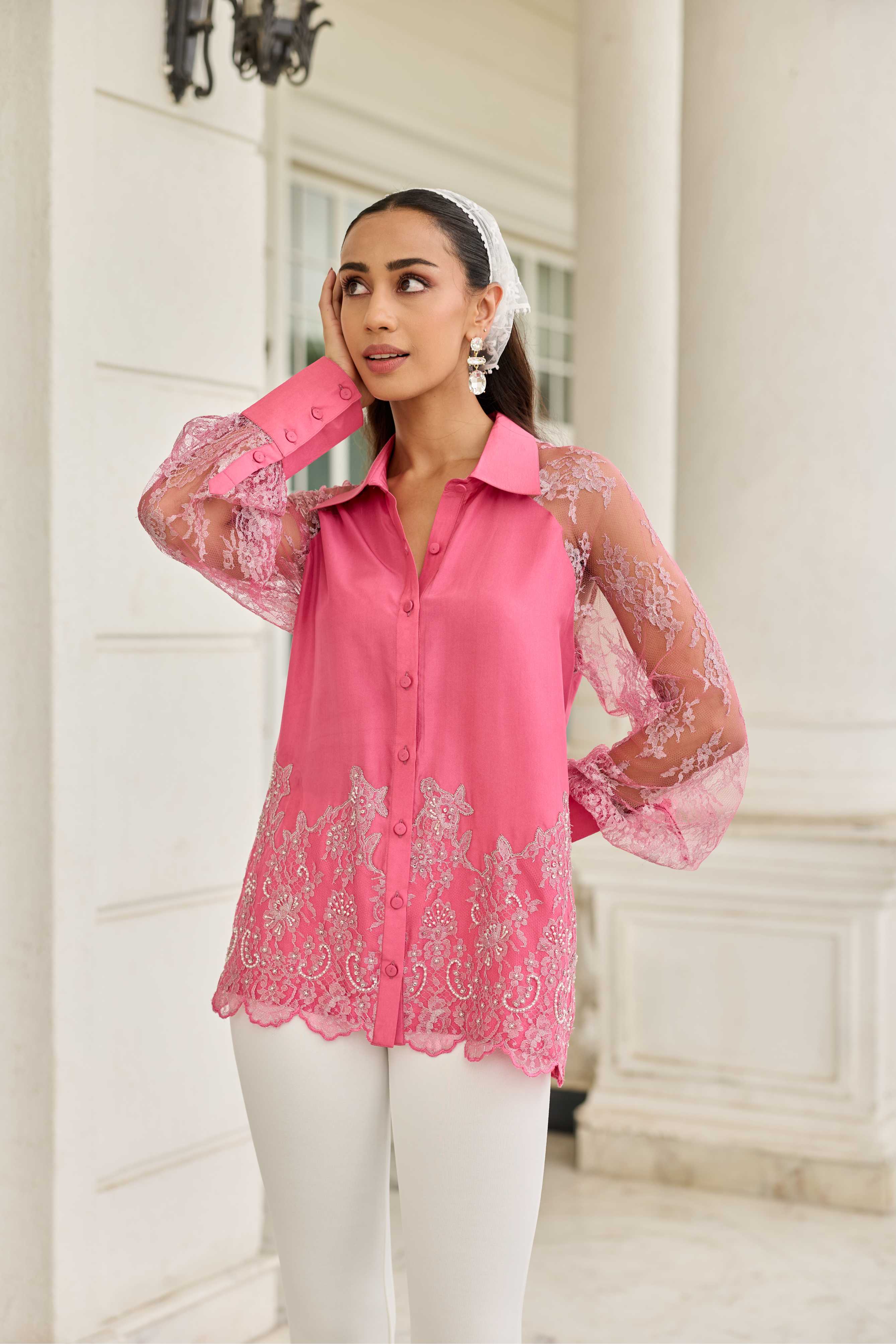 Made from 100% pure Habotai Silk in a vibrant Fuchsia Pink, this relaxed-fit shirt is adorned with certified French lace by Dentelle de Calais-Caudry® along the hem. Each lace panel is enriched with shimmering cutdana and bead embellishments, hand-finished over 20 hours. Voluminous bishop sleeves in sheer lace and a refined halter neckline add modern elegance, making it perfect for soirées or statement daywear.