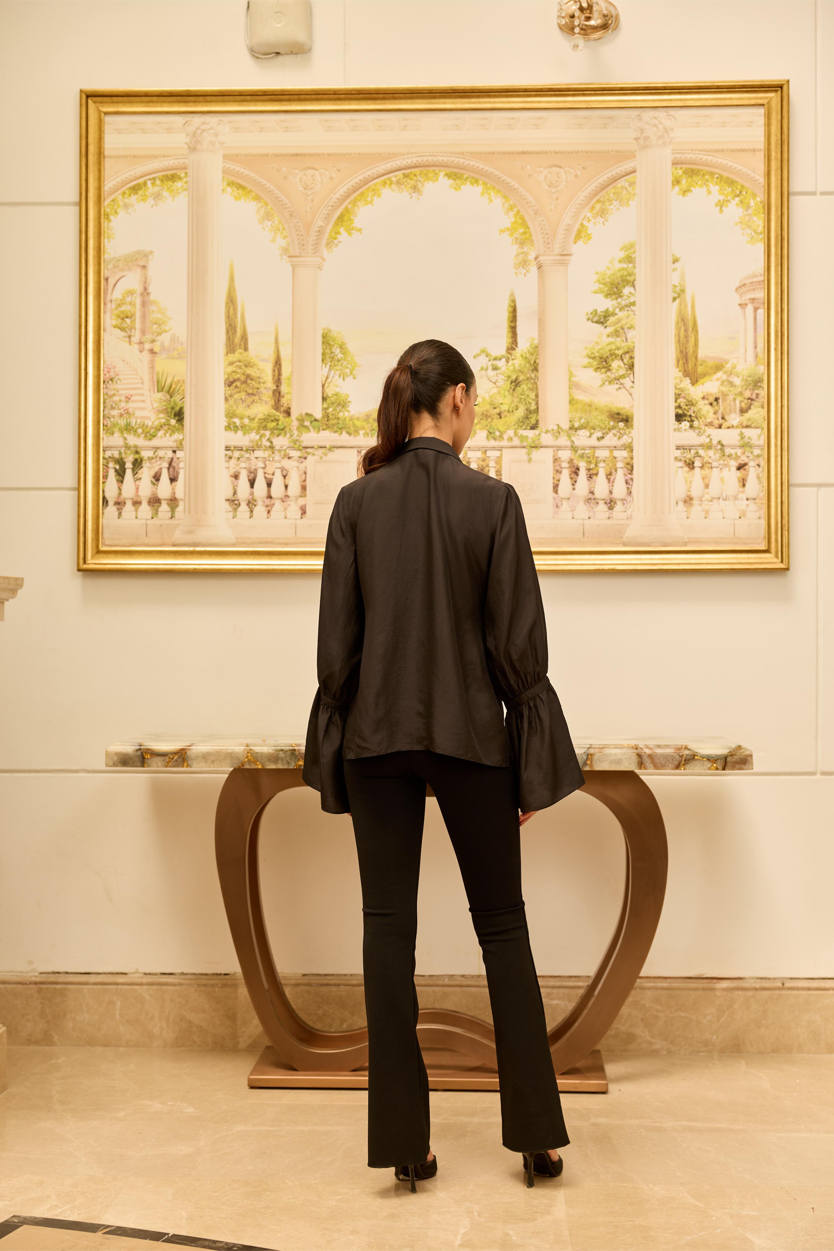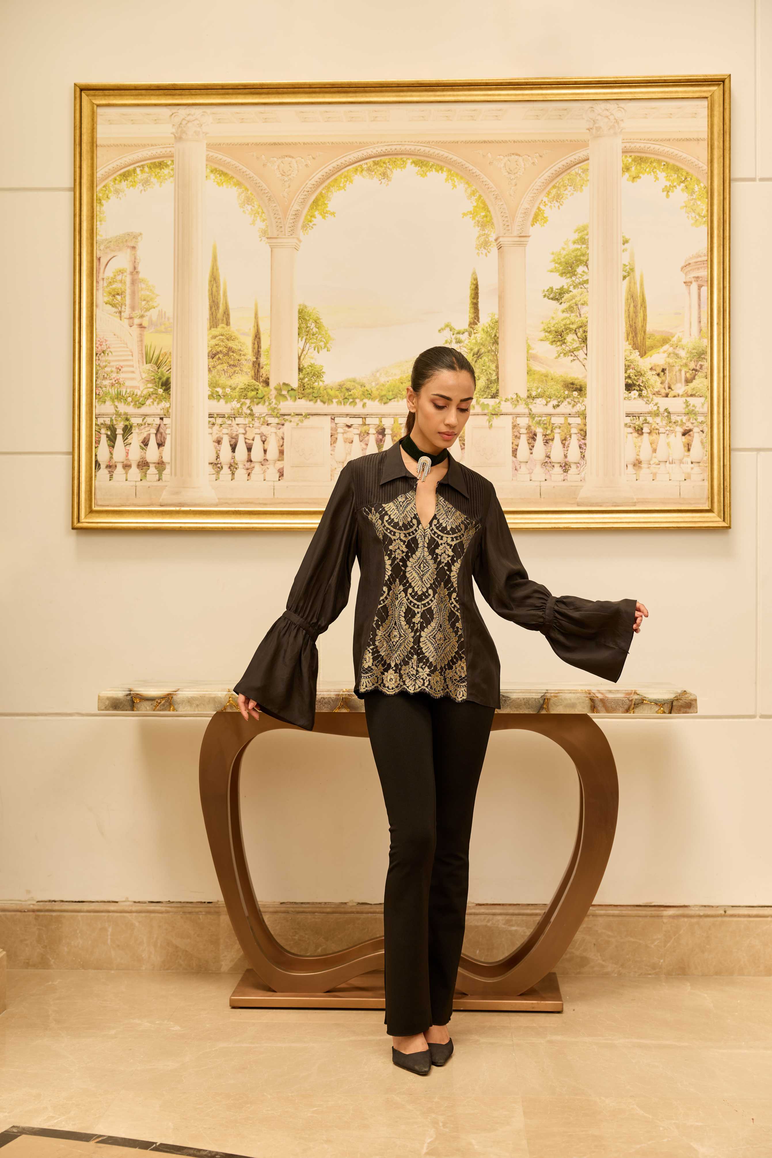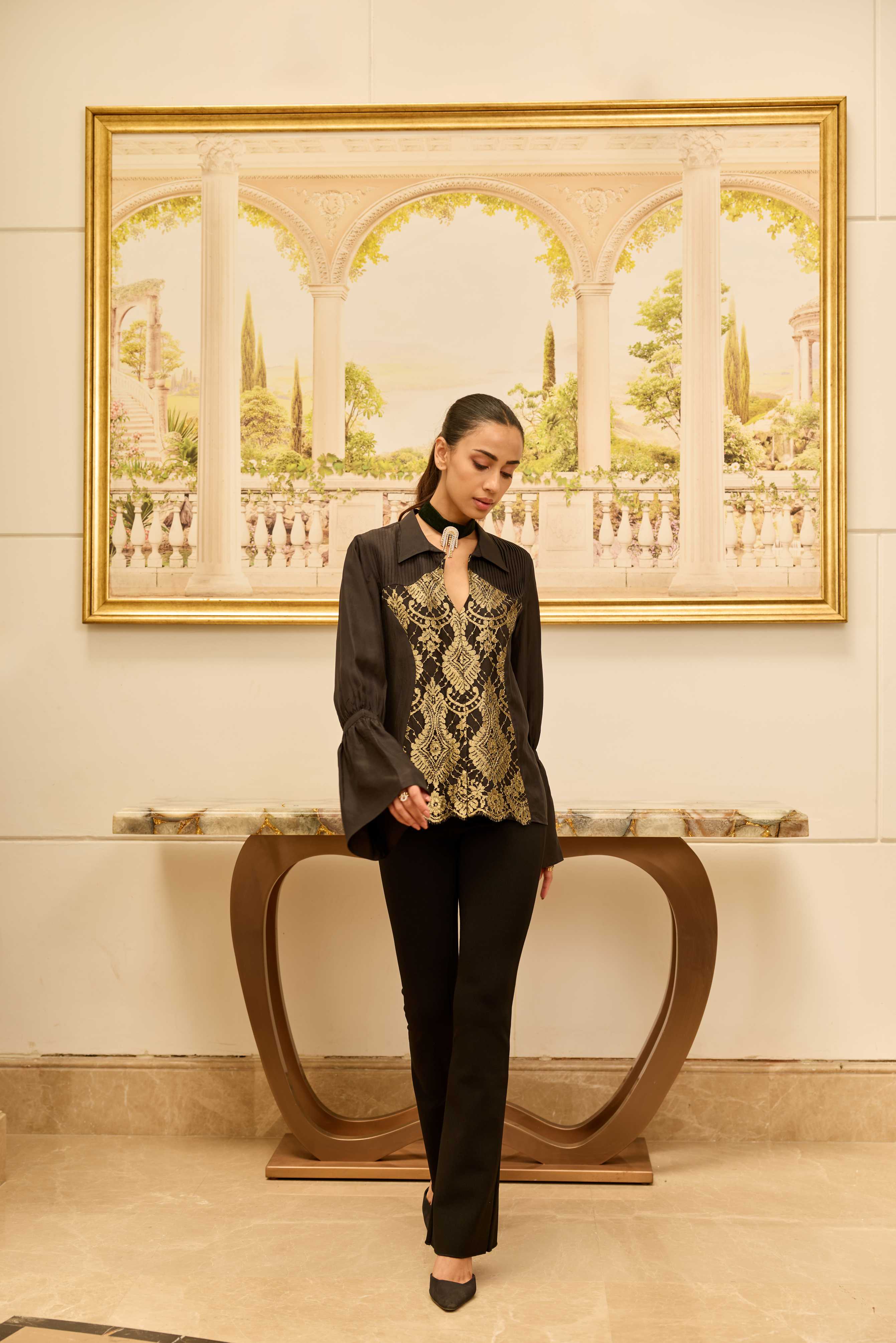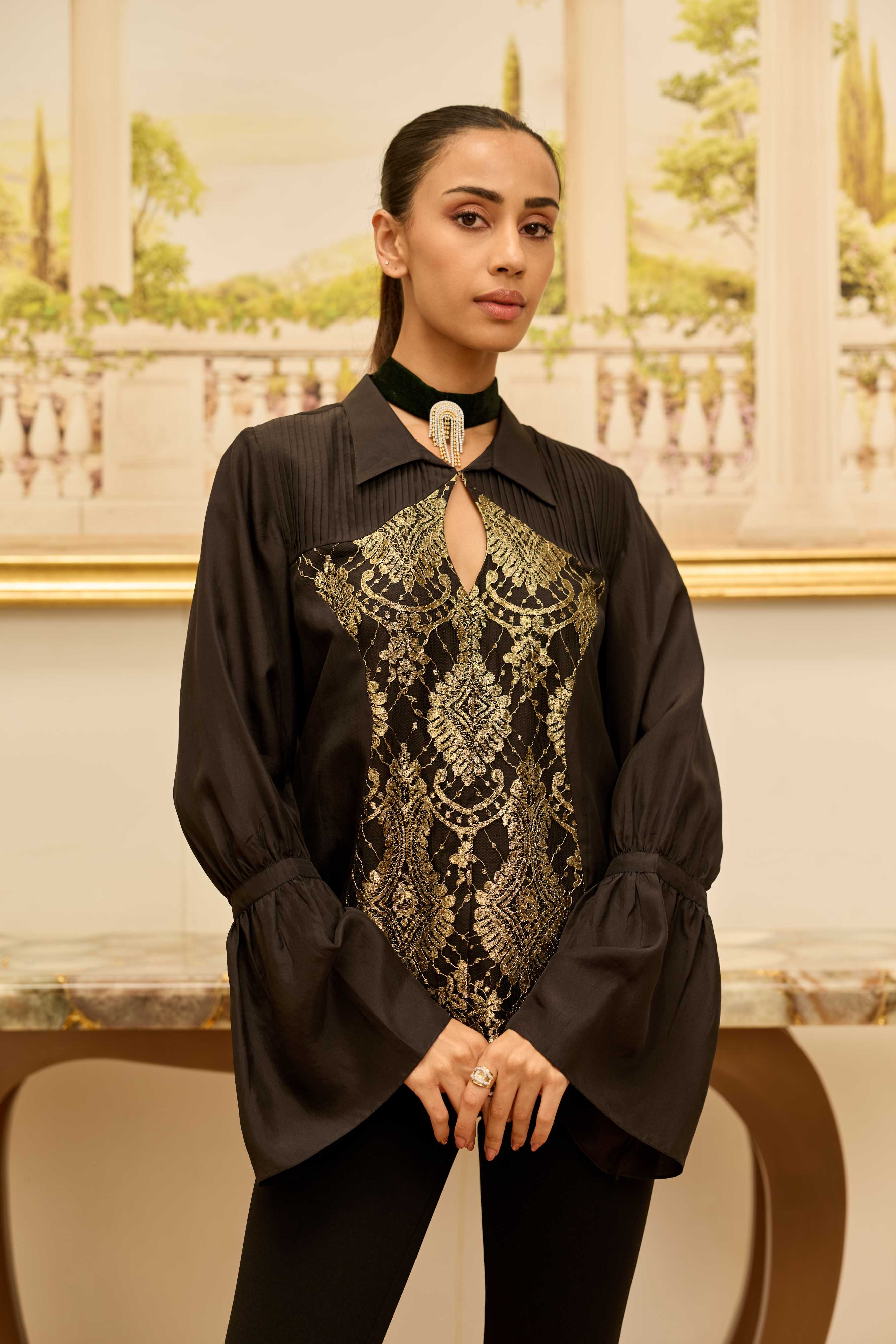 Crafted in 100% pure Habotai Silk, this striking Black top features an intricately detailed front panel of French lace certified by Dentelle de Calais-Caudry®. The upper bodice is enhanced with fine pleating, while voluminous puffed sleeves extend into a graceful flare. A defined waist and structured shoulders balance the flowy silhouette, with a sharp shirt collar and paneled top lending a tailored edge. This is a stunning choice for lavish dinners, soirées and gatherings.