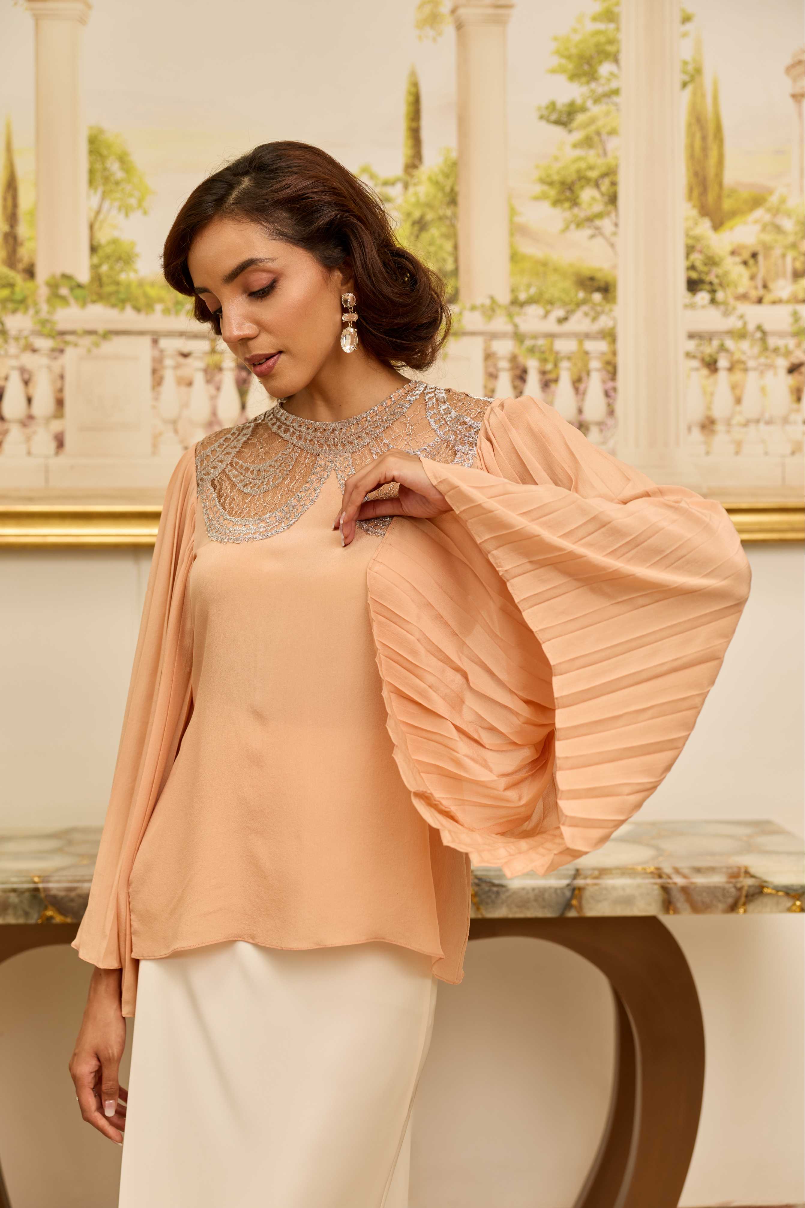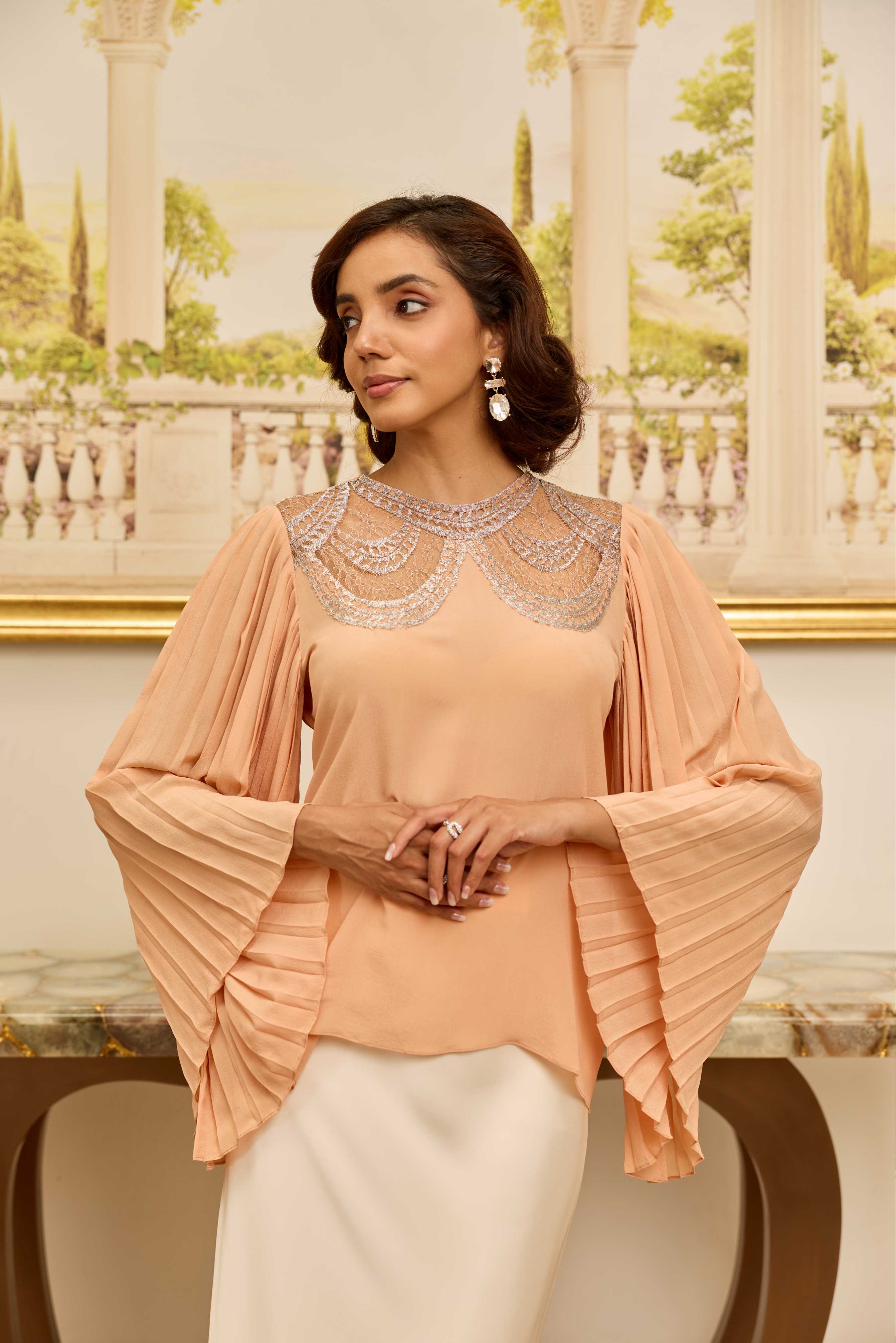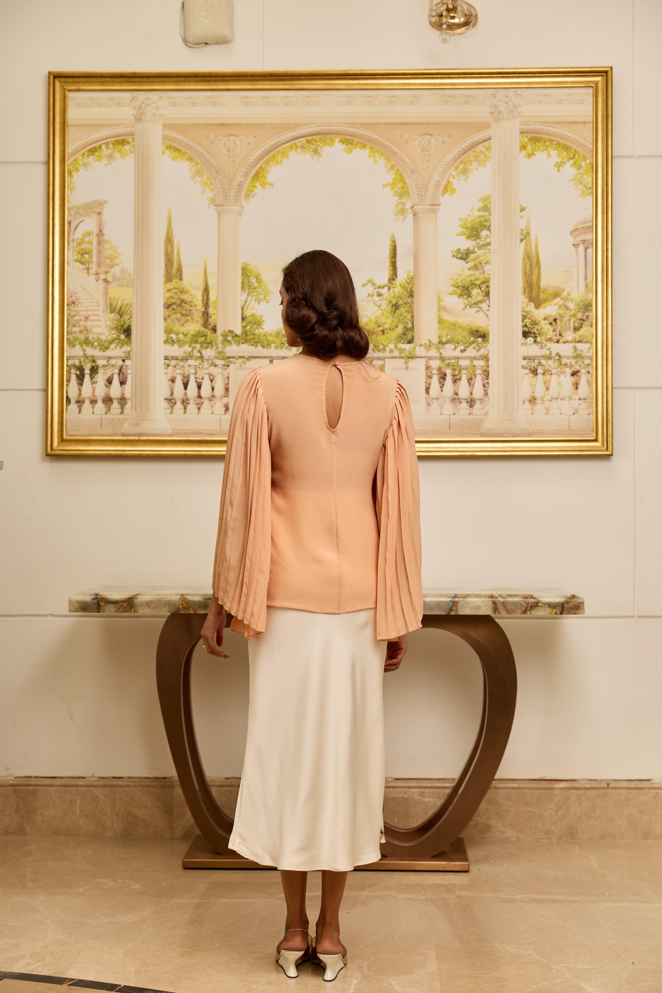 A peach top in 100% crepe, featuring a refined lace yoke and softly pleated sleeves—graceful, structured, and effortlessly elegant.