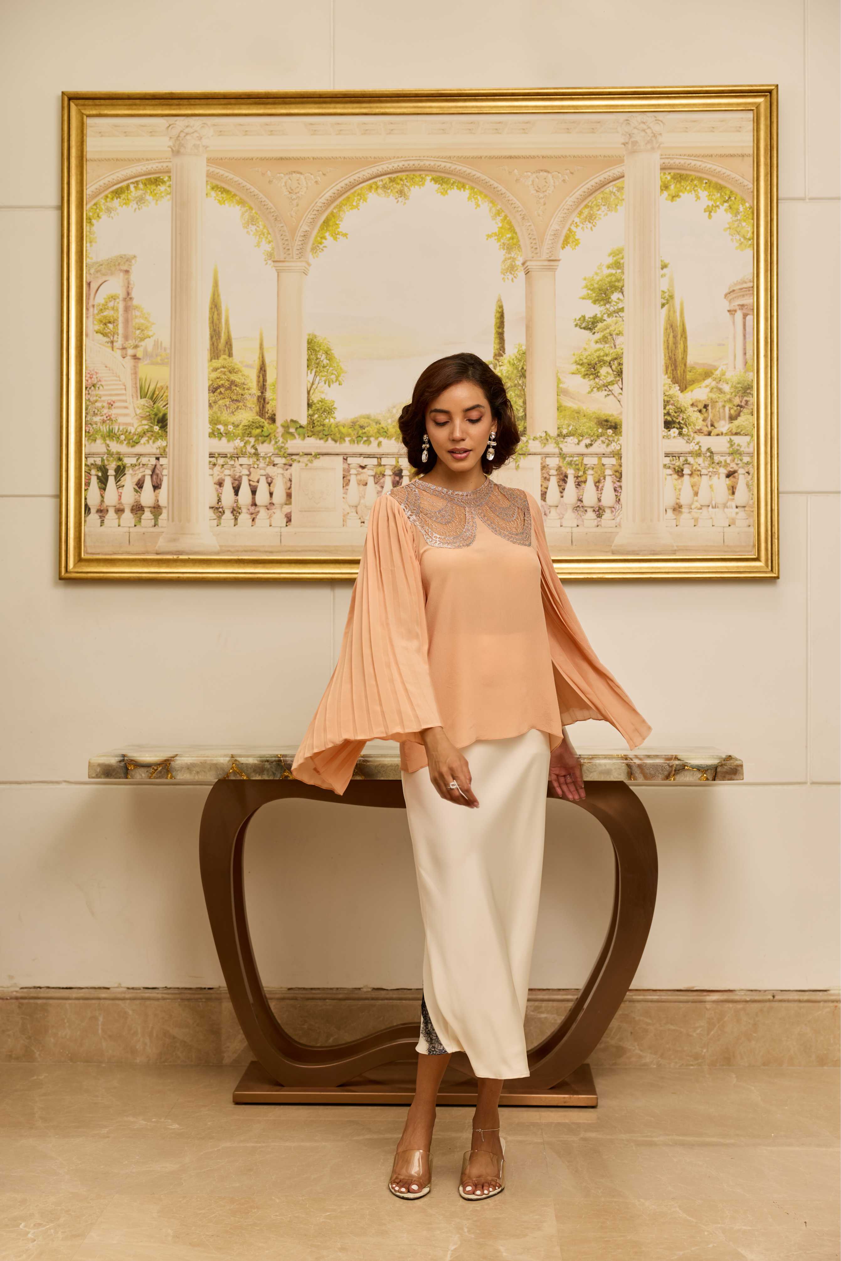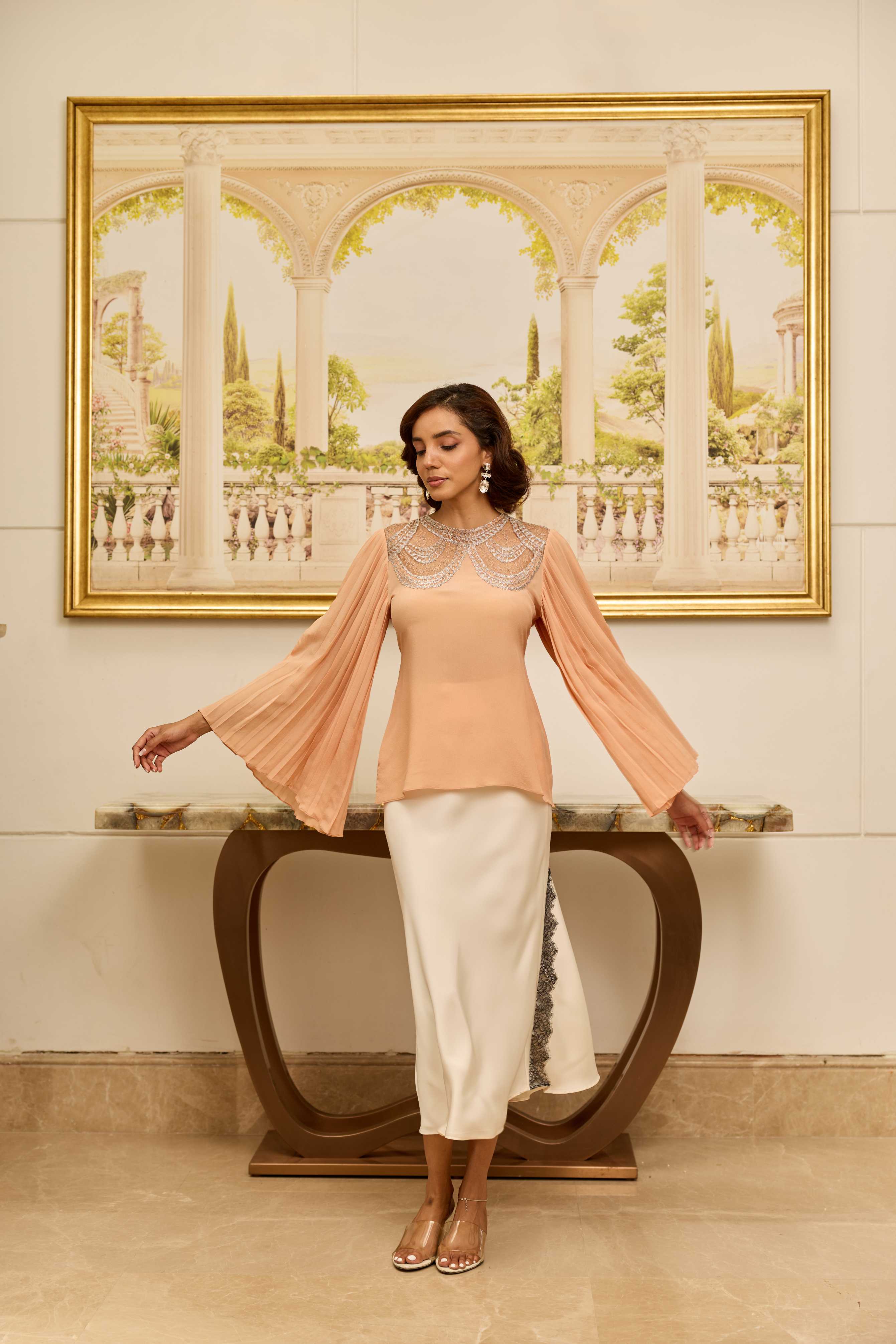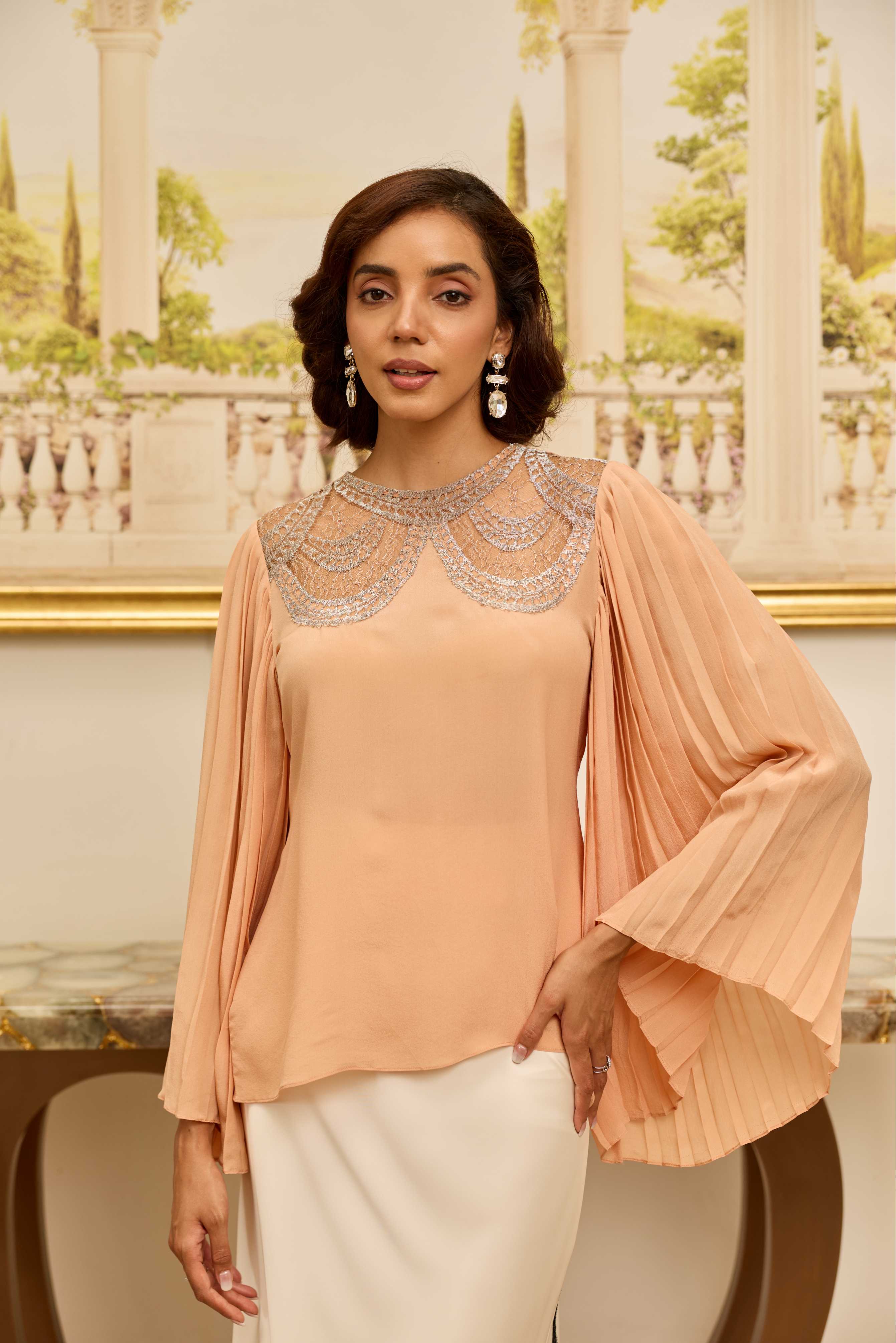 A peach top in 100% crepe, featuring a refined lace yoke and softly pleated sleeves—graceful, structured, and effortlessly elegant.