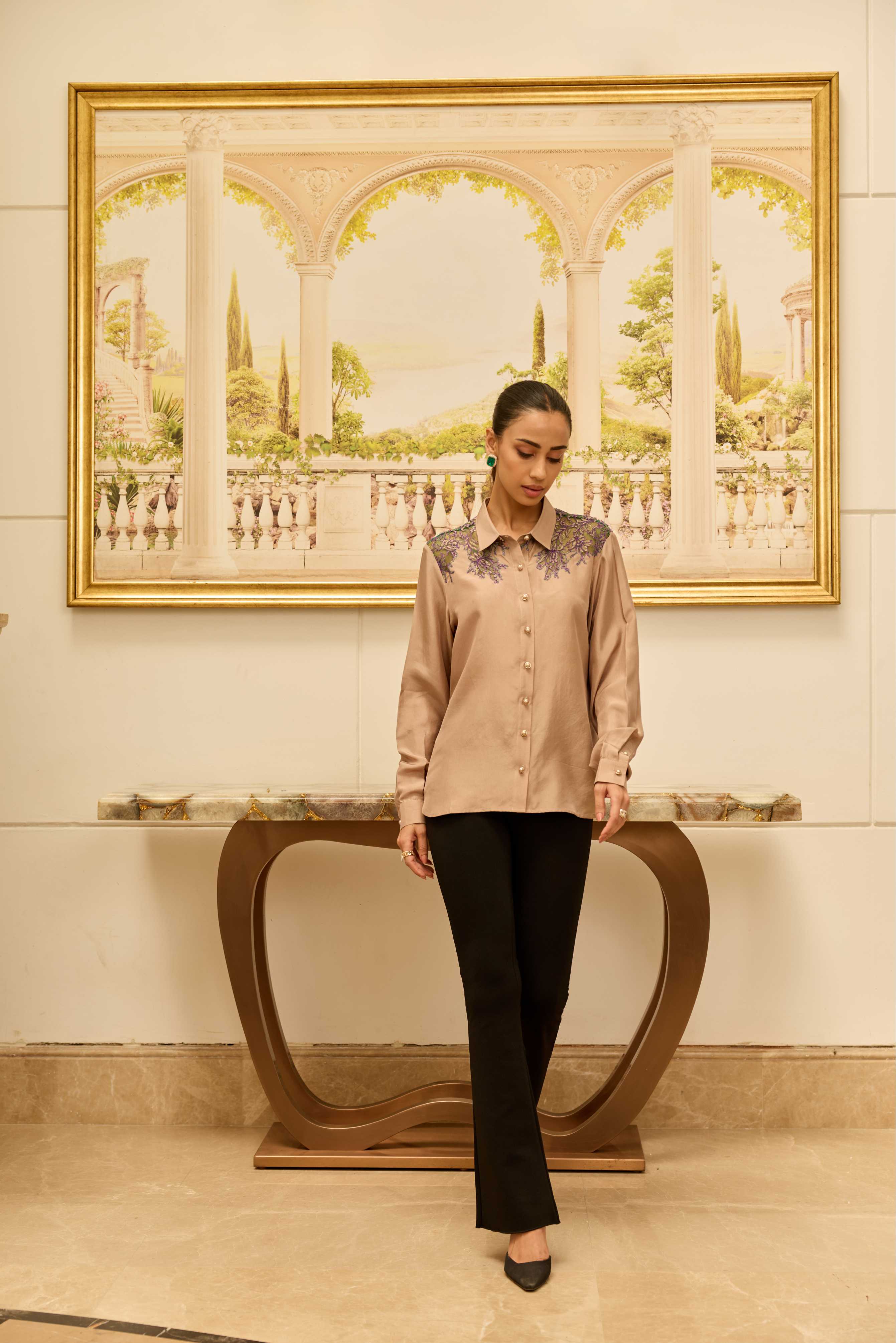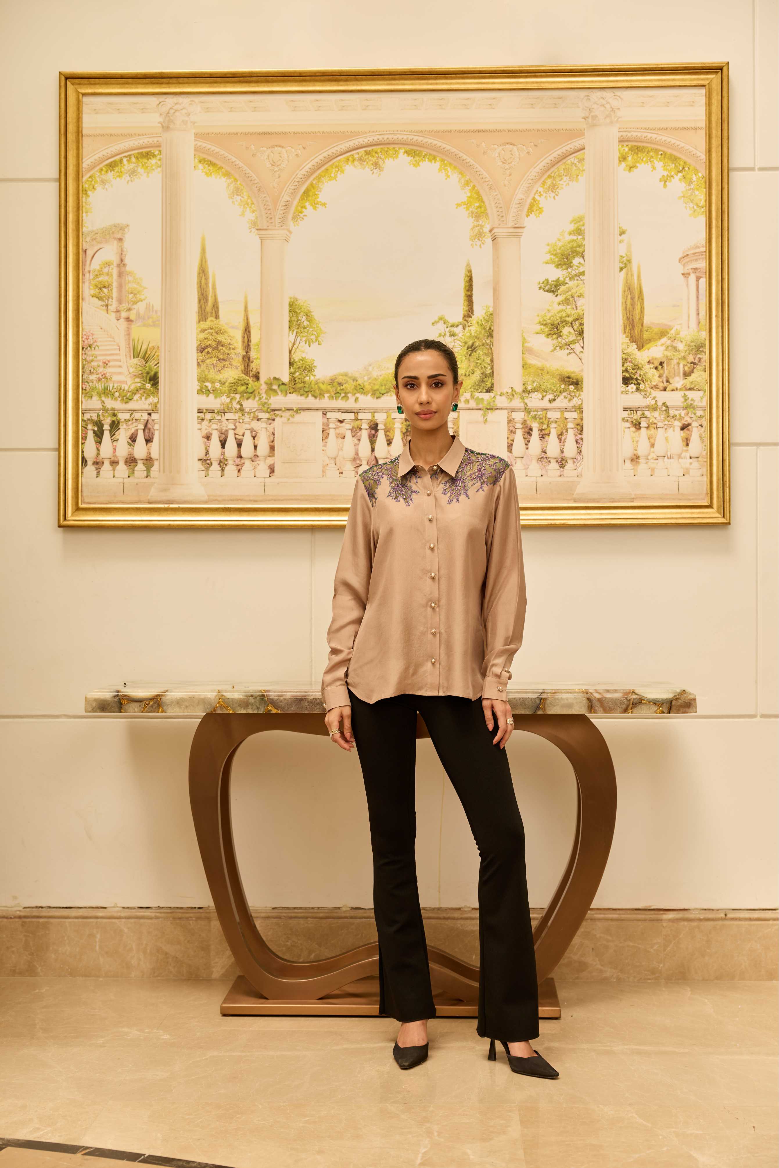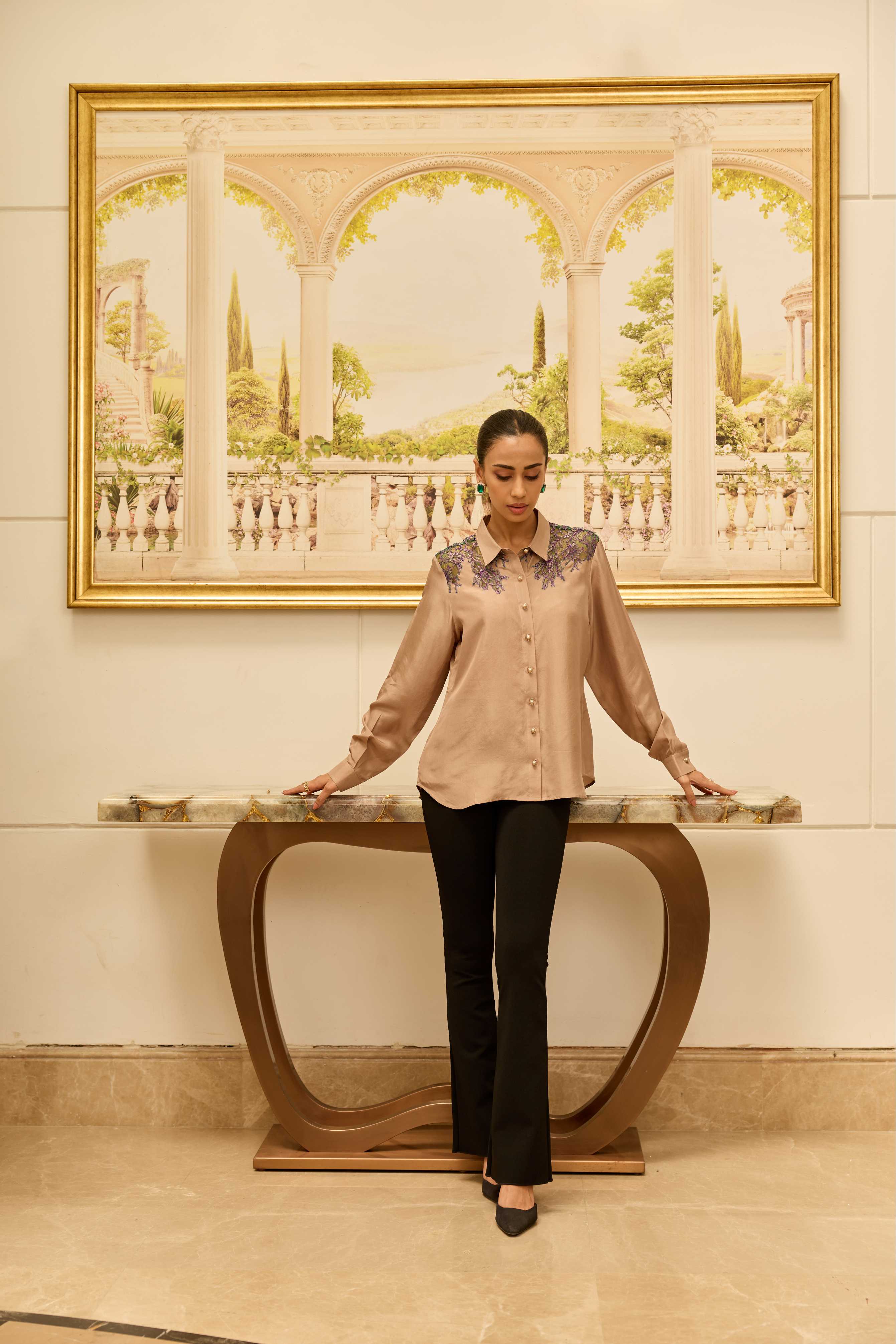 In 100% pure Habotai Silk, this Gold Fondant shirt features intricate hand-embroidered French lace certified by Dentelle de Calais-Caudry® along the shoulders and back yoke, adding rich texture and depth to its clean silhouette. The pairing of dusky gold with green and purple lace creates a regal yet sophisticated look. Finished with a pearl-button front, this piece transitions effortlessly from daywear to dinner.