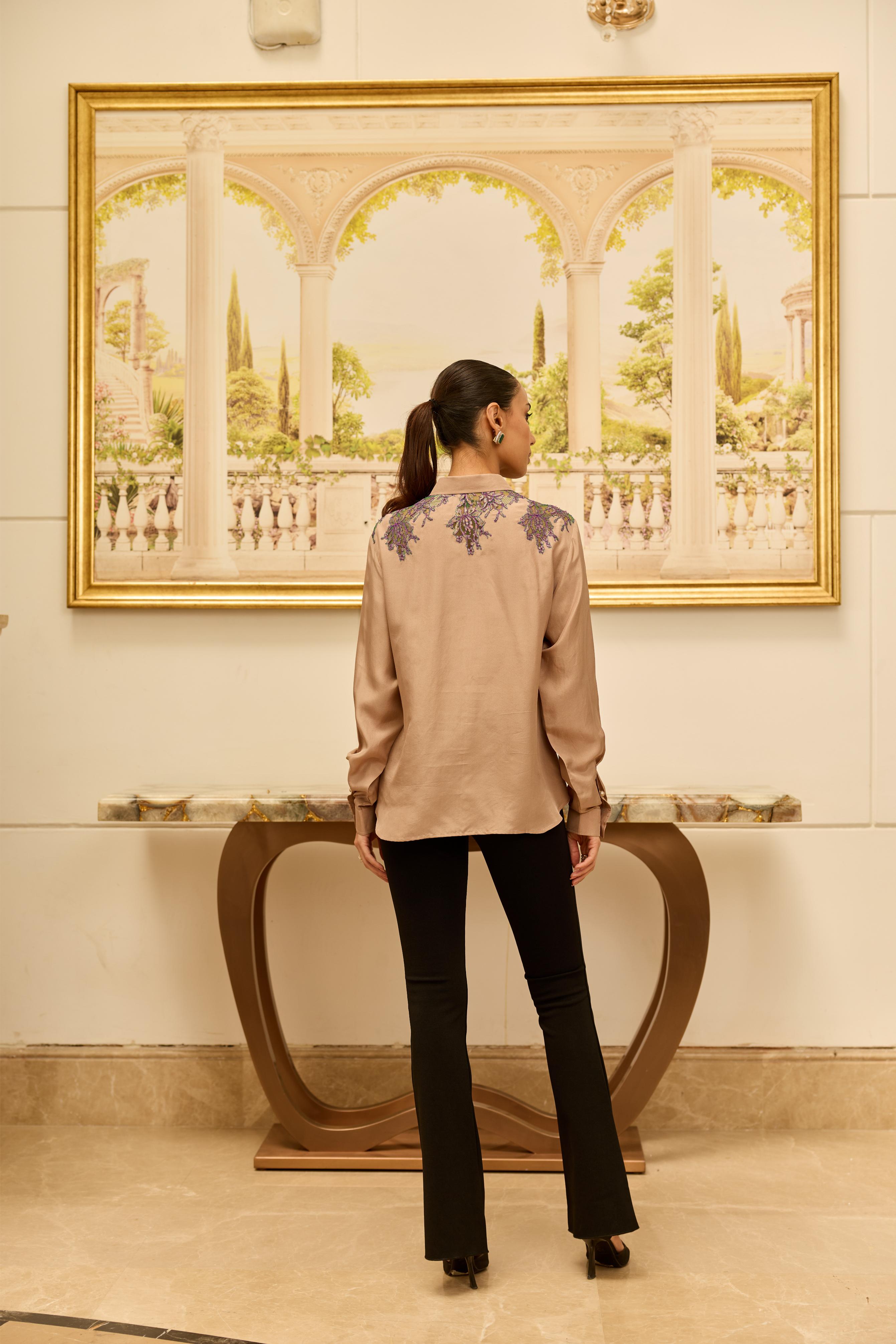 A Gold Fondant 100% pure Habotai Silk shirt elevated with Purple, Green, Gold lace and Bronze pearl-button detailing.