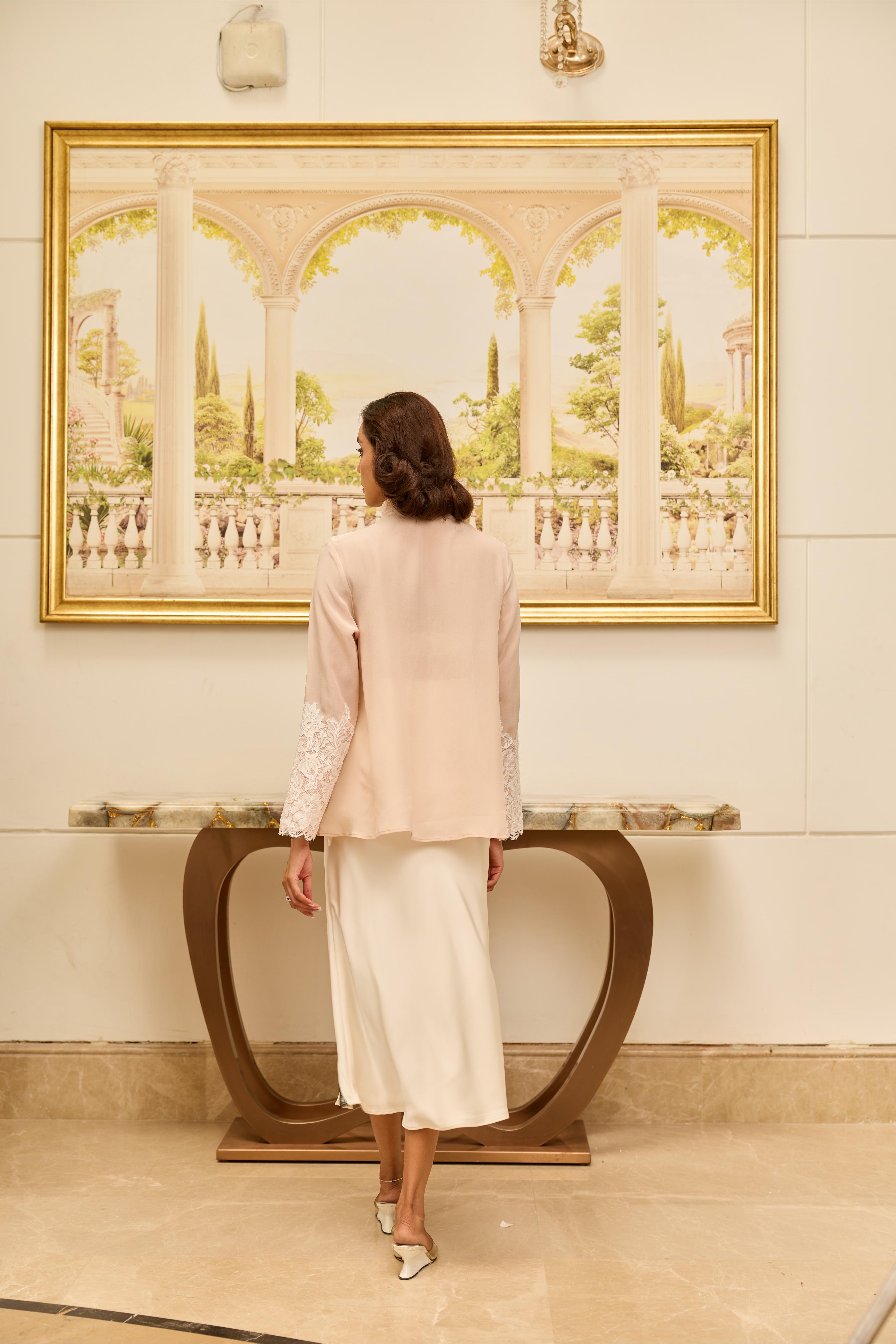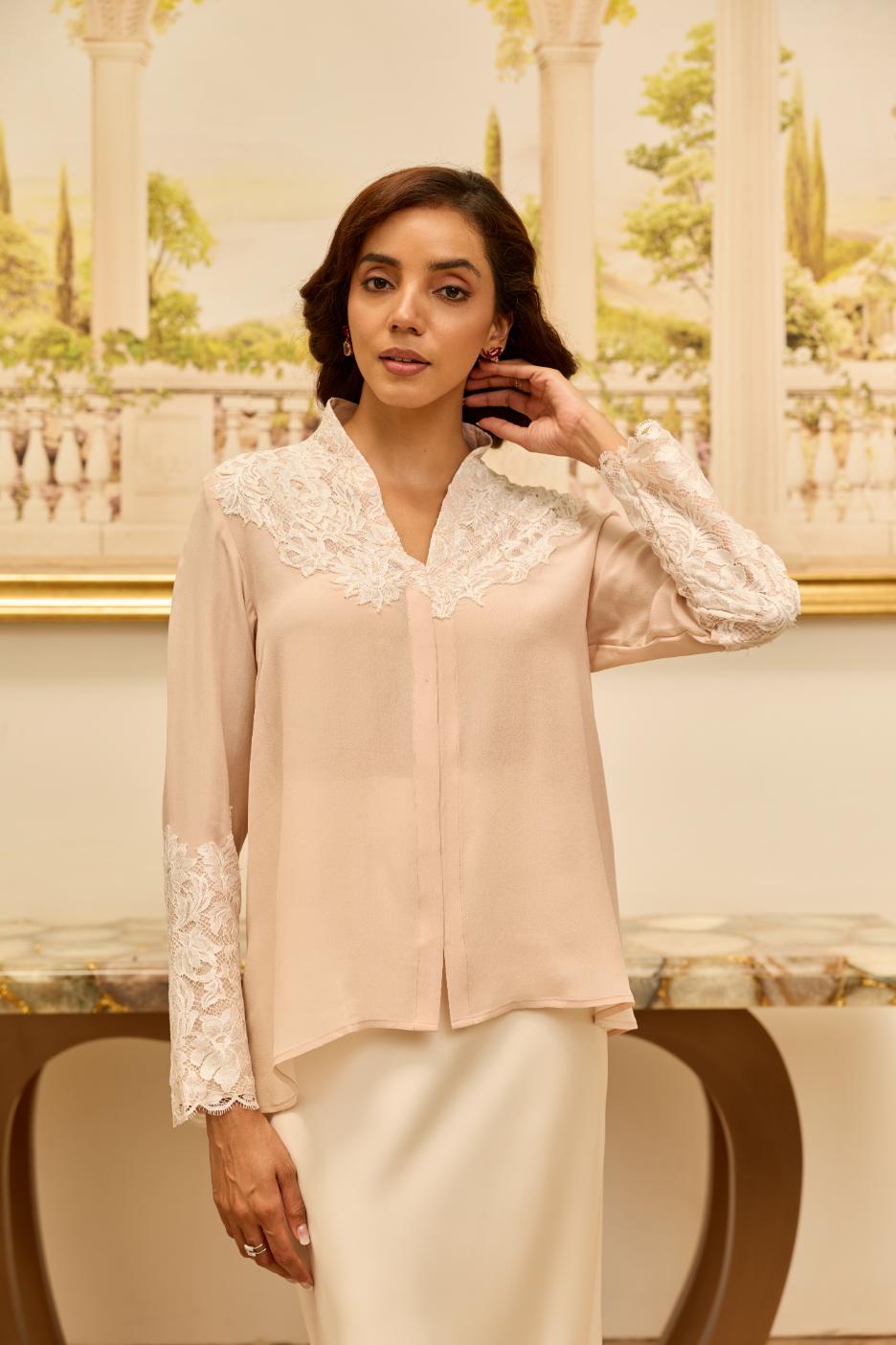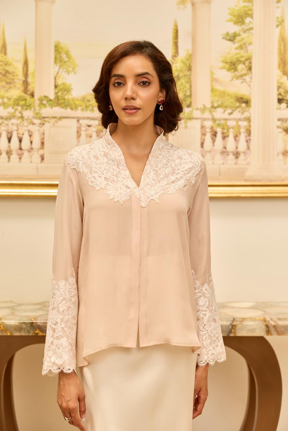 Hand-embellished in 100% pure Crepe, this Misty Rose top features certified French lace by Dentelle de Calais-Caudry® for a touch of refined elegance. The lace at the neckline and full sleeves is enriched with eight hours of intricate work, adding depth and artistry to its flowing silhouette. Finished with a button-down front, it strikes a balance between grace and ease. Perfect for elegant daywear, intimate gatherings, or evening soirées.