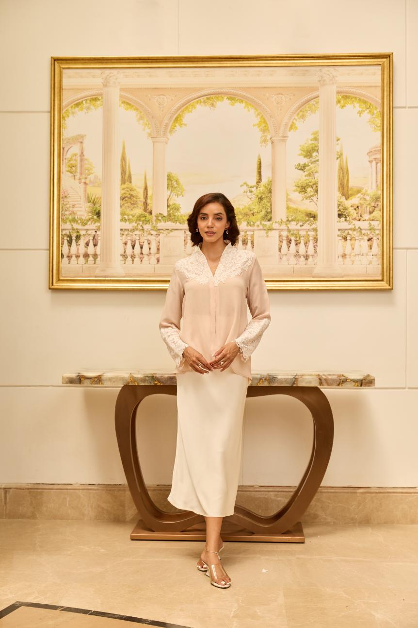 Soft Crepe meets hand-embellished French lace in a relaxed silhouette, exuding quiet elegance.