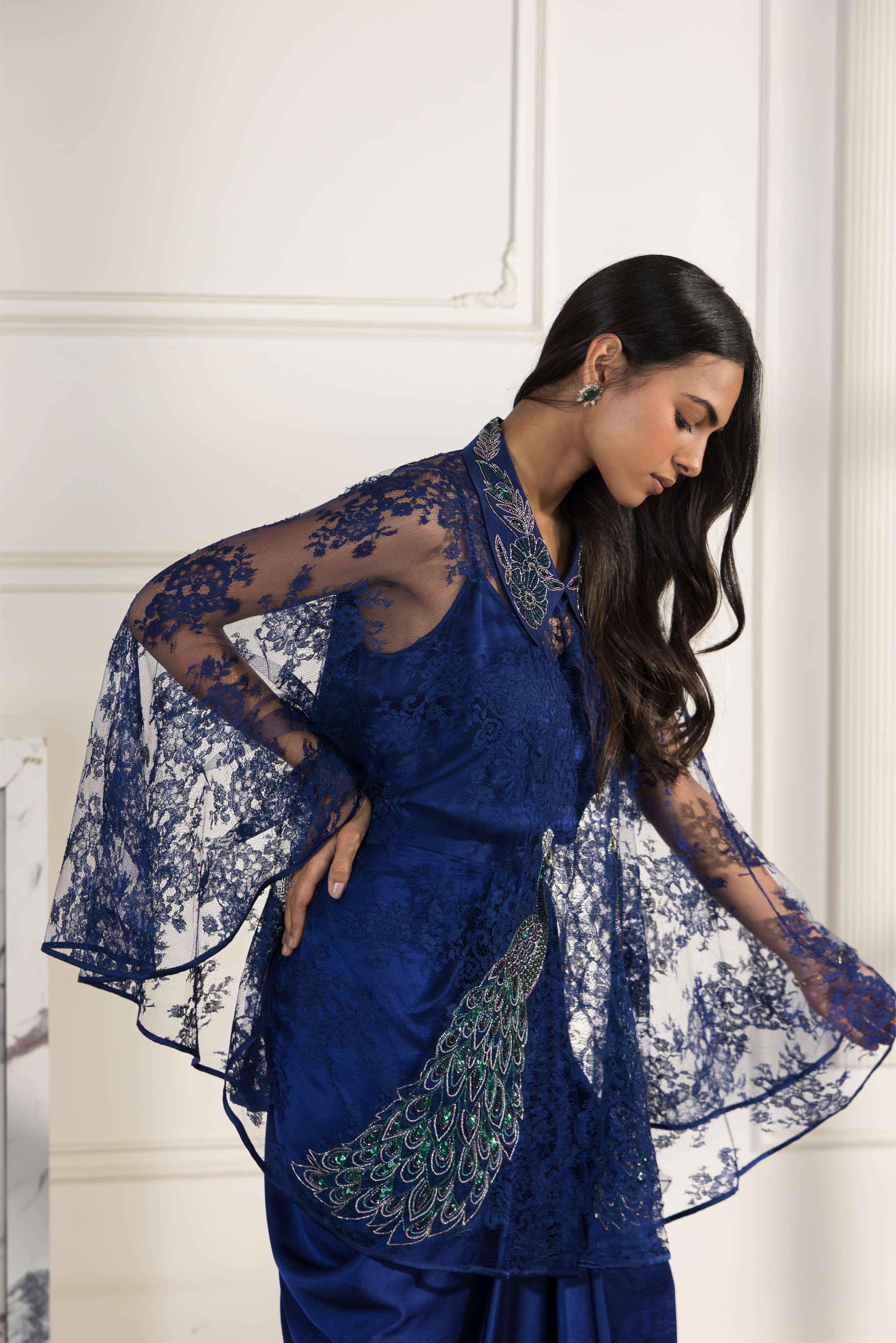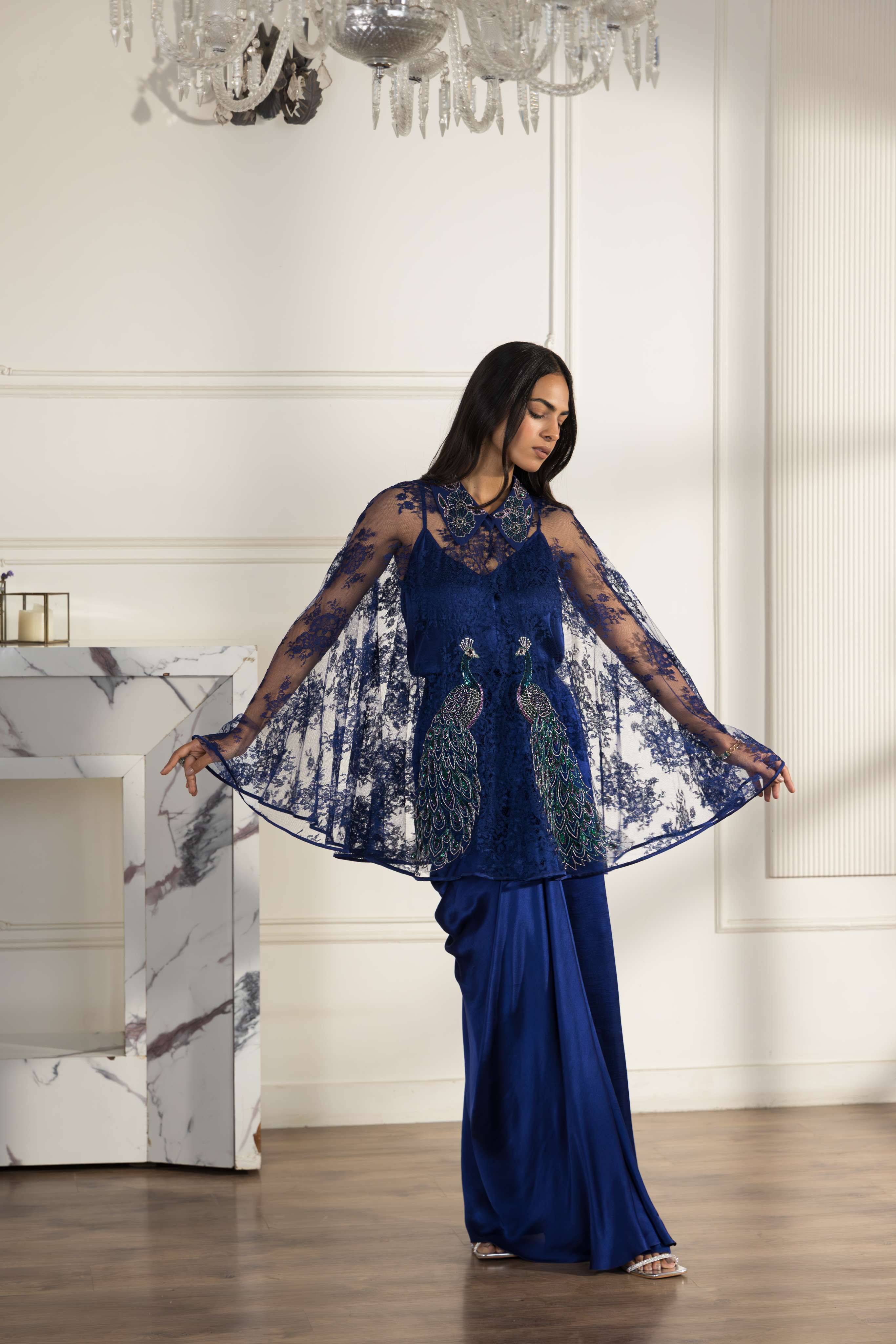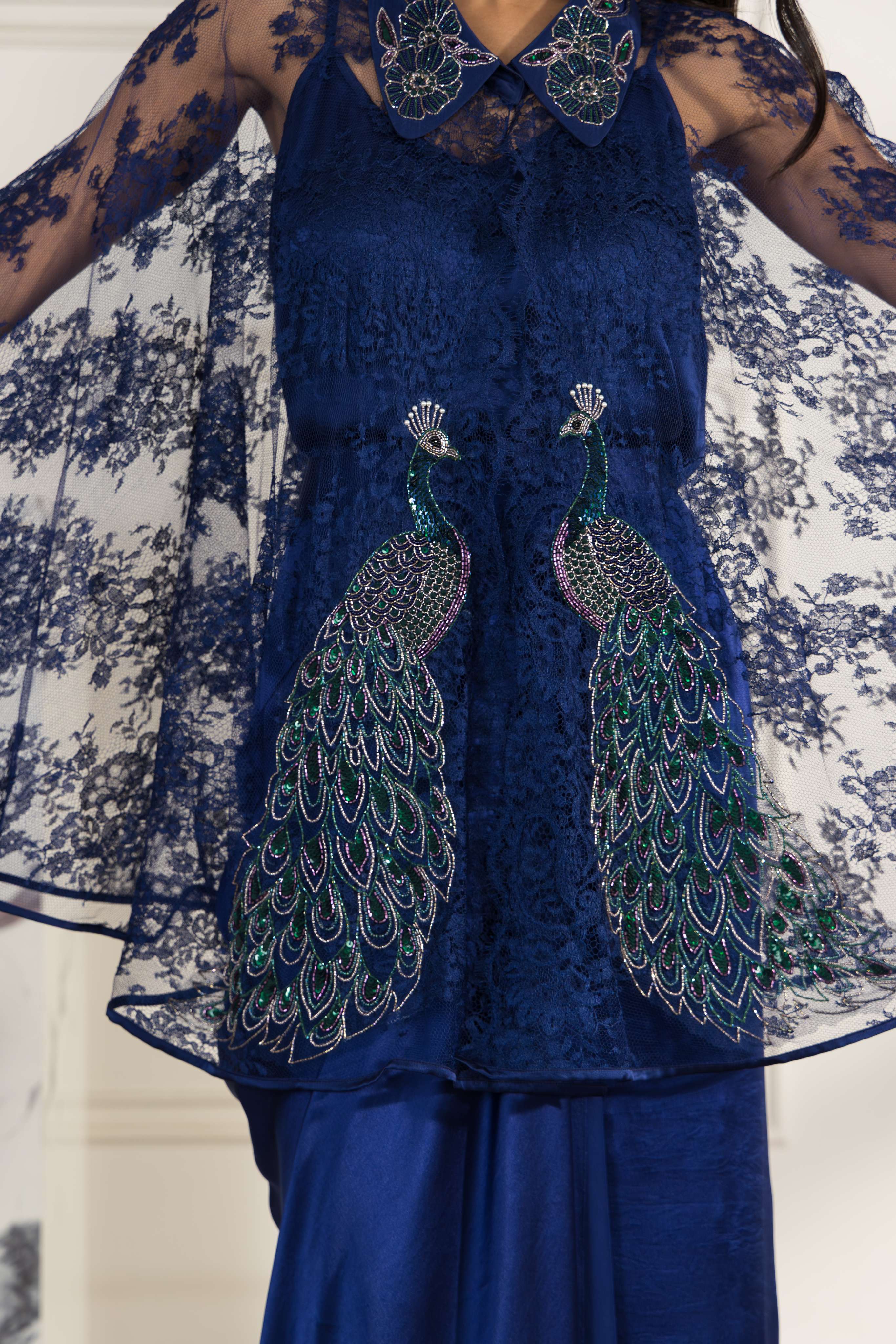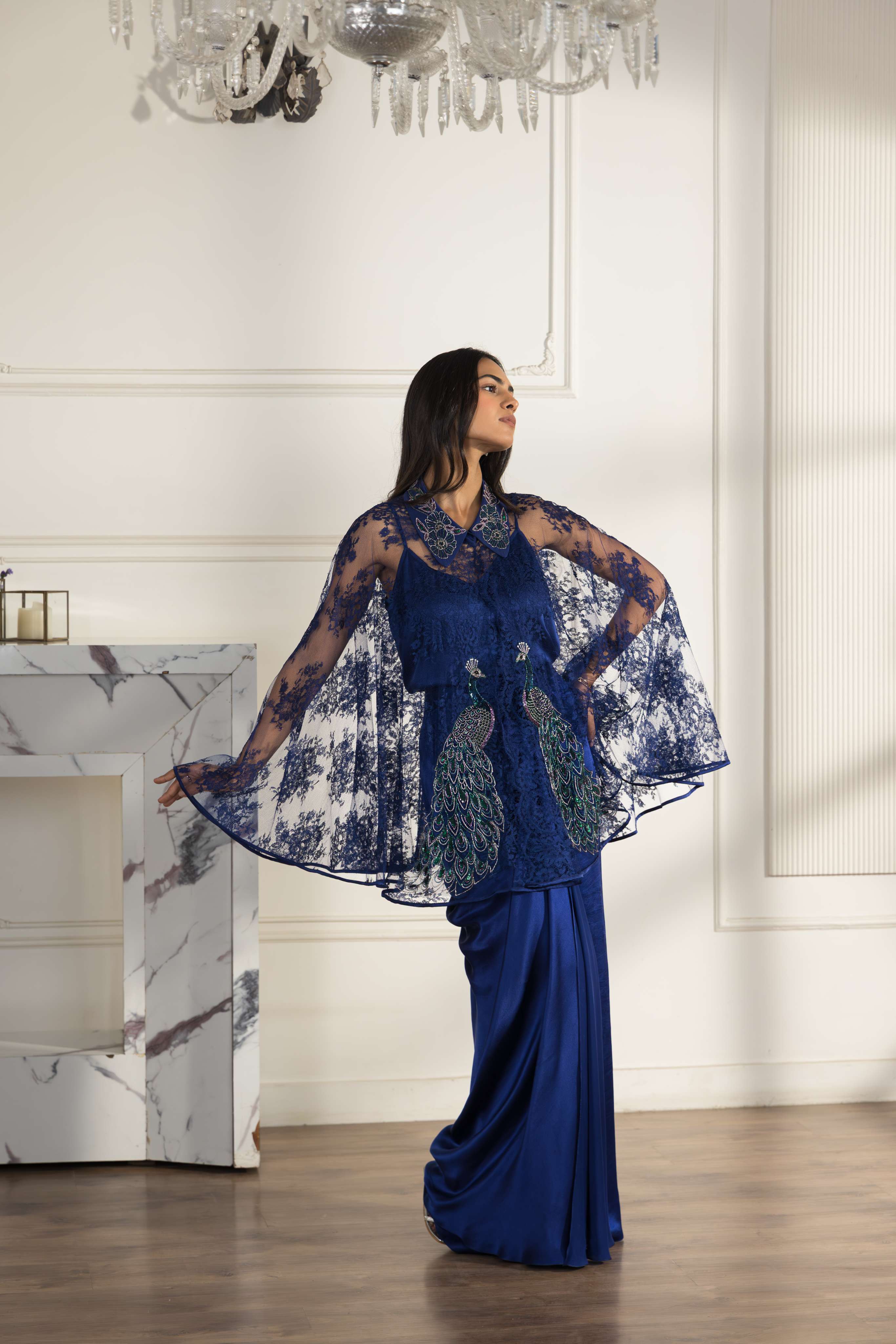 In 100% Satin Silk, this refined three-piece set is paired with an authentic Chantilly French lace cape, brought to life through 100 hours of hand embroidery. Intricate cutdana, moti, and beadwork beautifully form peacock motifs across the flowing cape, while the Satin Silk collar is enriched with detailed embroidery for a statement finish. The set includes a drape skirt and slip, both in pure Satin Silk, offering a tailored fit to complement the cape’s free-flowing silhouette. Balancing structure and ease, it is perfect for soirées, gatherings, or occasions that call for quiet elegance.