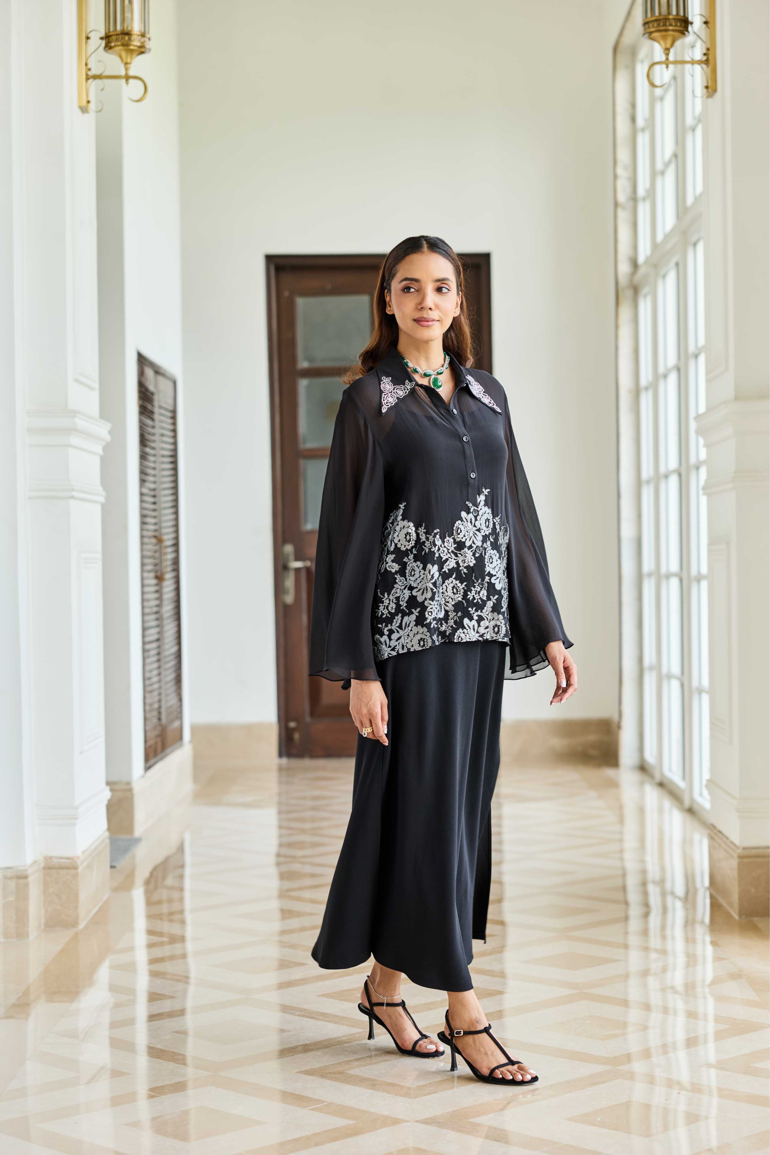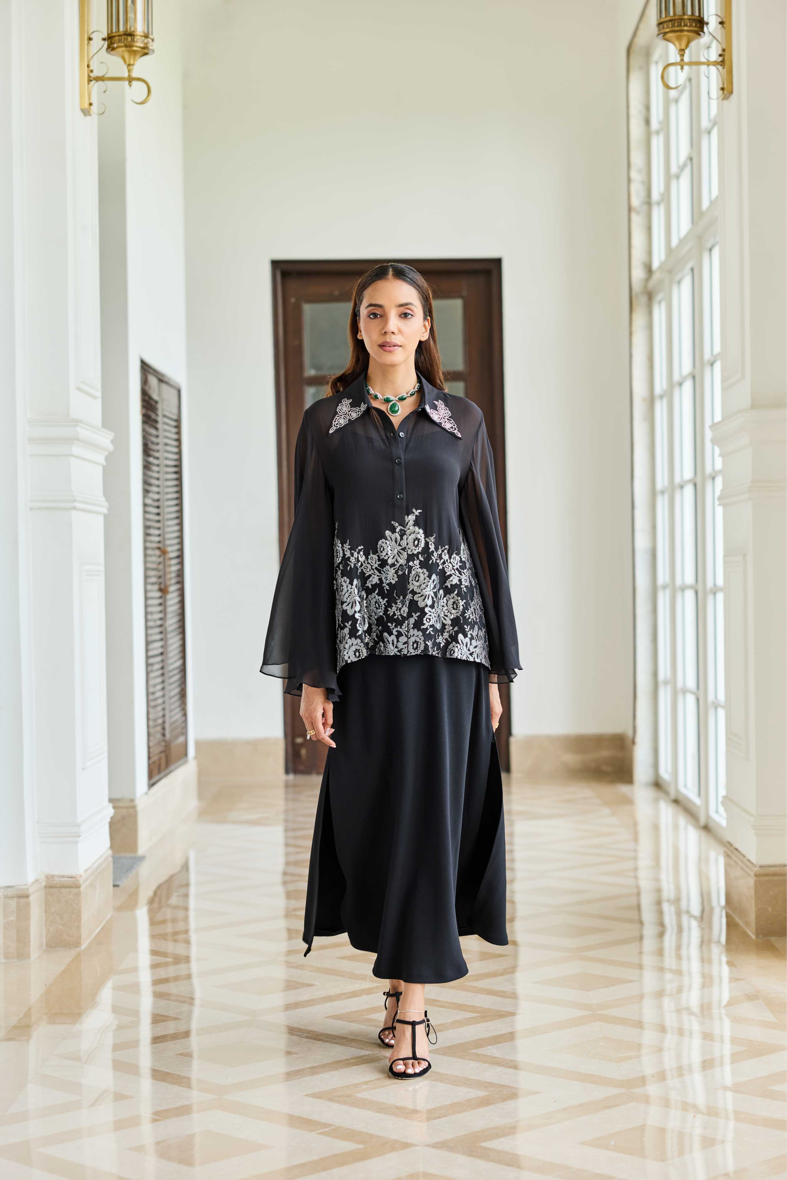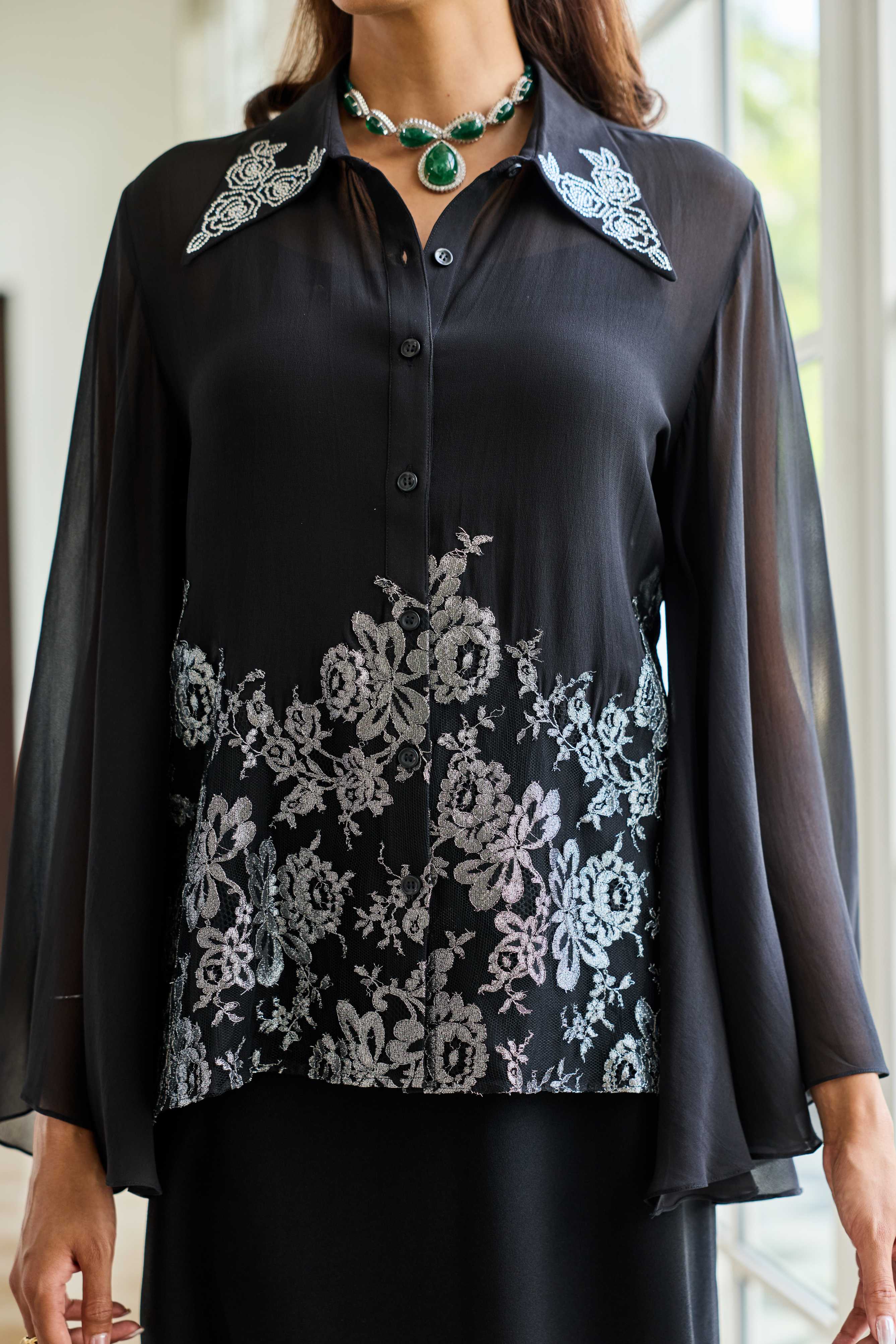A Black 100% Georgette shirt with Swarovski-embellished collar and French lace hem, perfect for elevated evening wear.