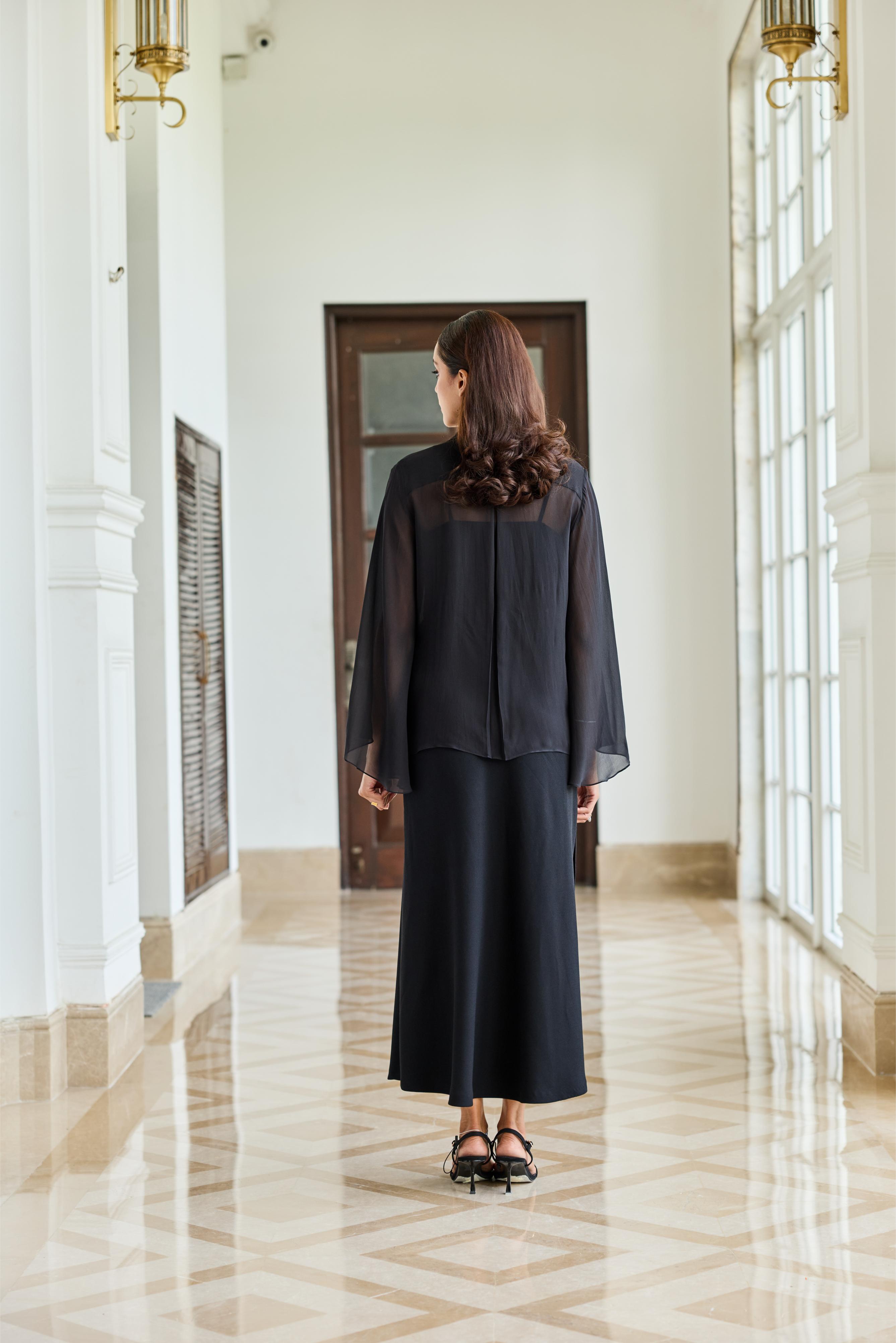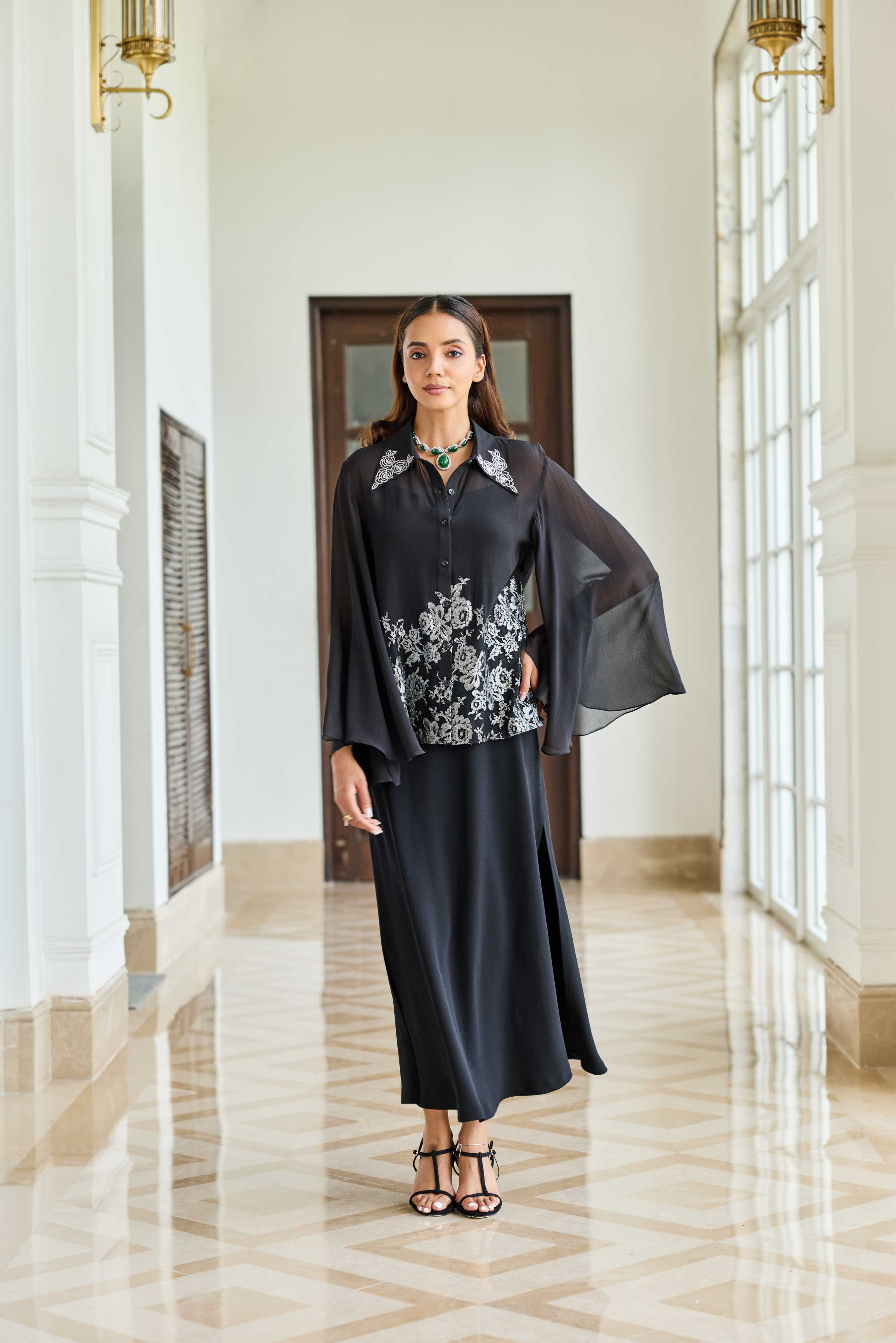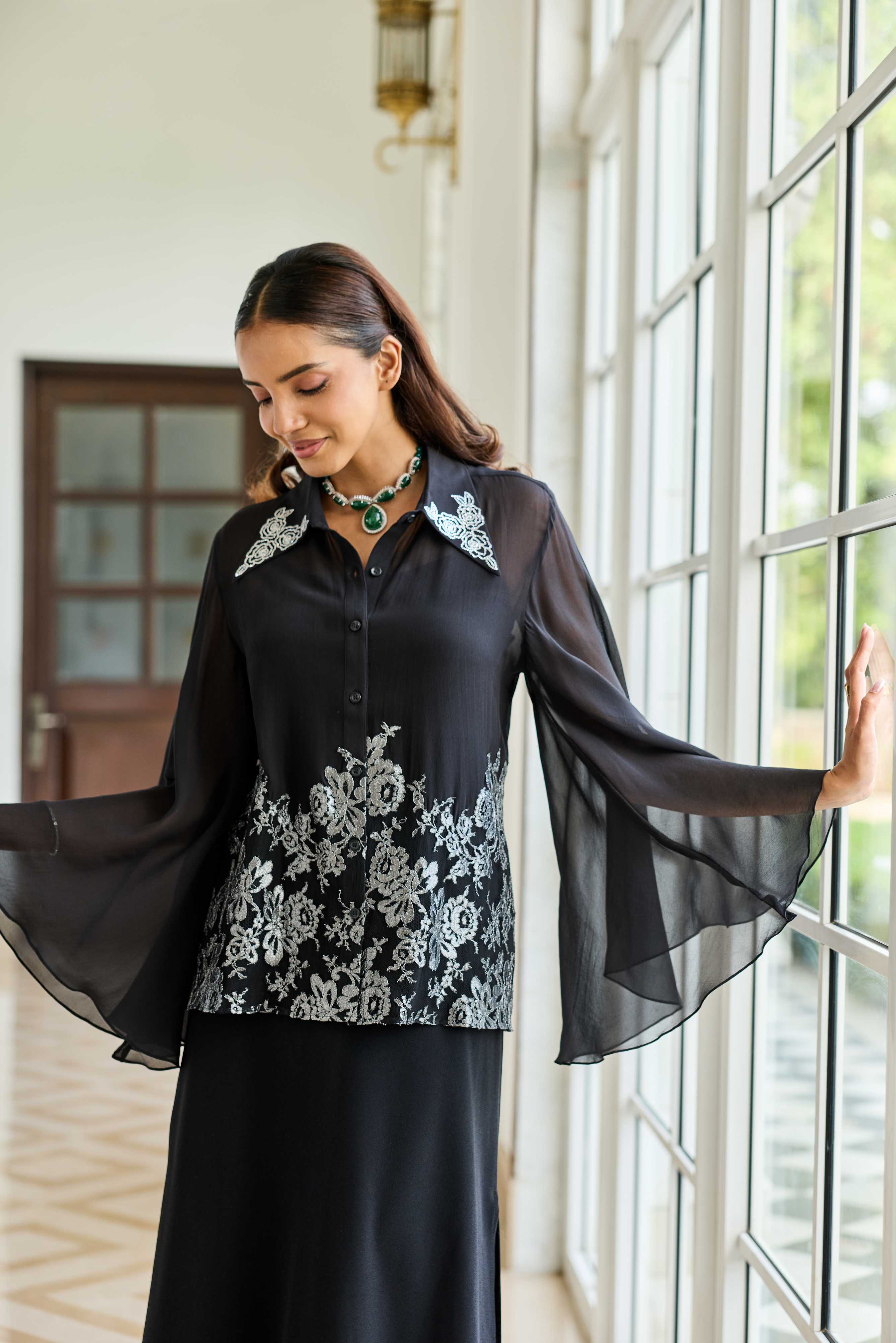 Crafted in pure Georgette, this Black shirt is adorned with certified French lace by Dentelle de Calais-Caudry® along the hem, adding refined texture and depth. The sharp collar is elevated with 20 hours of hand-placed Swarovski Rose accents, lending a subtle sparkle to the silhouette. Designed with a front button opening and flowy bell sleeves, it offers a relaxed and fluid fit. Ideal for evening elegance and special occasions.
