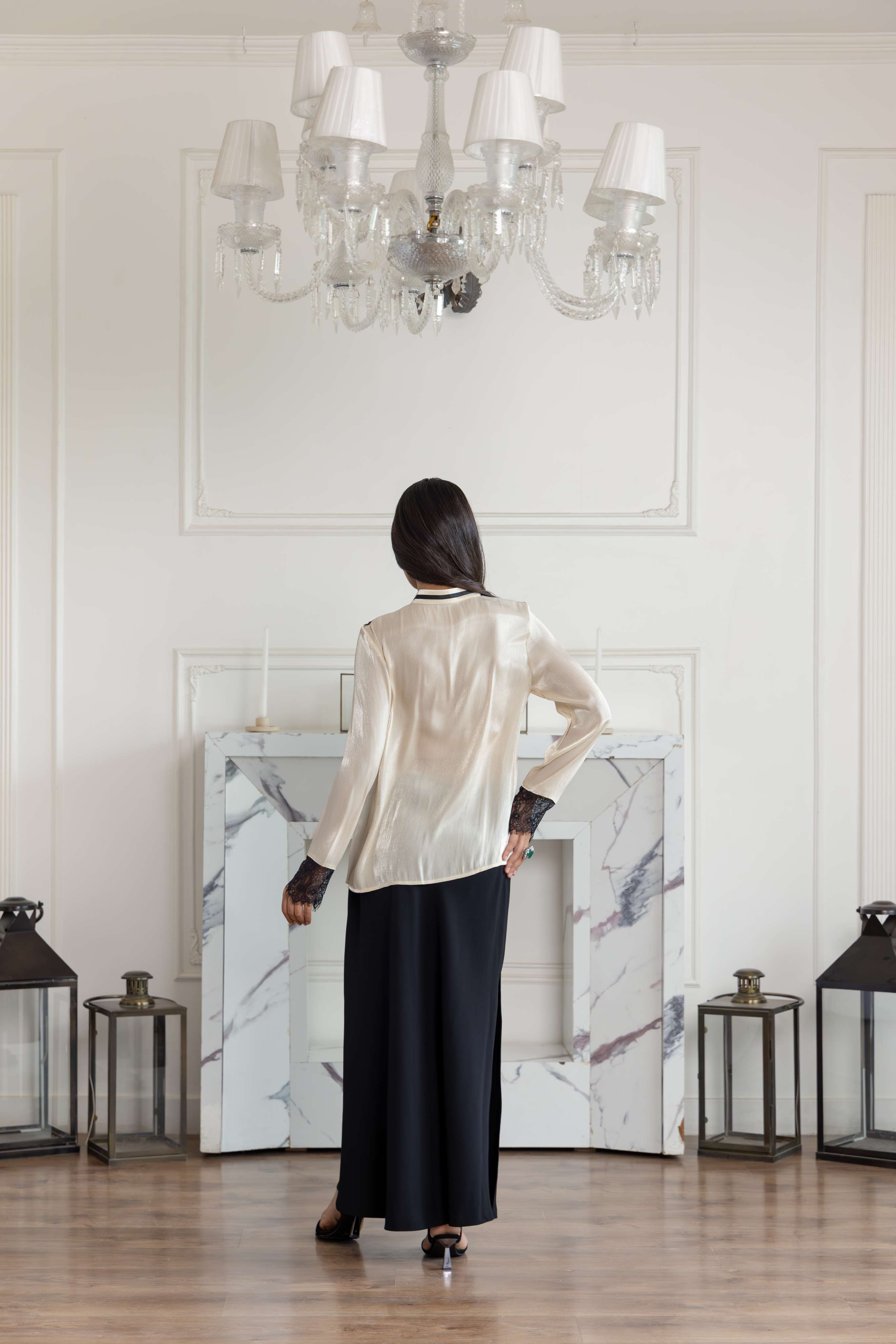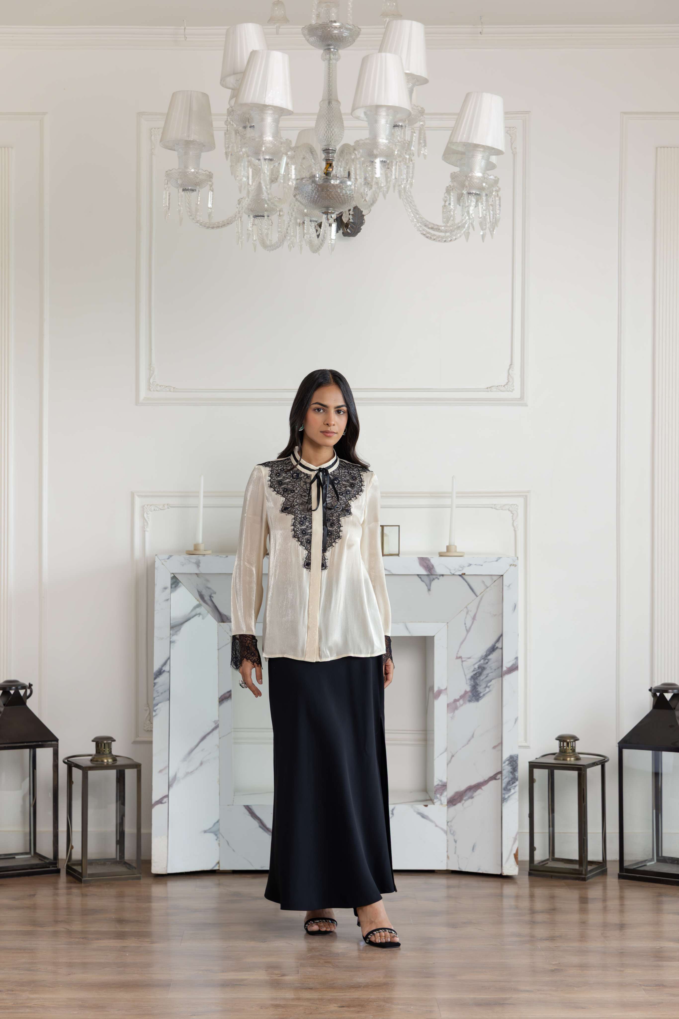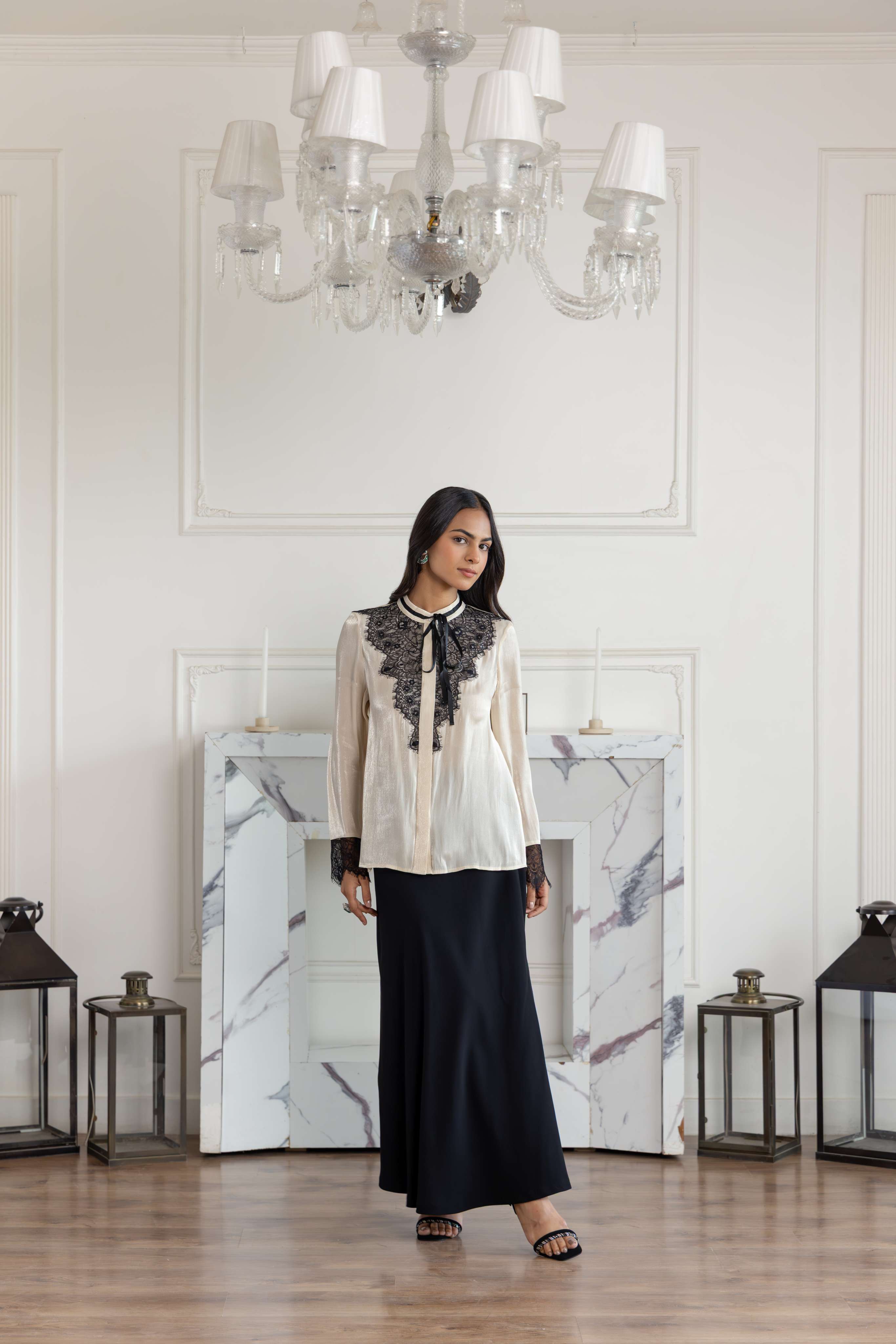 In Georgette Silk blend with a subtle shimmer, this tailored top is elevated with the signature Dentelle de Calais-Caudry French Chantilly lace. The neckline is finished with a Black and White lace ribbon tie, lending contrast and definition against the soft Beige base. This versatile top comes with a refined cut transitioning seamlessly