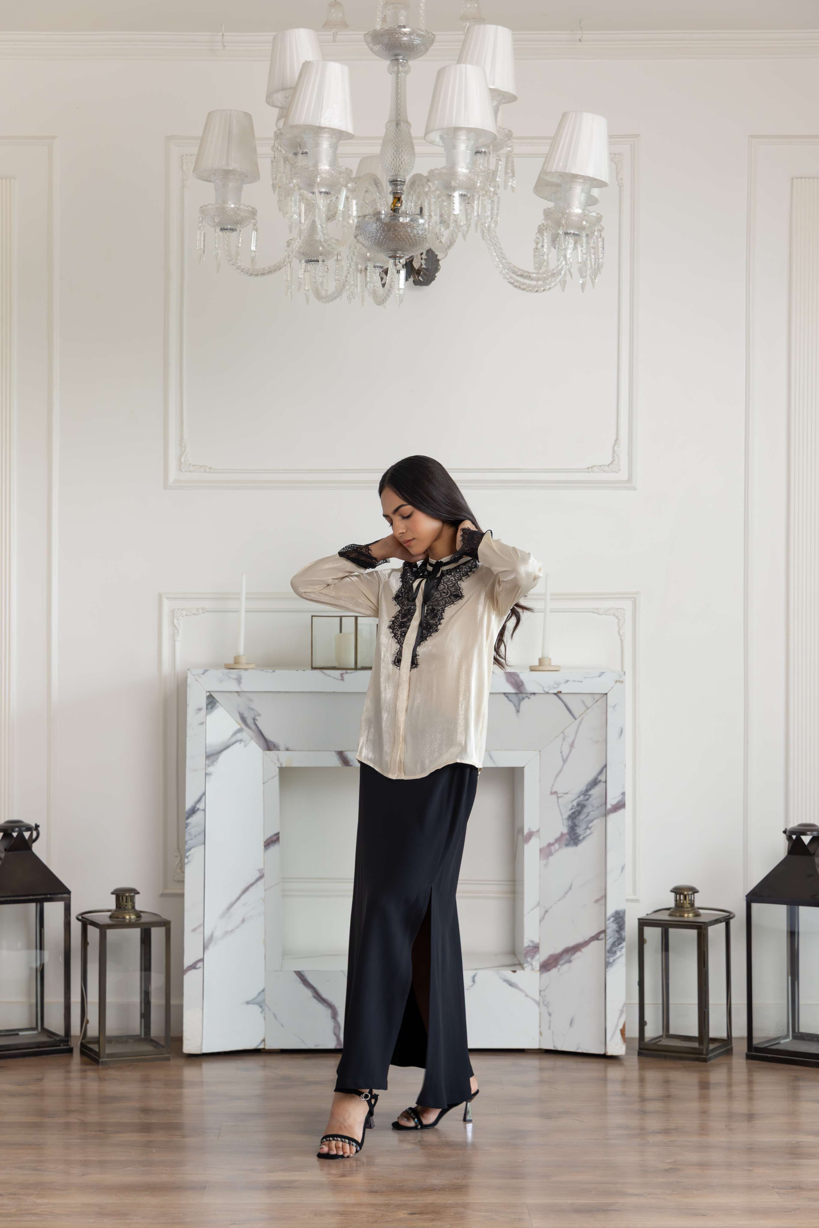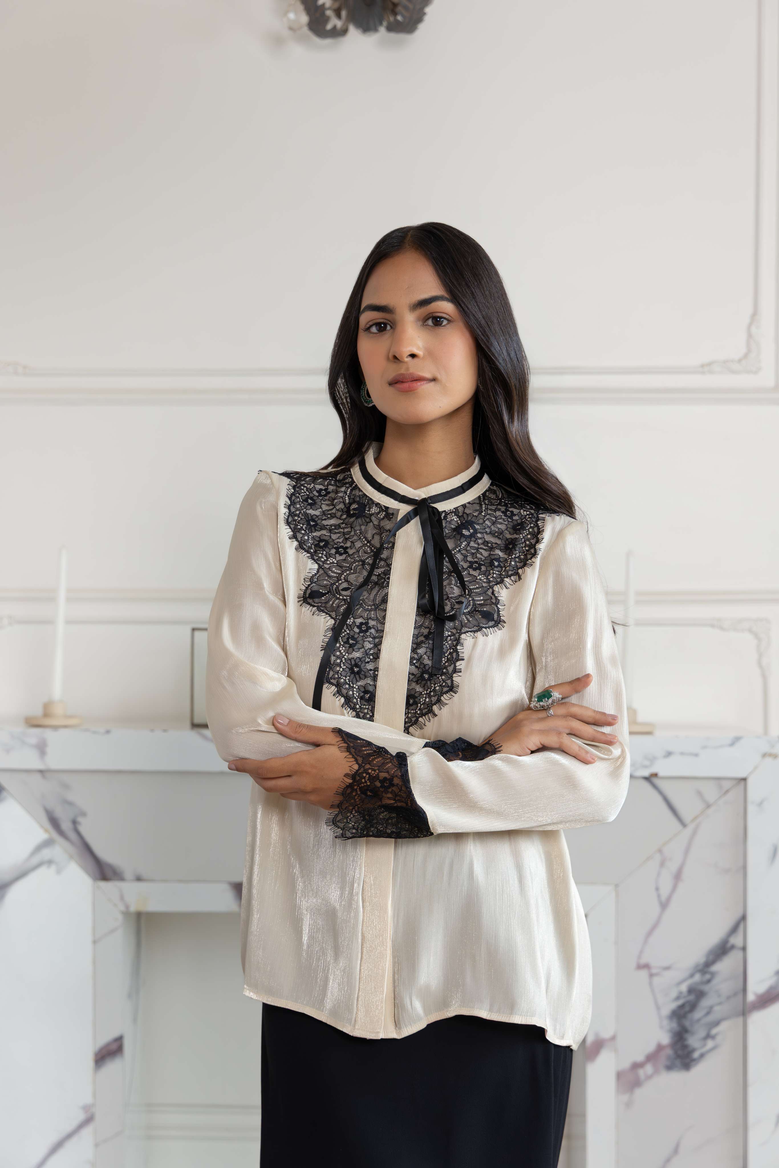 A beige shimmer Georgette Silk blend top with a signature Black lace bow, tailored for a poised finish.