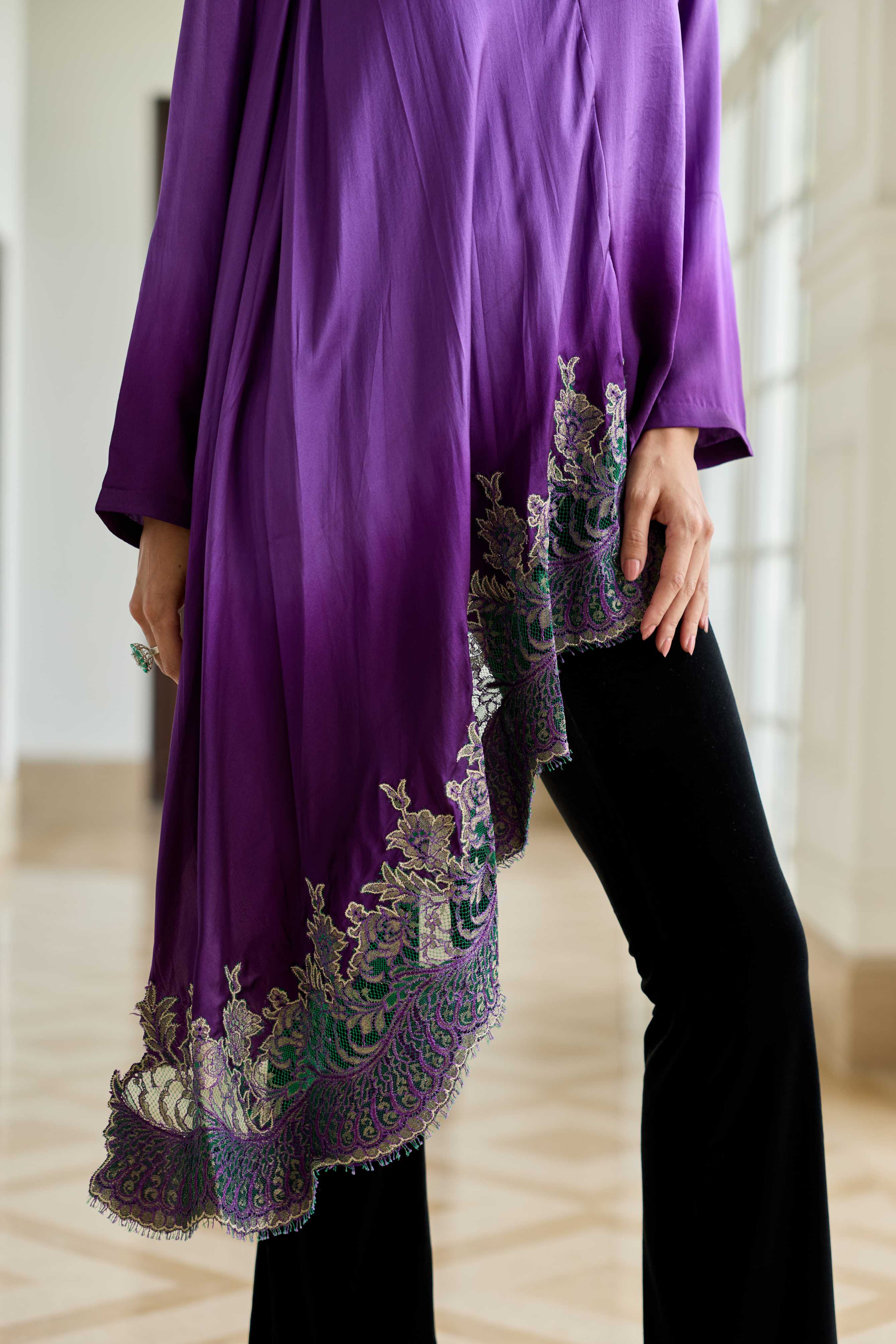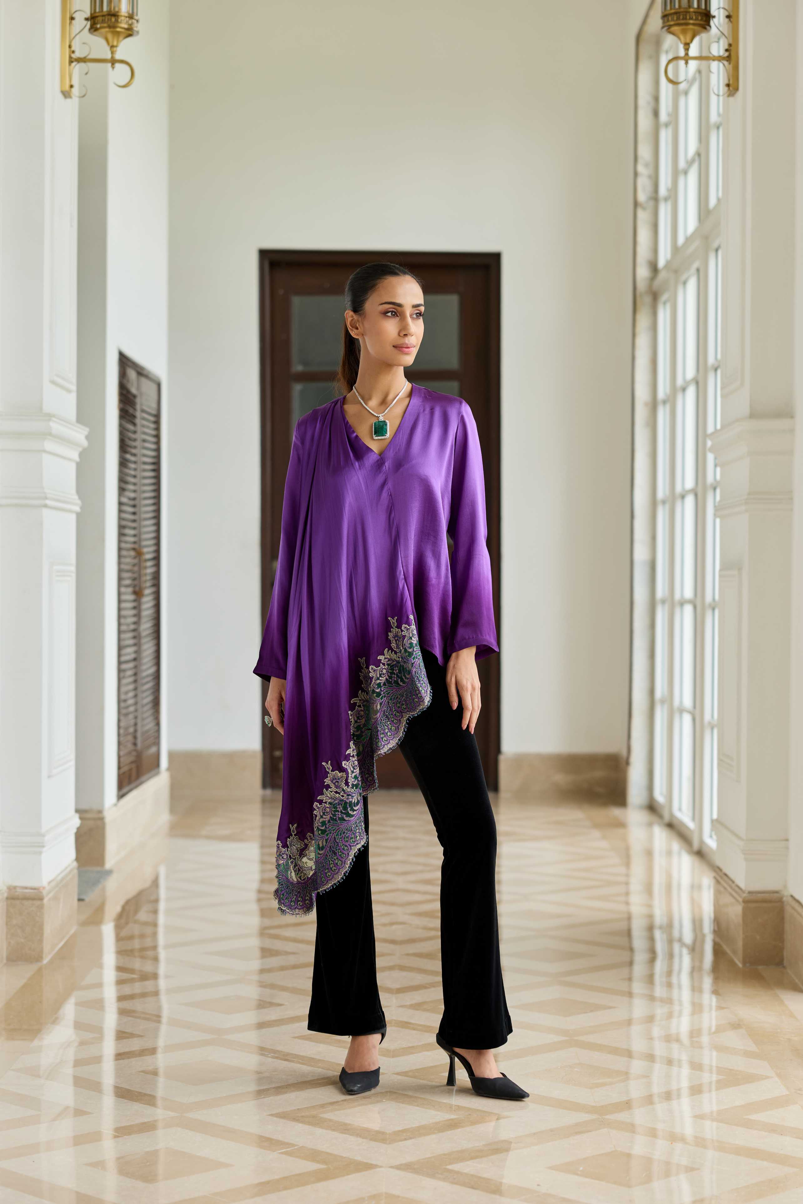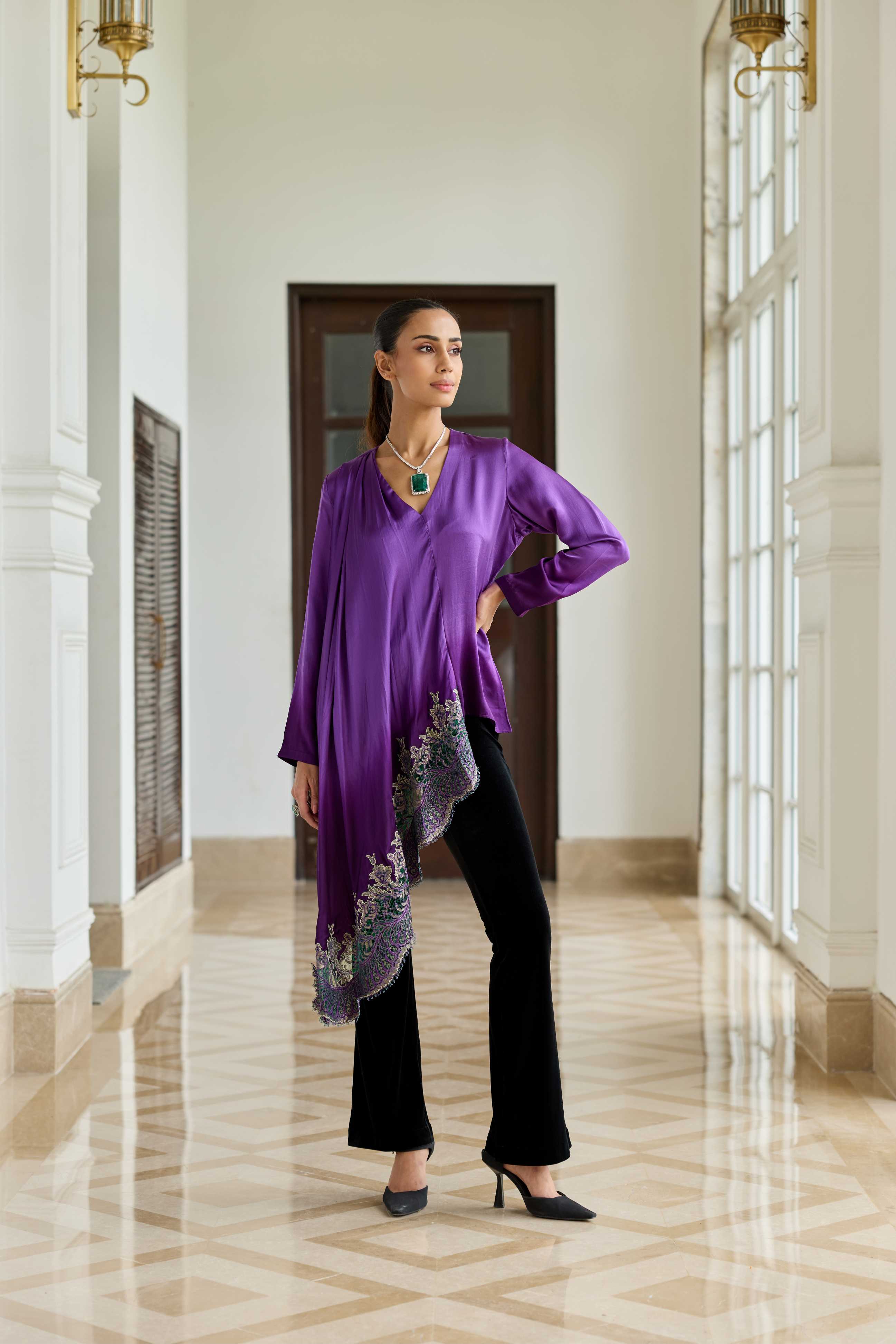 A sculpted satin silk top in a purple gradient, elevated with a draped scarf and French lace hand-applied with golden tilla.