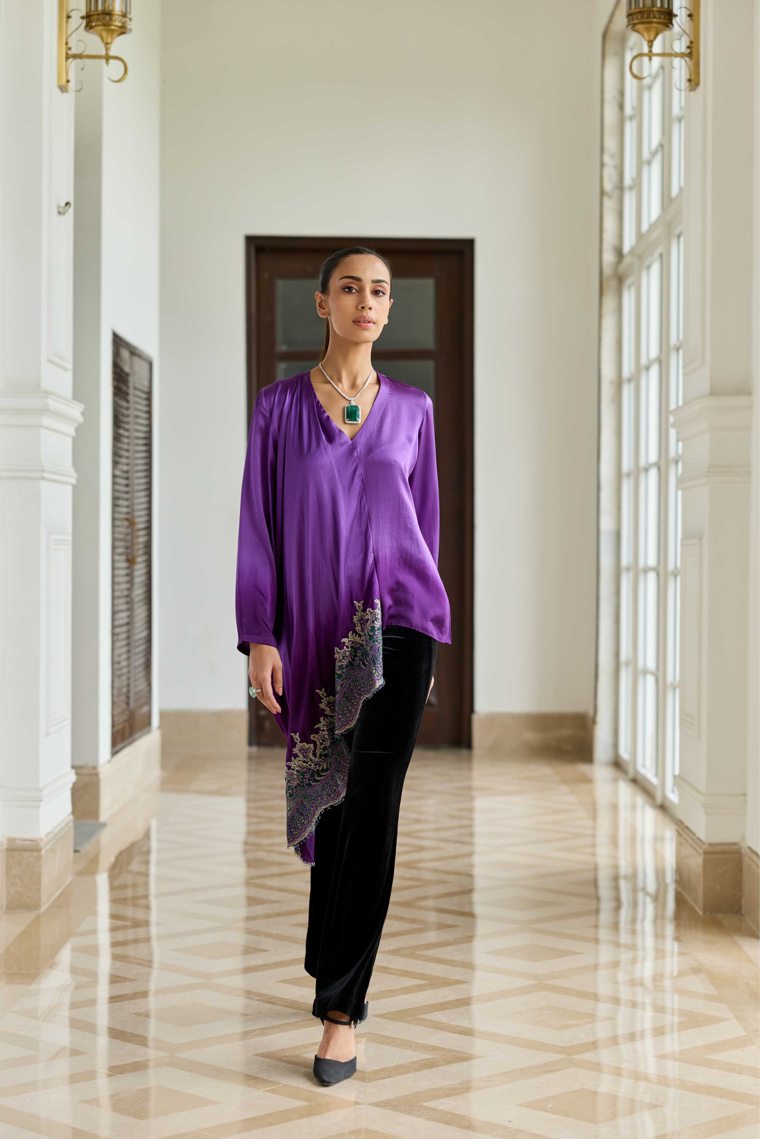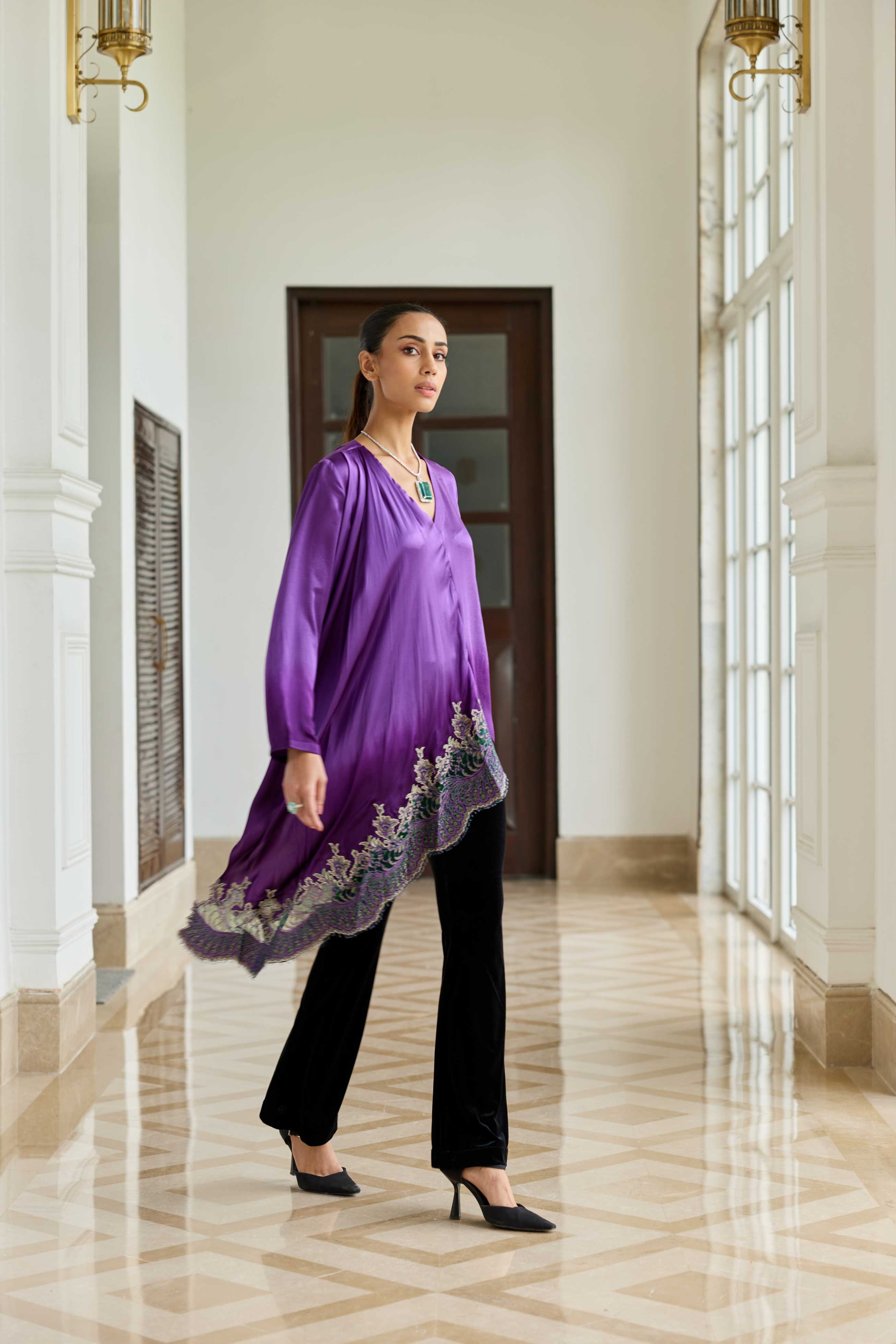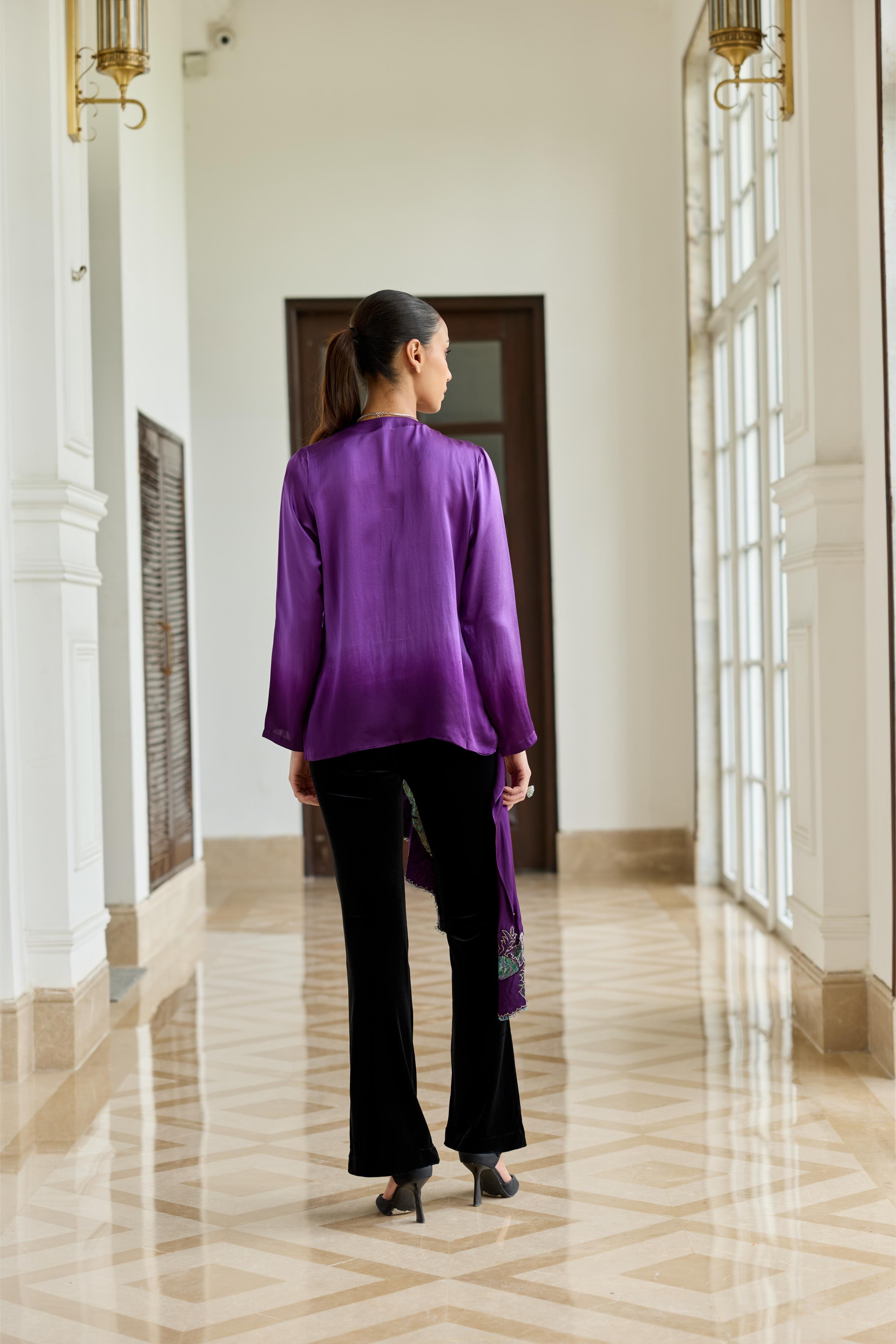 A sculpted satin silk top in a purple gradient, elevated with a draped scarf and French lace hand-applied with golden tilla.