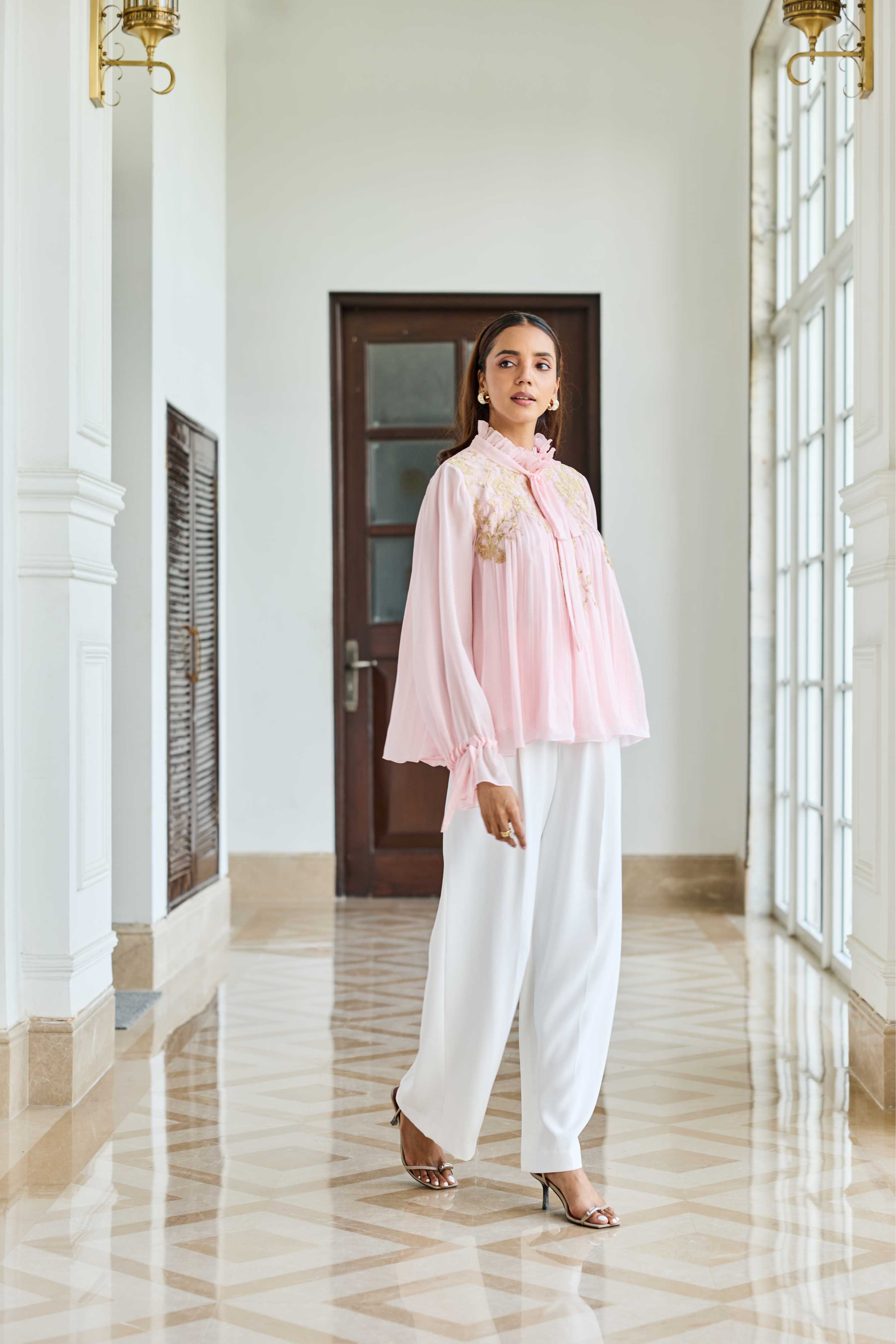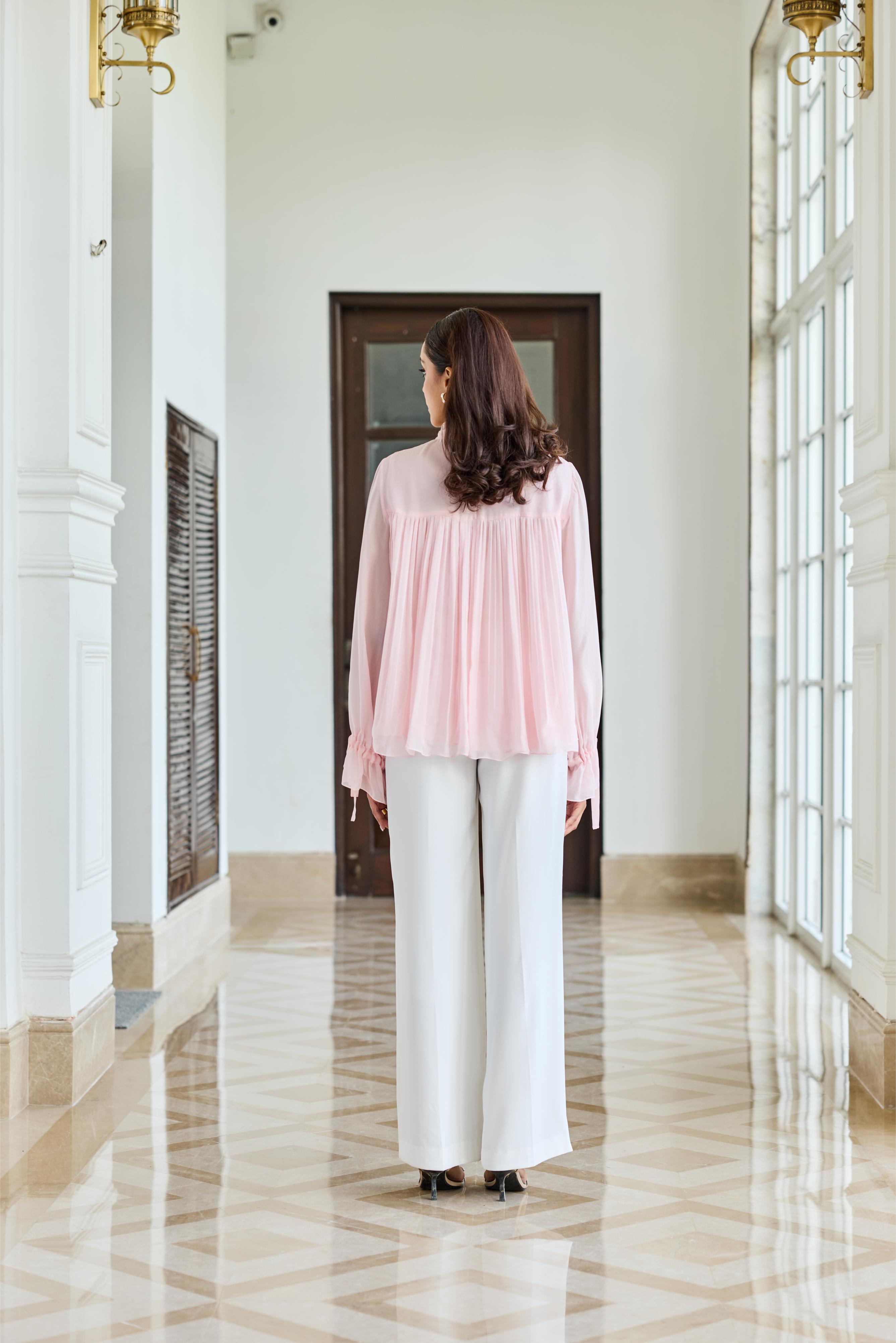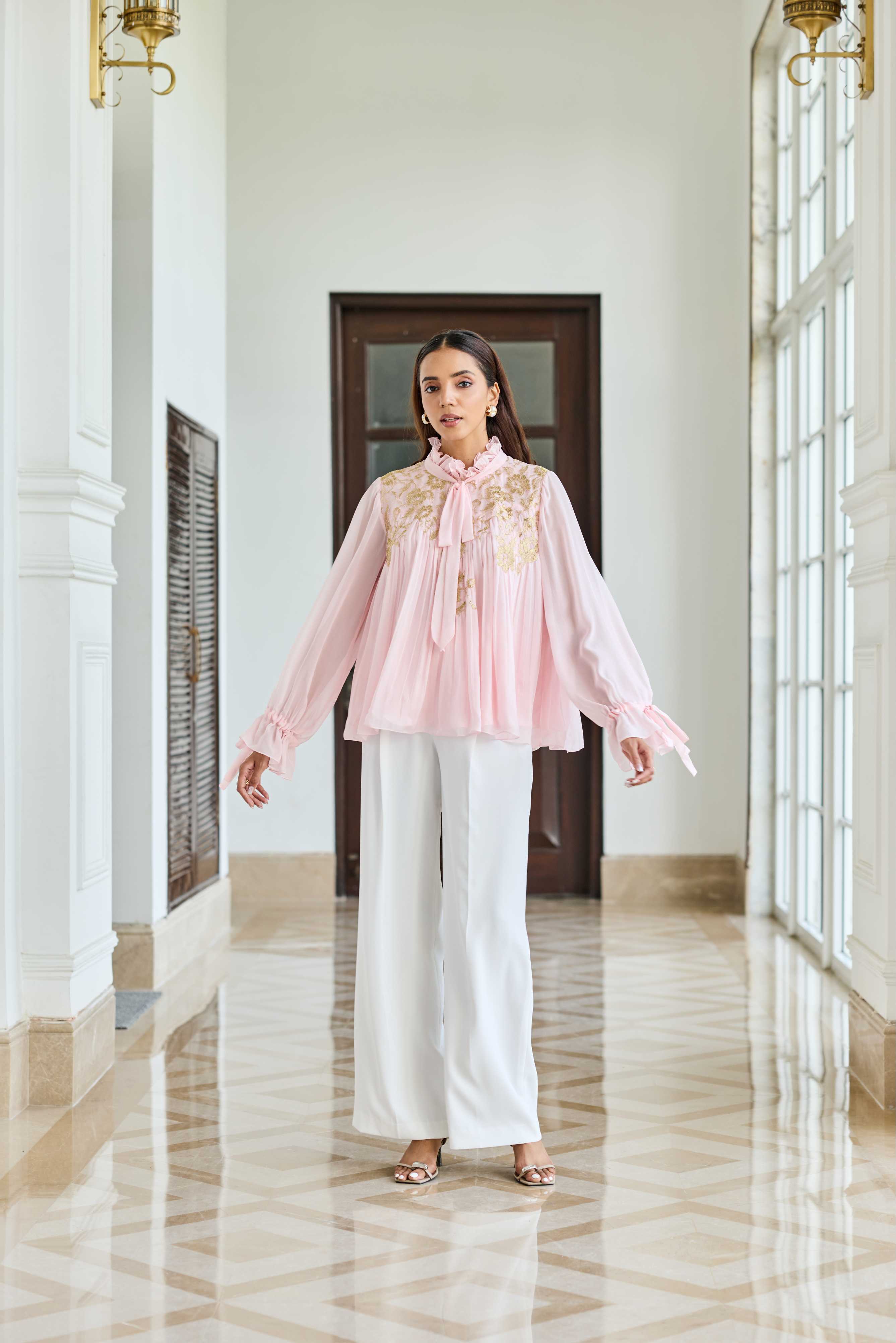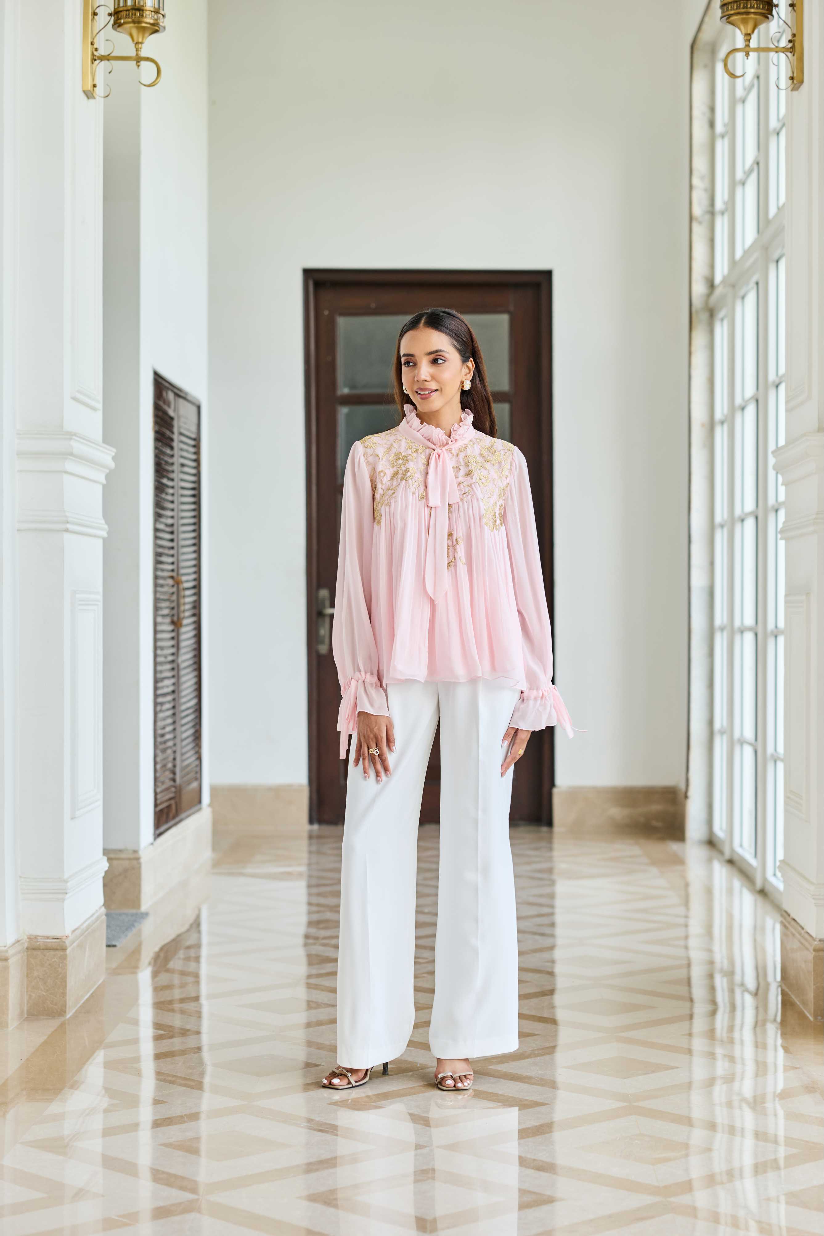 A baby Pink 100% flat Chiffon bow-neck top adorned with French lace and soft ruffle accents for understated romance.