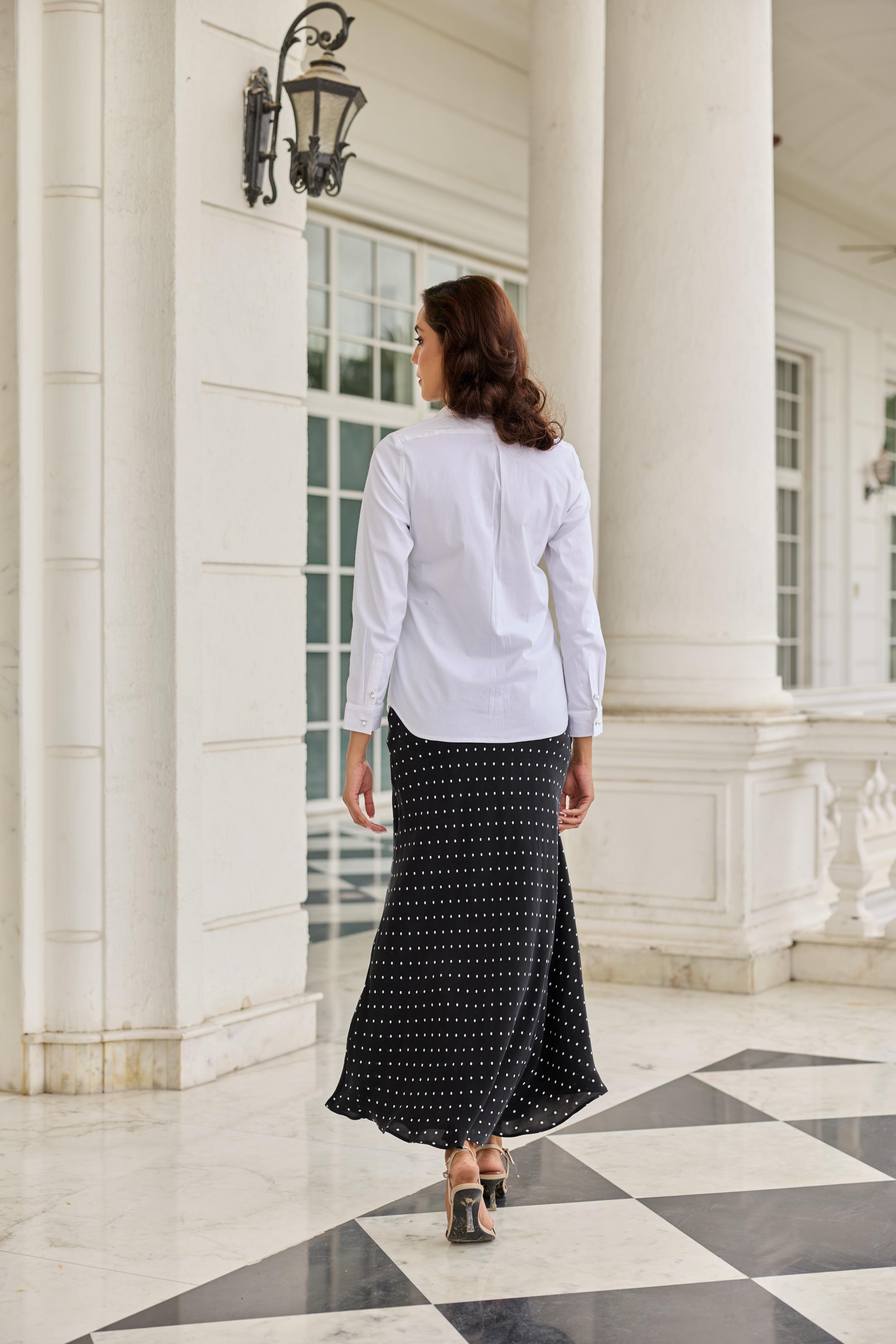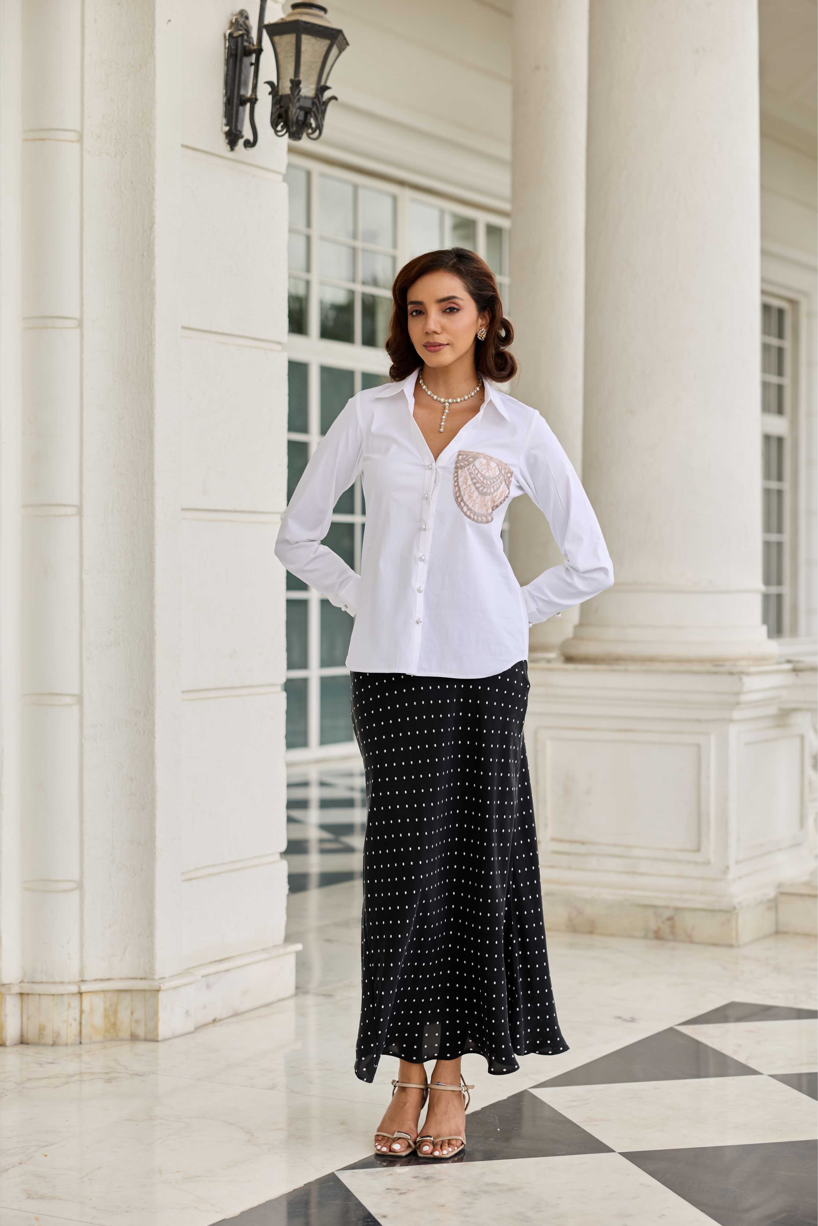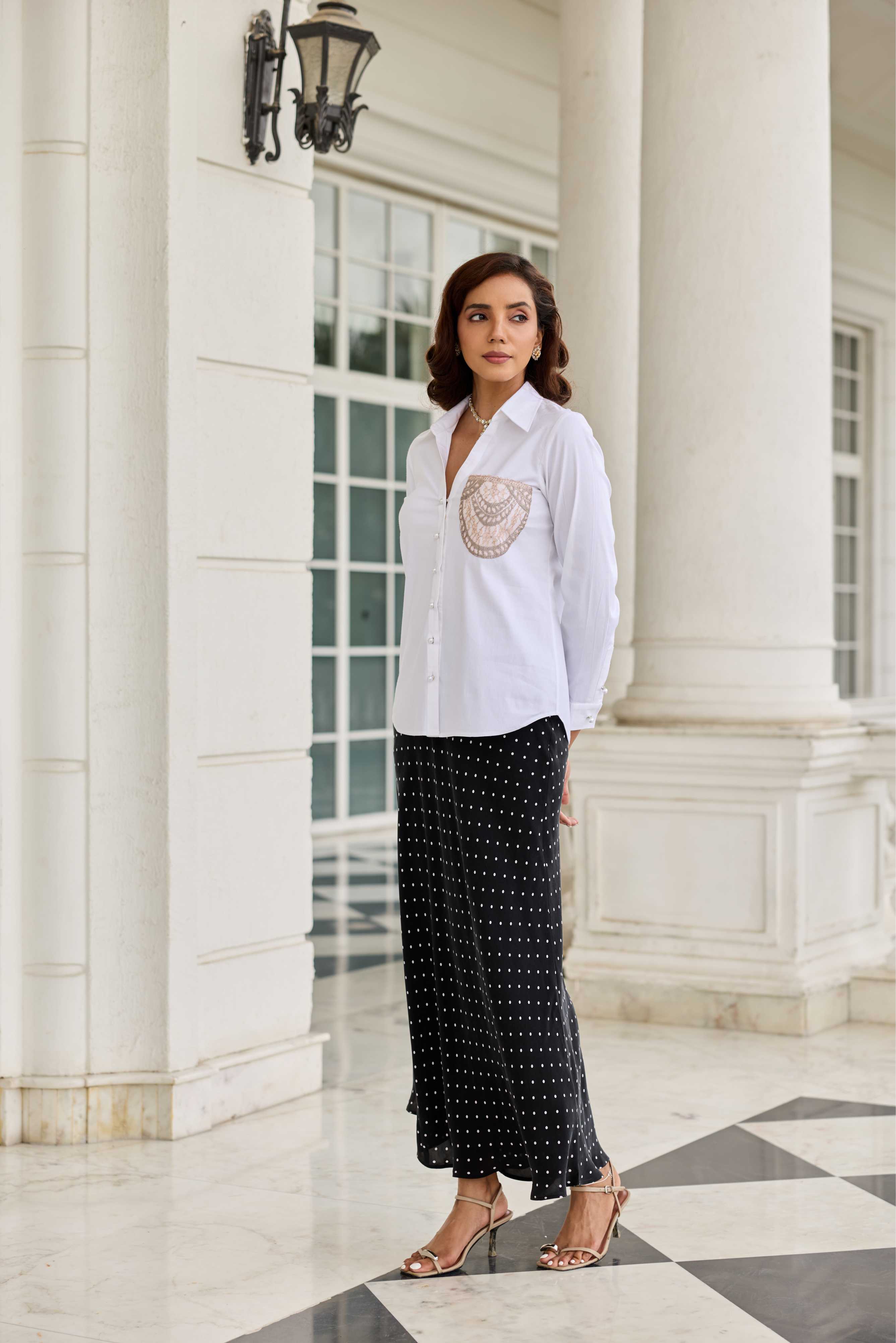 A crisp Cotton shirt with a French lace patch pocket, merging everyday ease with heritage craftsmanship.