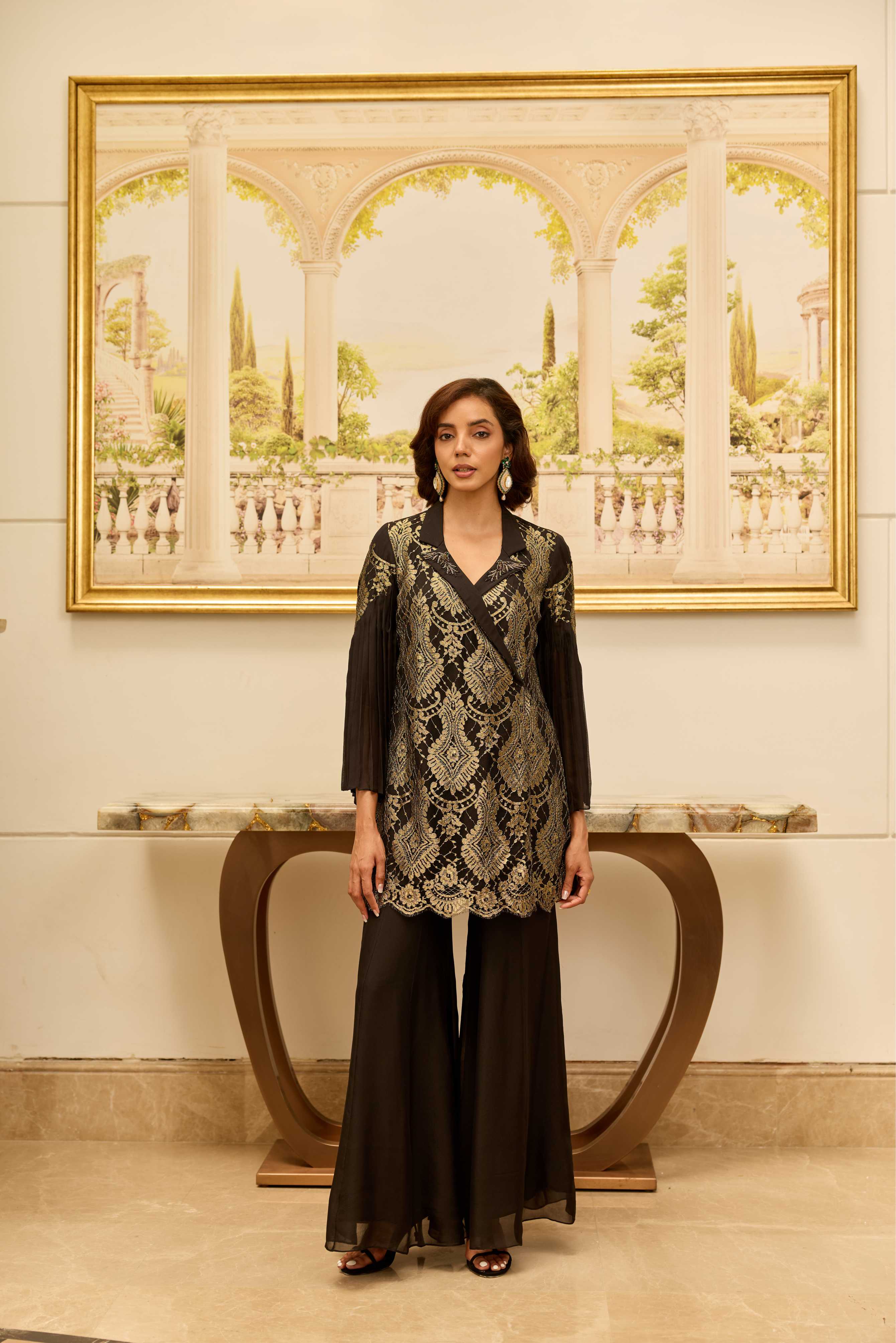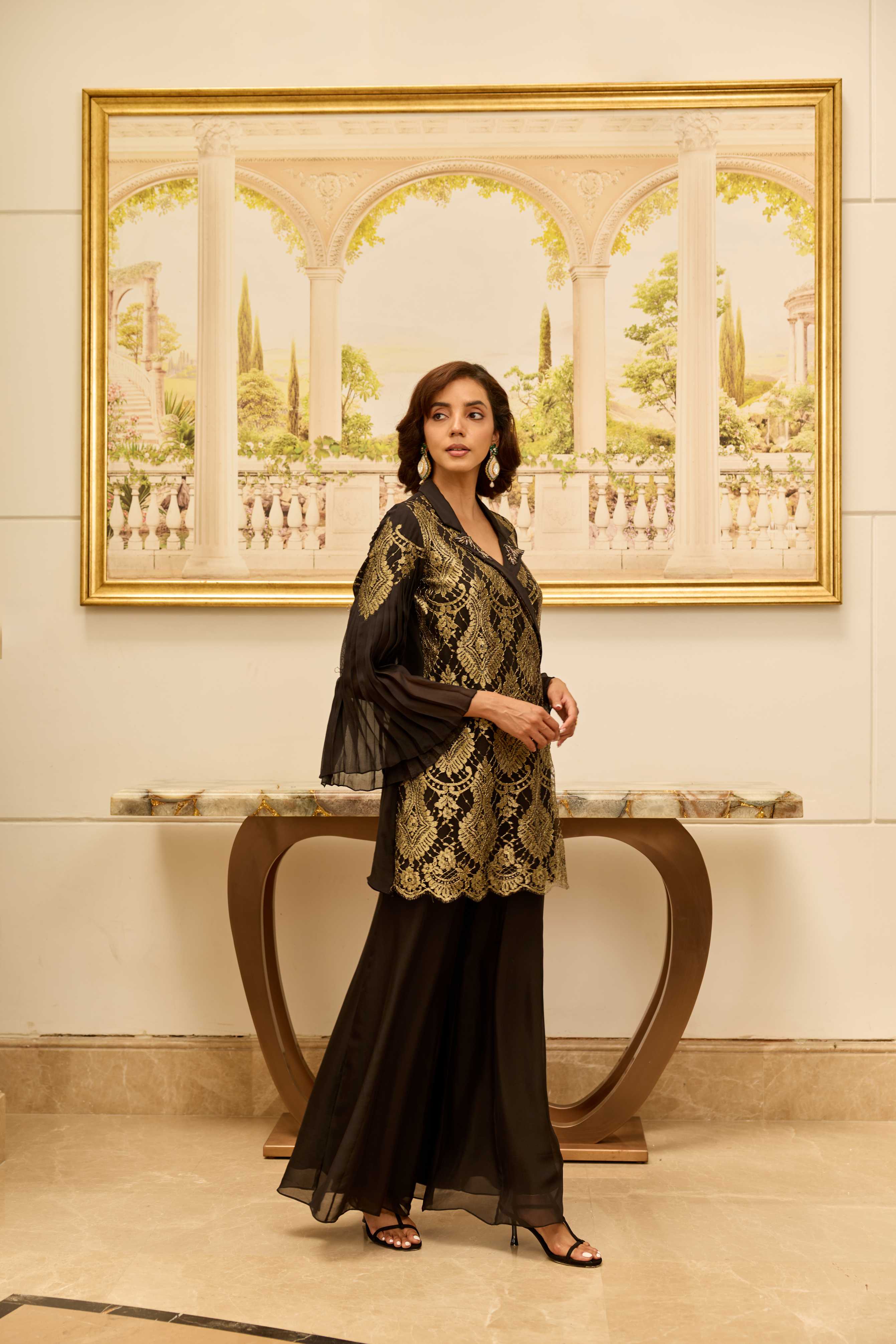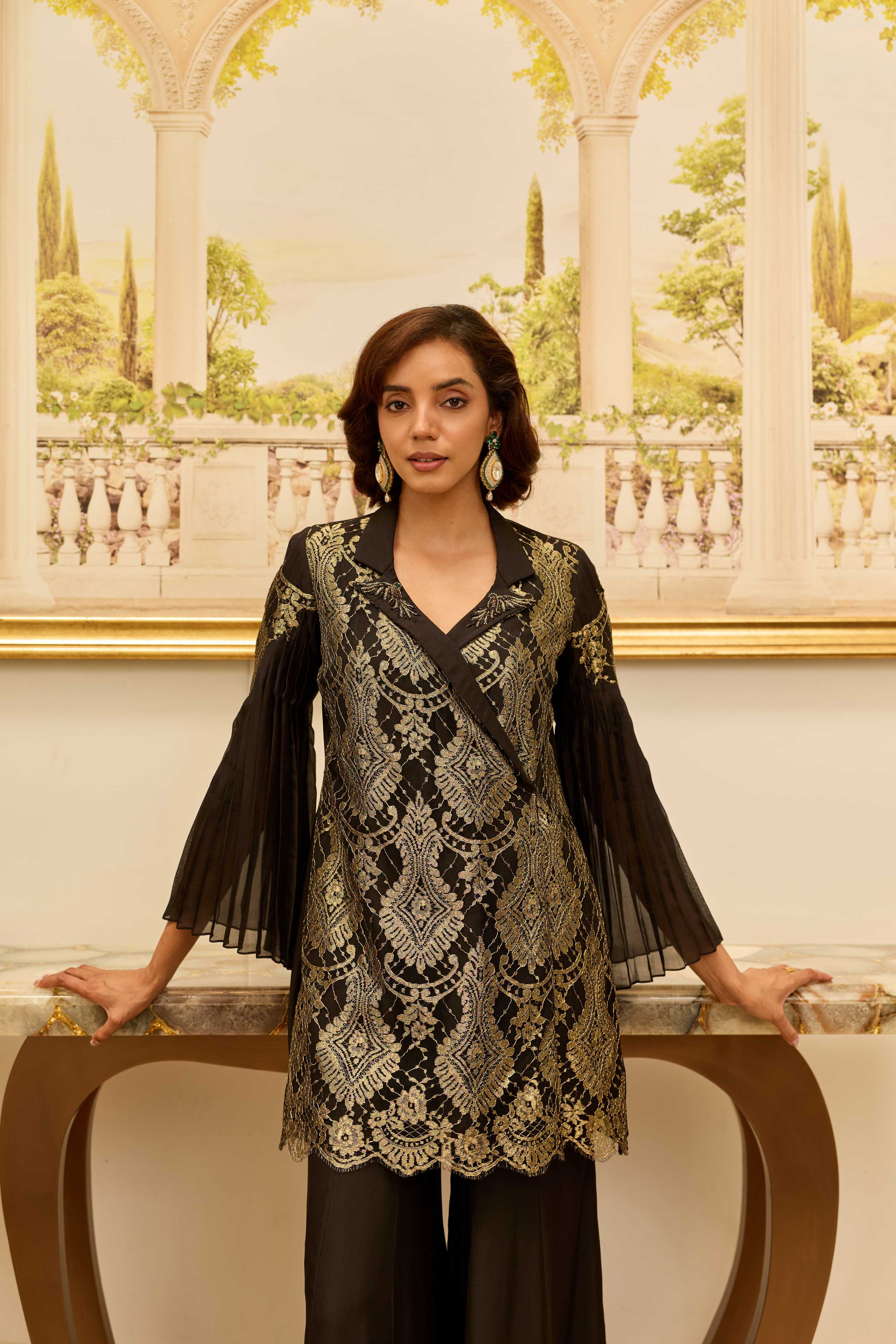 Crafted from 100% pure flat Chiffon, this co-ord set features a wrap-style Angrakha top and high-waisted bell-bottom trousers in classic Black. It is adorned with French lace certified by Dentelle de Calais-Caudry® on the front, back, and sleeves, creating an elegant, full-lace statement. Subtle hand embroidery graces the collar, while pleated sleeves and a fluid silhouette lend a striking finish, making it a standout ensemble for formal evenings.