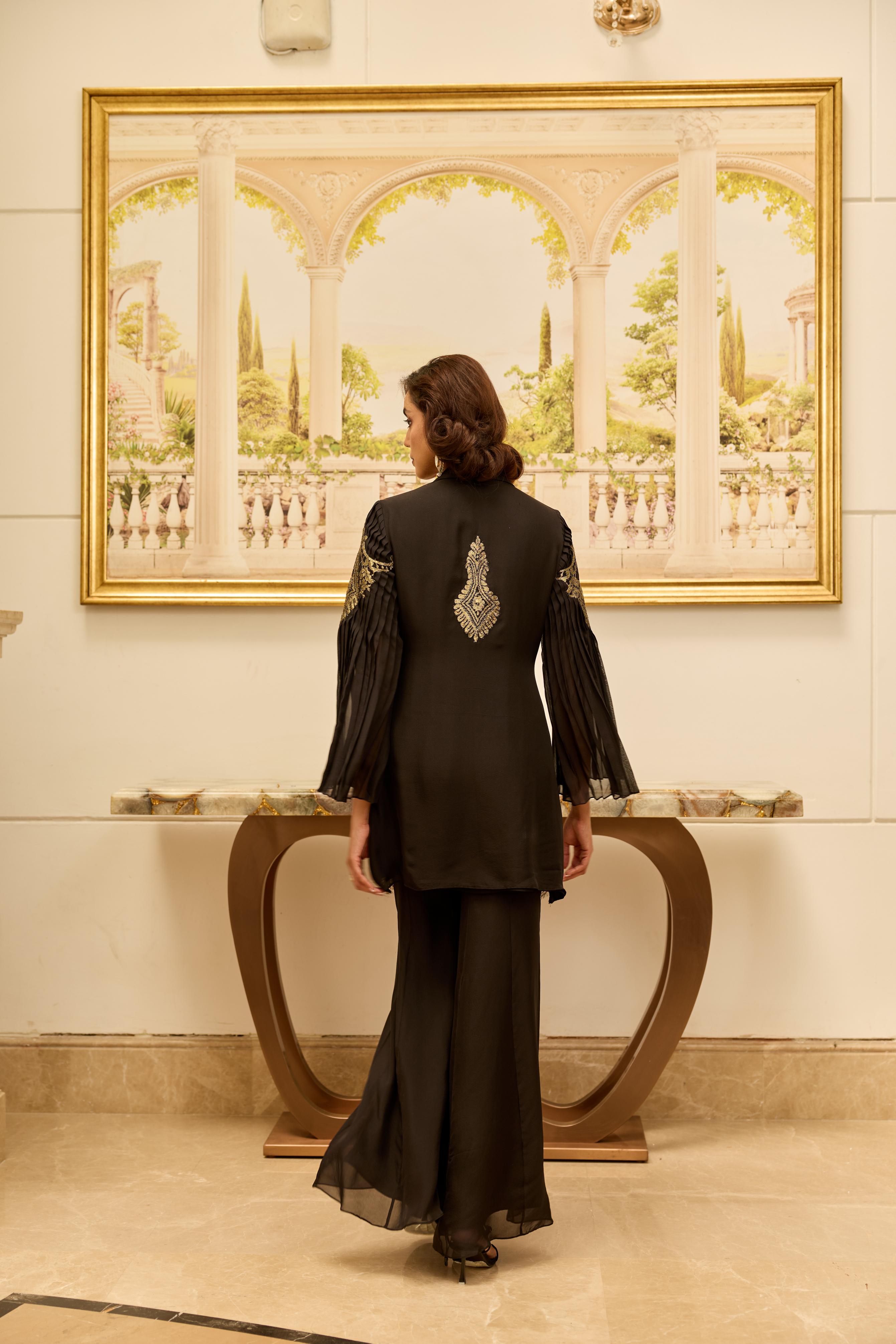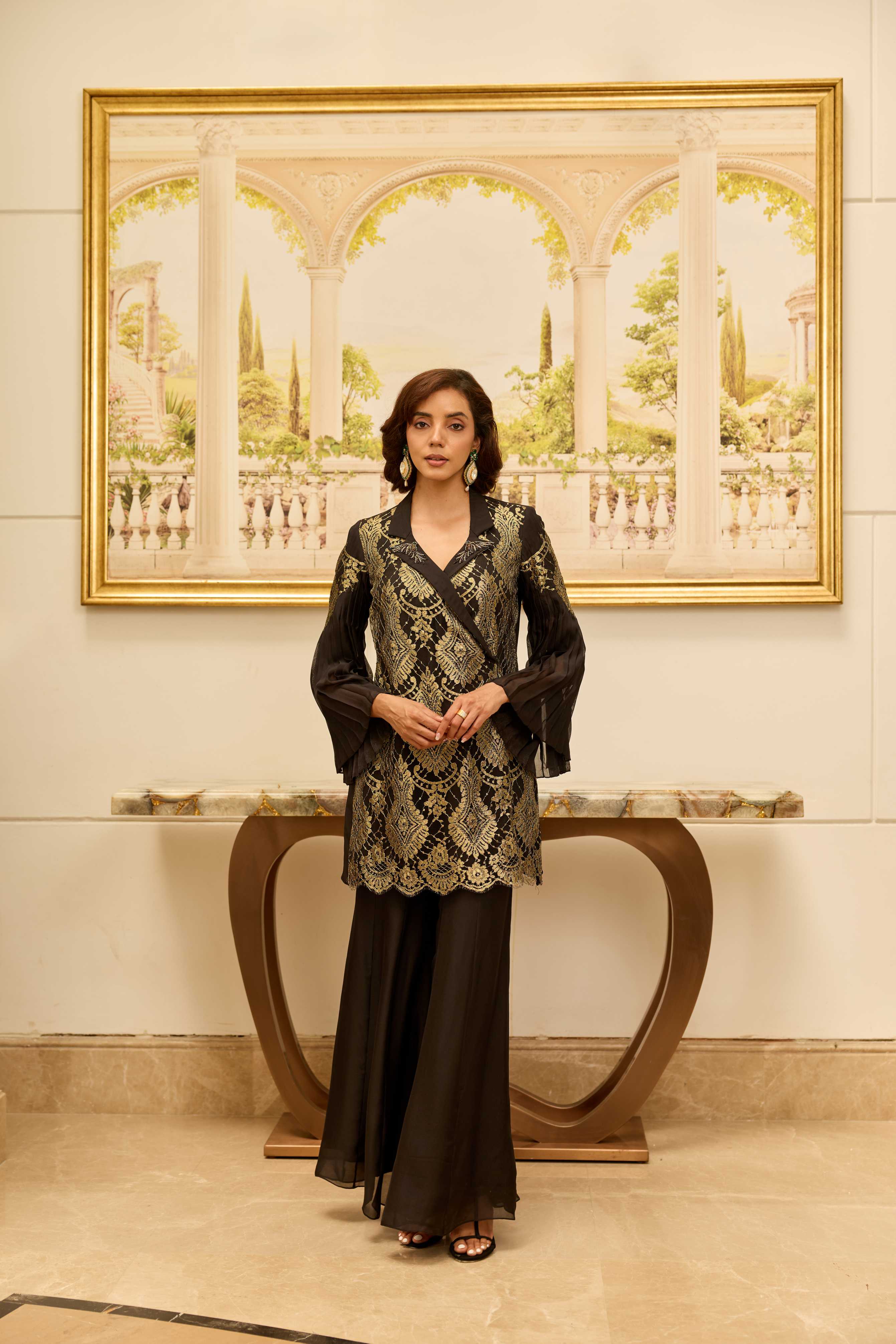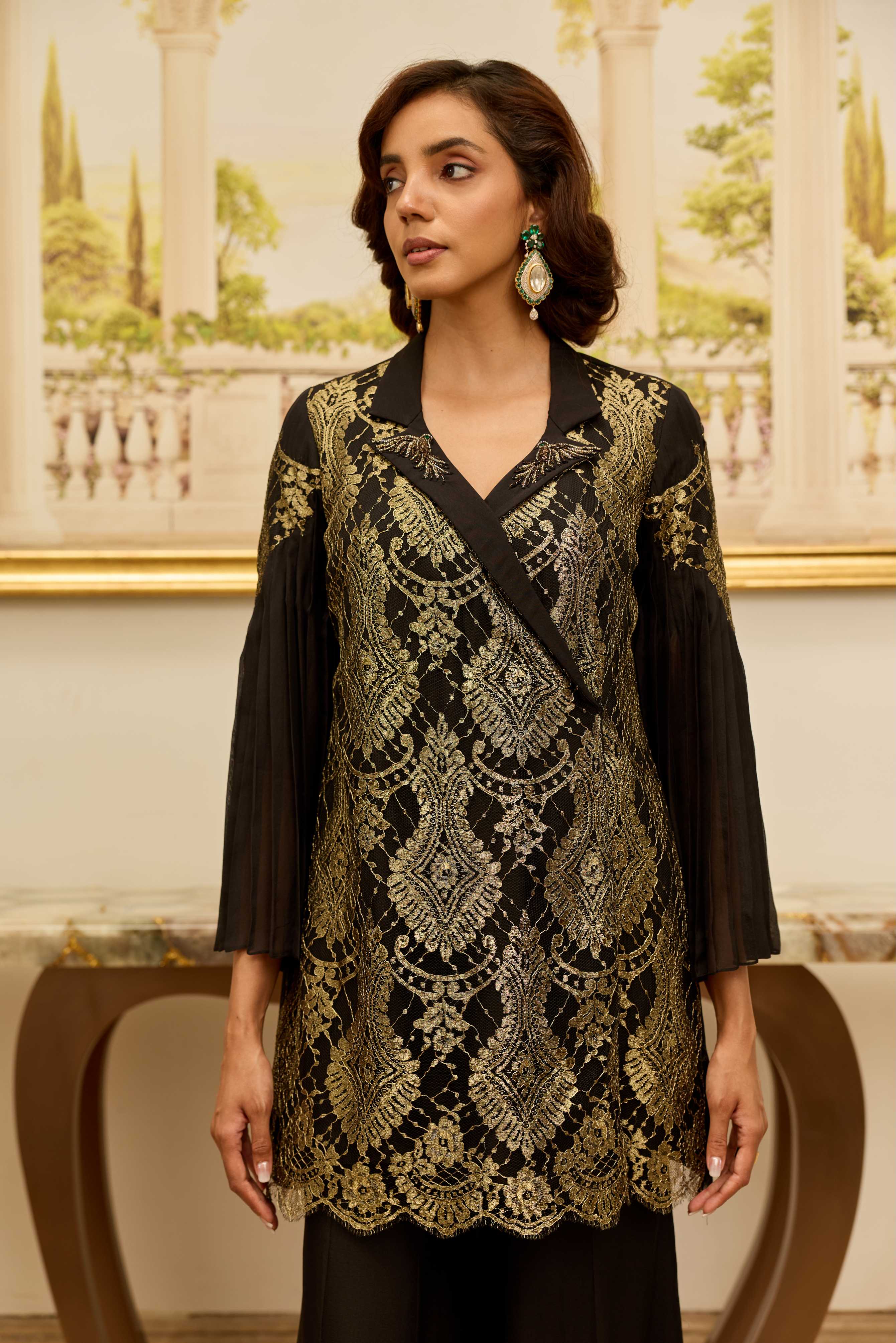 Crafted from 100% pure flat Chiffon, this co-ord set features a wrap-style Angrakha top and high-waisted bell-bottom trousers in classic Black. It is adorned with French lace certified by Dentelle de Calais-Caudry® on the front, back, and sleeves, creating an elegant, full-lace statement. Subtle hand embroidery graces the collar, while pleated sleeves and a fluid silhouette lend a striking finish, making it a standout ensemble for formal evenings.