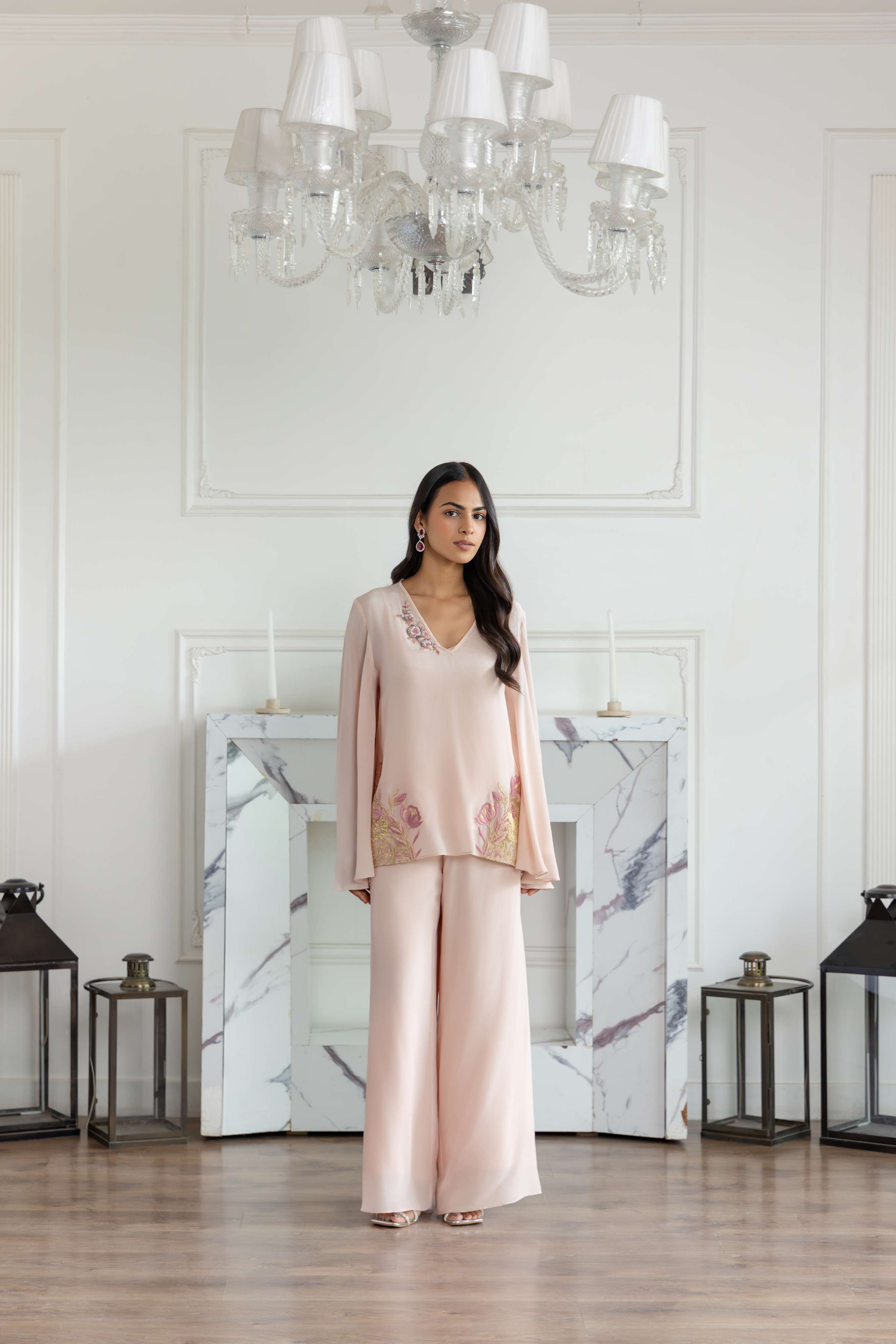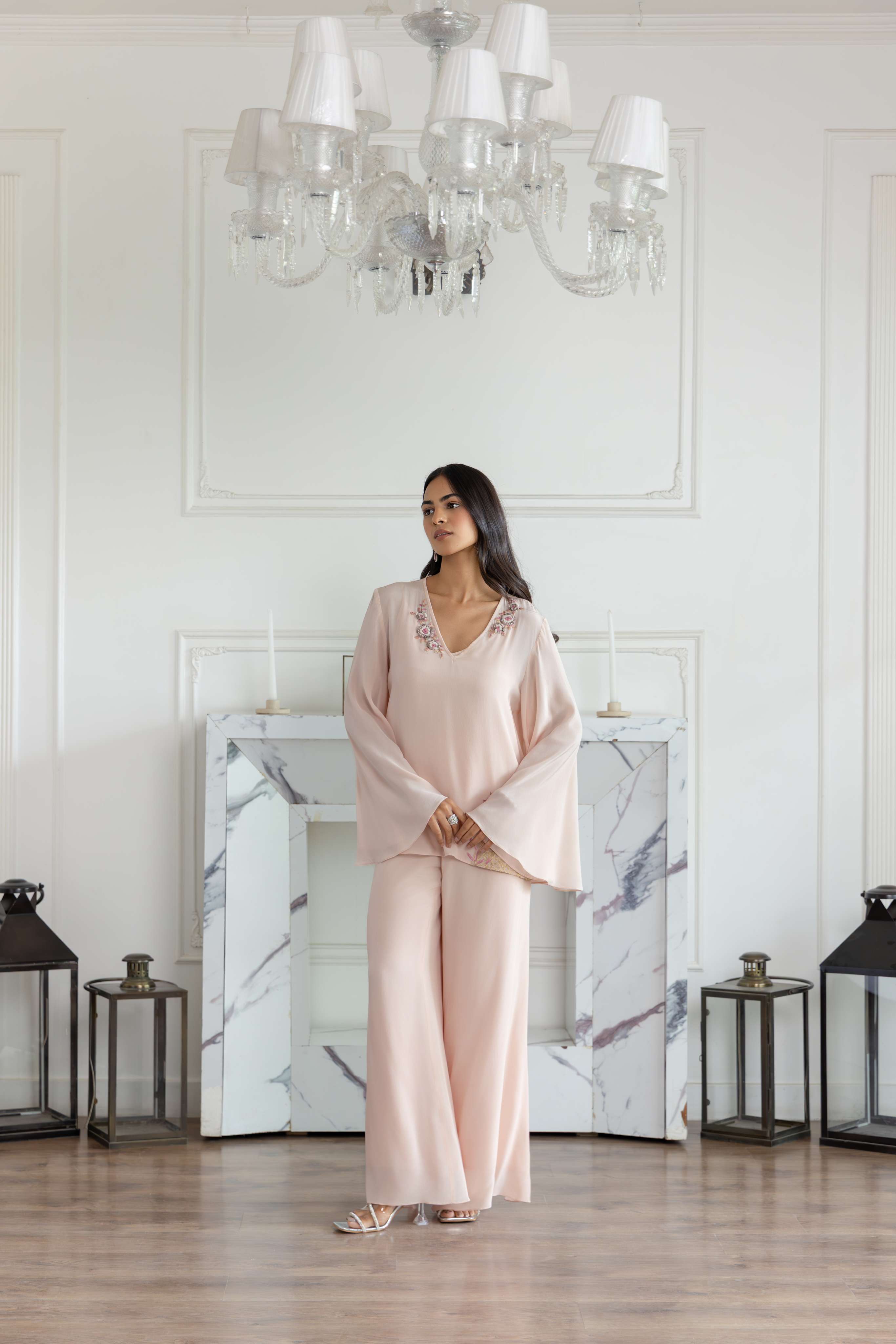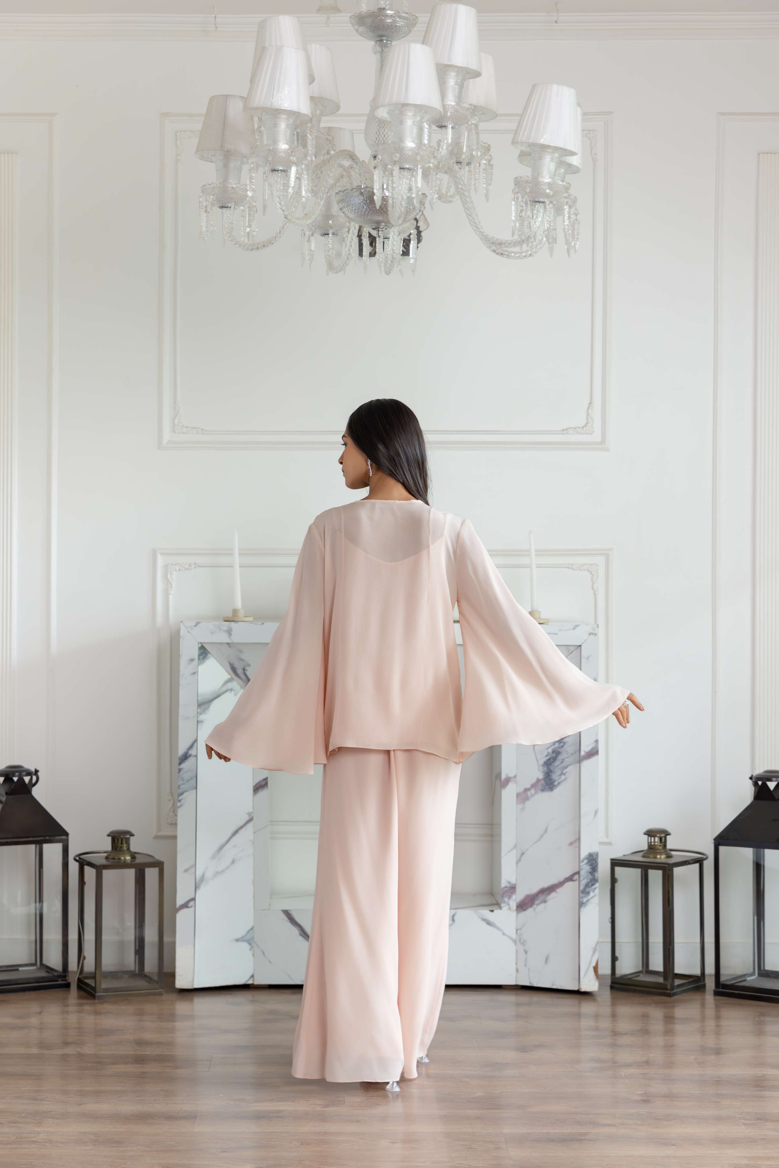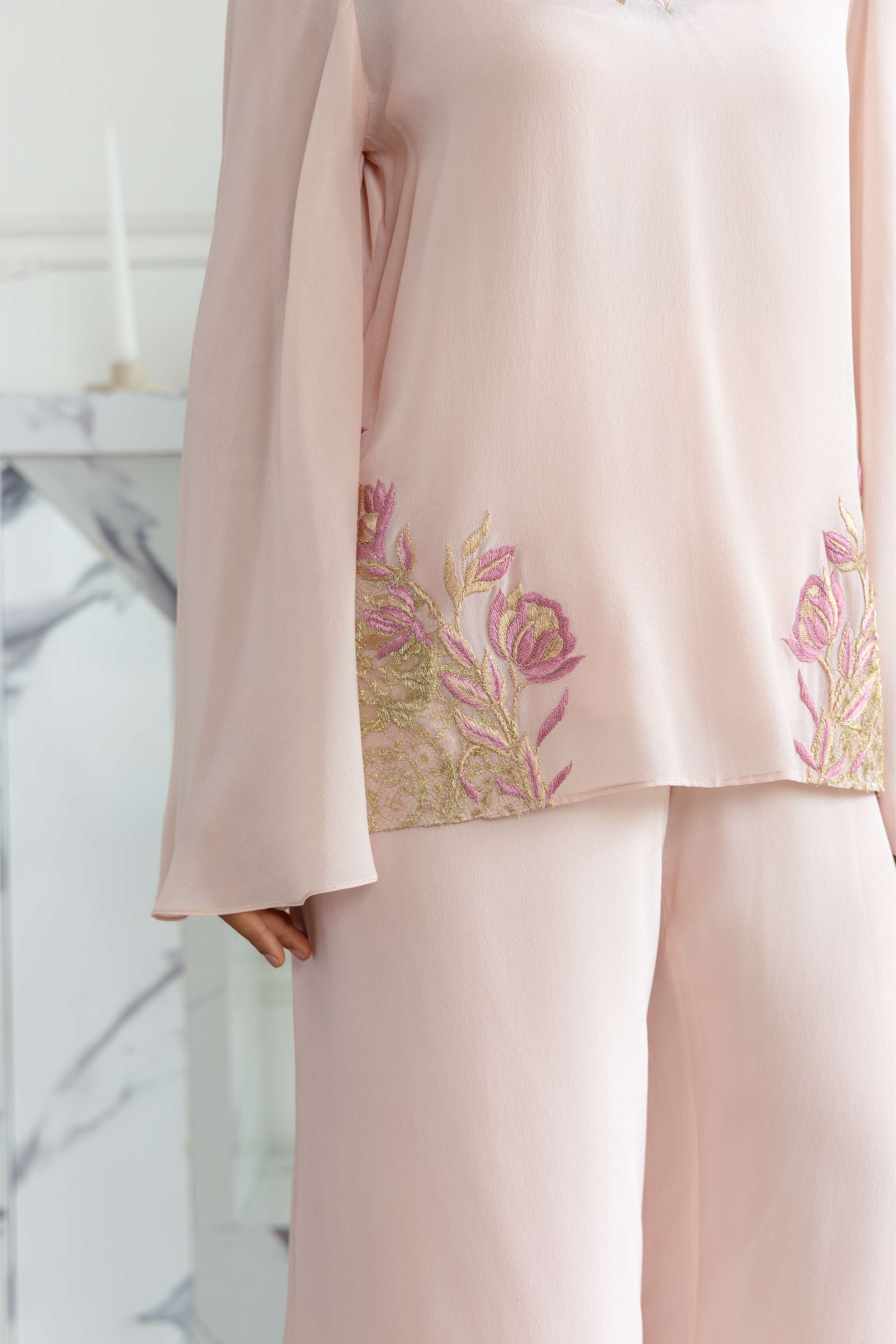 Made in 100% Crepe Silk, the Blossom Pink Co-ord Set includes a Crepe blend slip and straight-fit pants in pure Crepe, with a graceful flare at the bottom. The ensemble is elevated with the signature Dentelle de Calais-Caudry® Gold metallic lace, enriched with 50 hours of intricate hand embroidery. A delicate interplay of fine pastel threadwork, authentic lace and shimmering bead and cutdana detailing at the neckline adds a touch of refined artistry. Finished with flowy bell sleeves and a straight hem, the set offers graceful allure with a contemporary edge. Perfect for brunches, garden parties or casual gatherings.