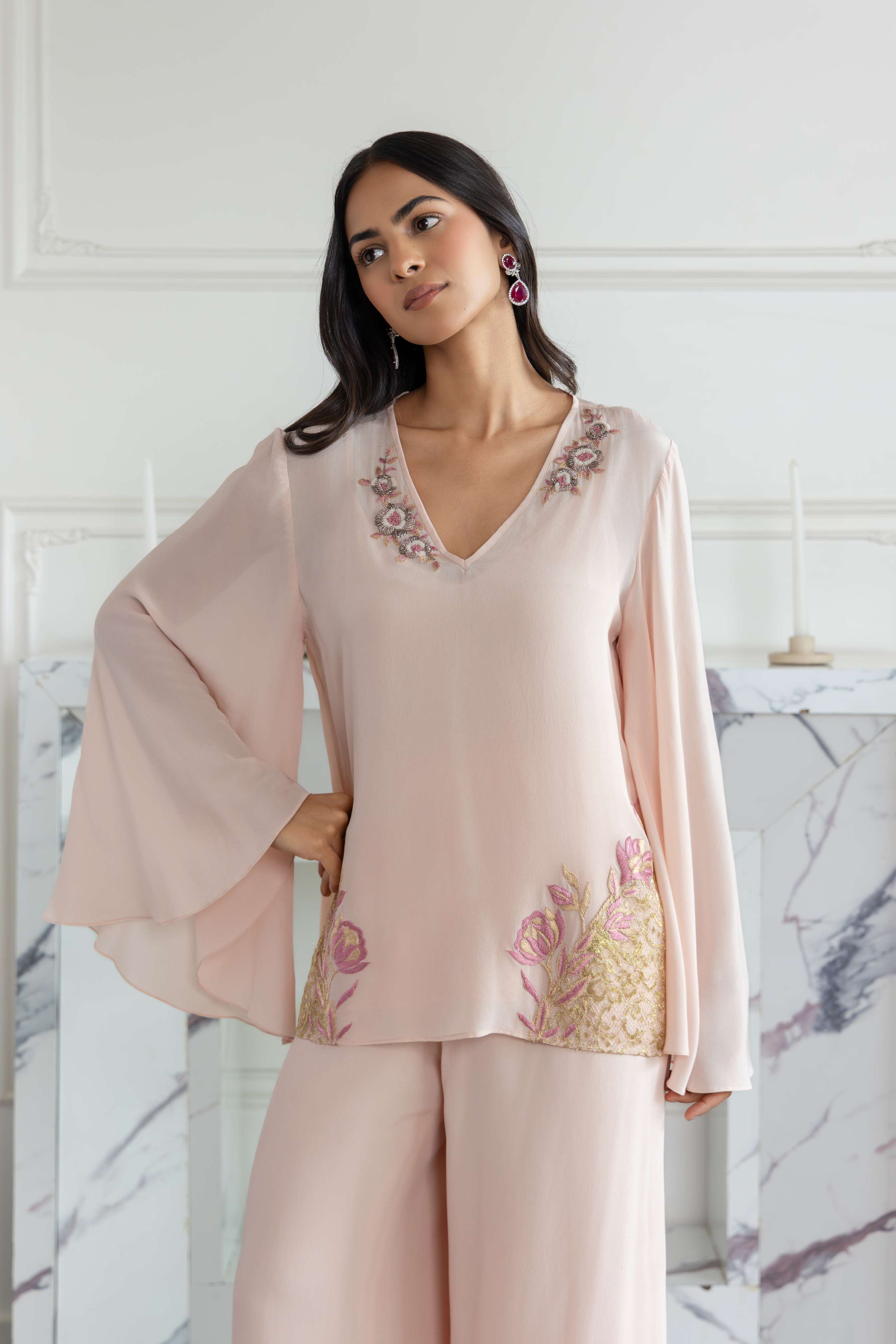 Blossom Pink co-ord set in Crepe Silk with Gold lace, hand embroidery, and elegant straight-fit pants.