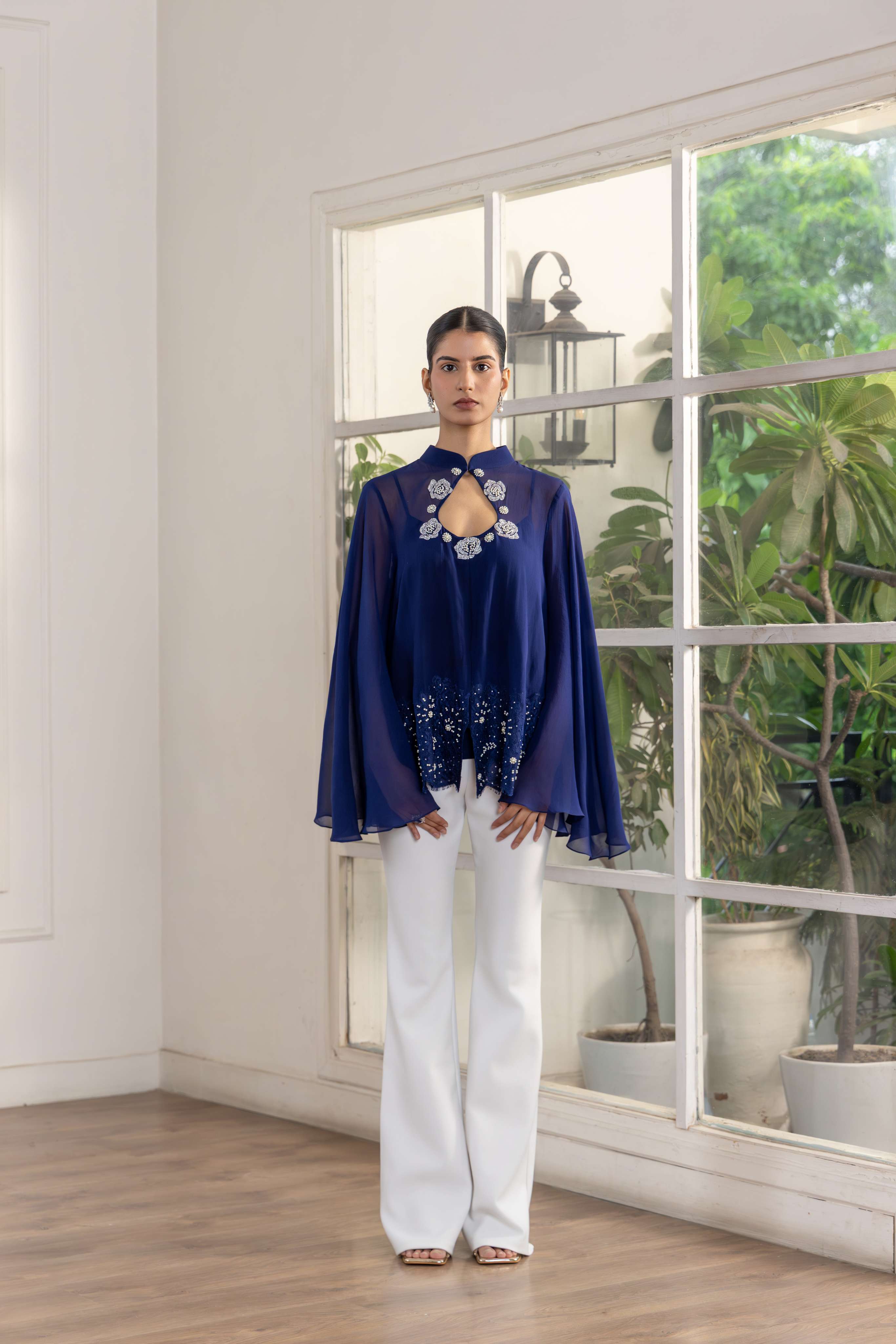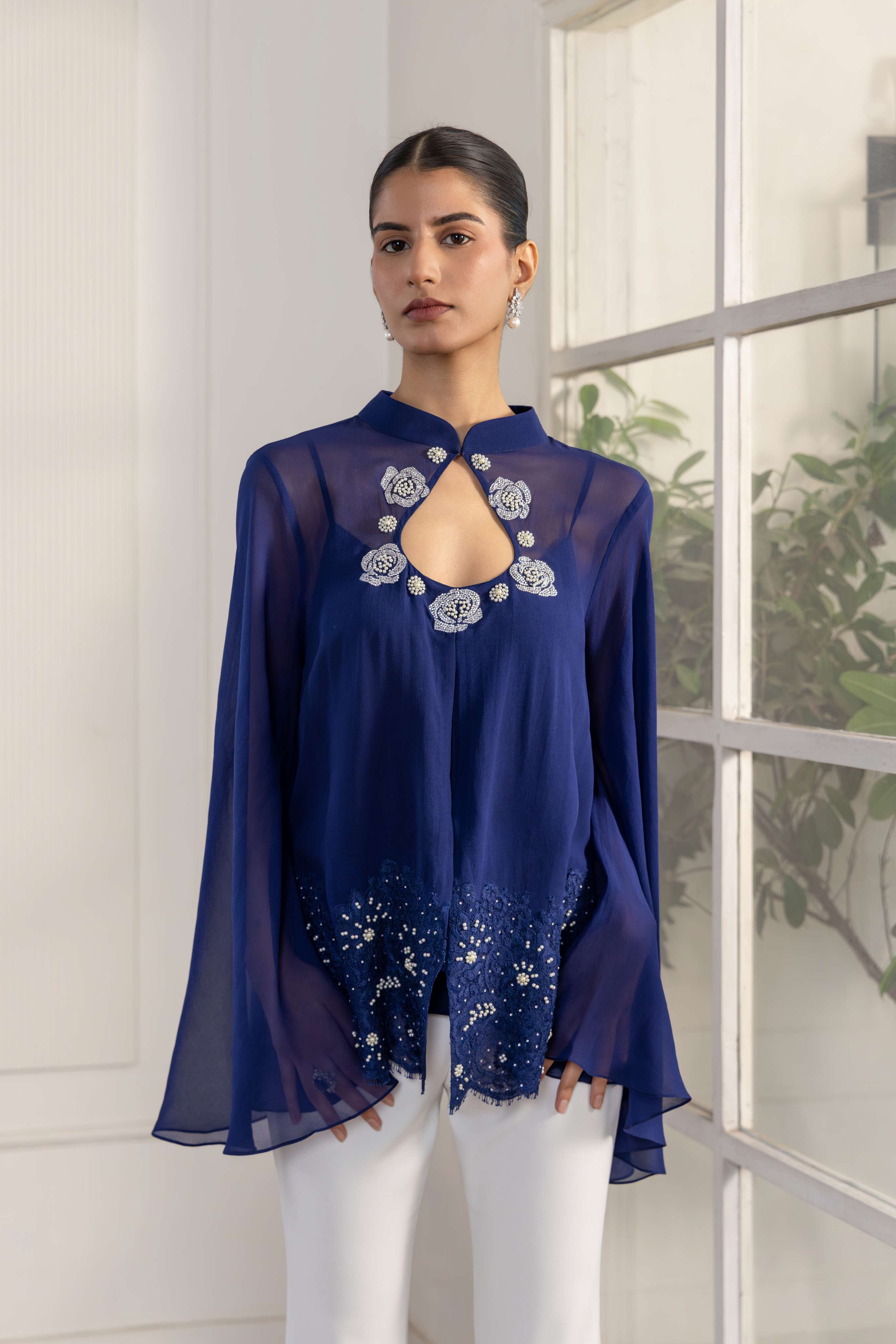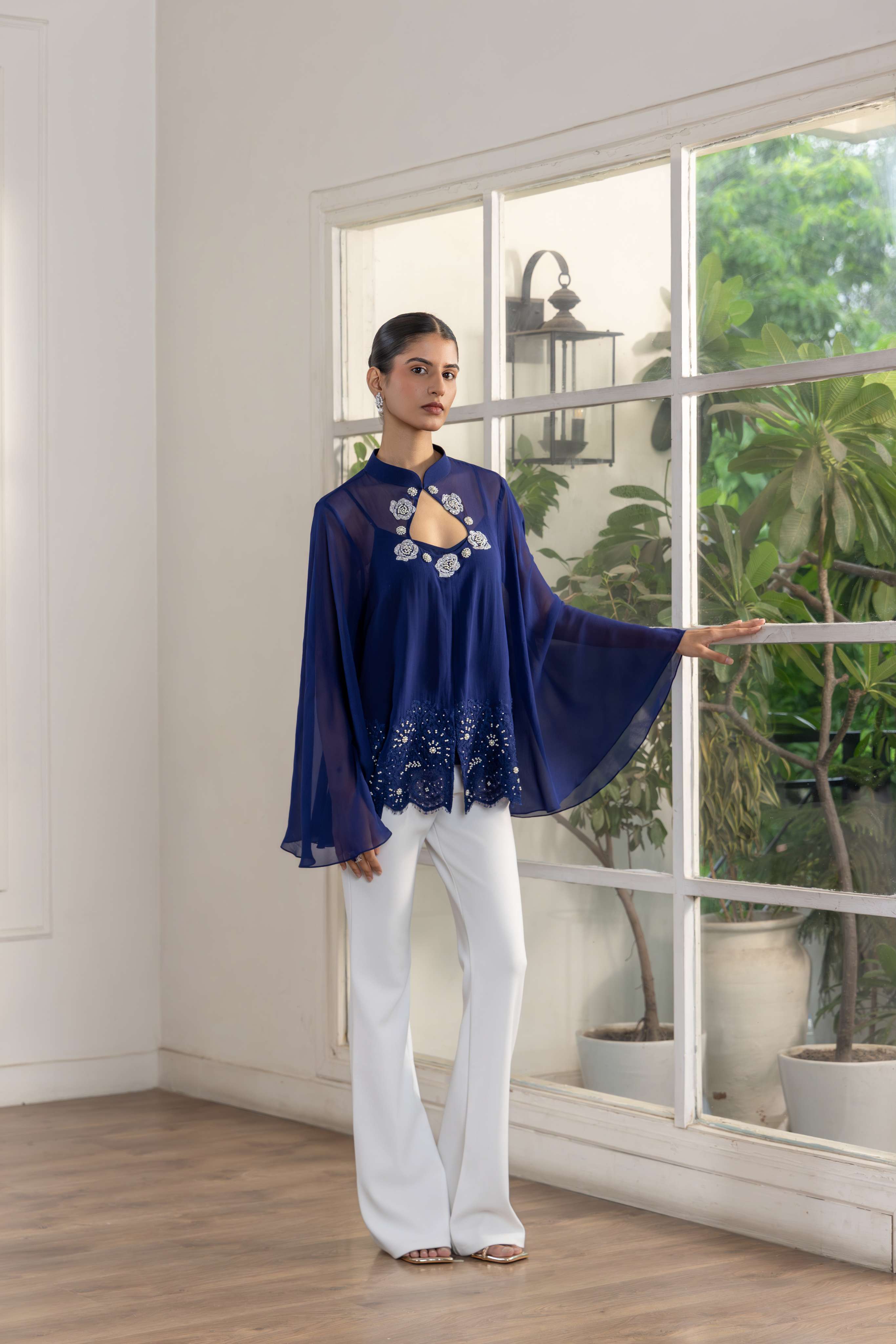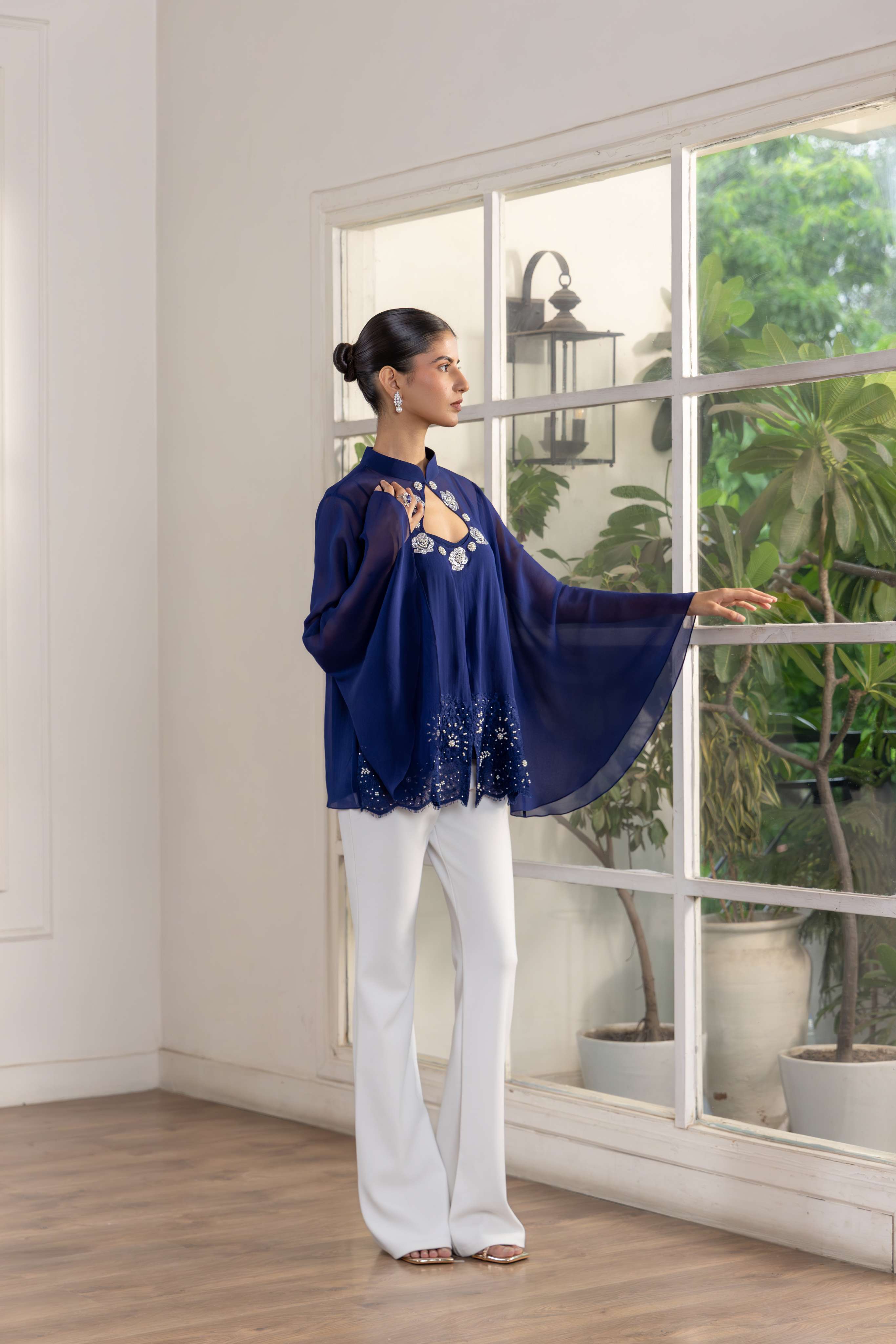 Crafted in 100% Georgette Silk, this Blue dress is elevated with 30 hours of delicate hand embroidery, featuring Swarovski flowers, pearls, and intricate lace highlighting. The scalloped lace hem adds a refined finish, while flowy bell sleeves and a soft triangle cut create movement and ease. A buttoned neckline completes the look, balancing elegance with modern charm, making it an ideal choice for evening gatherings, celebrations or intimate soirées.