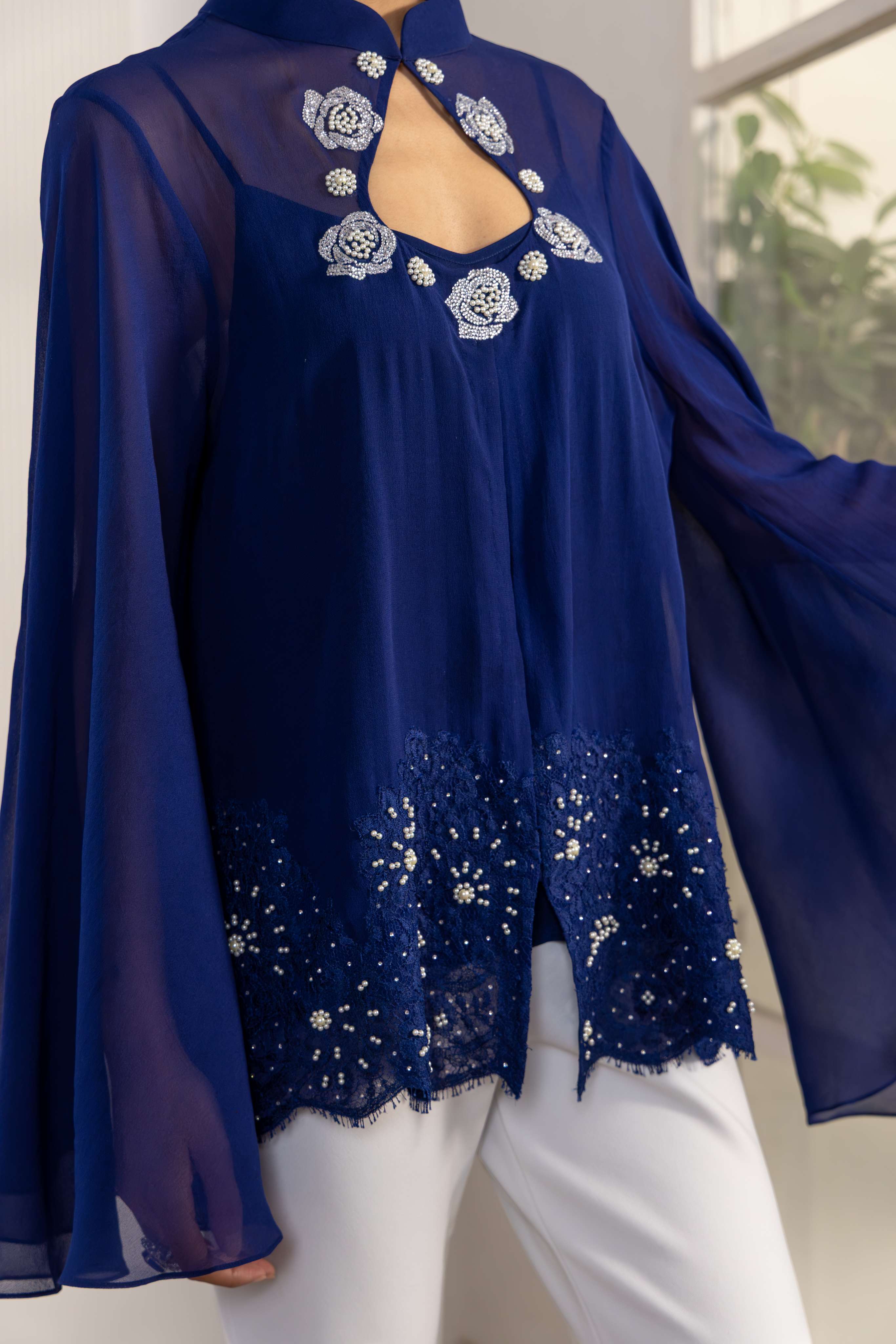 A graceful Blue Georgette Silk dress, adorned with Swarovski flower embroidery, pearls, and scalloped lace for a refined feminine statement.