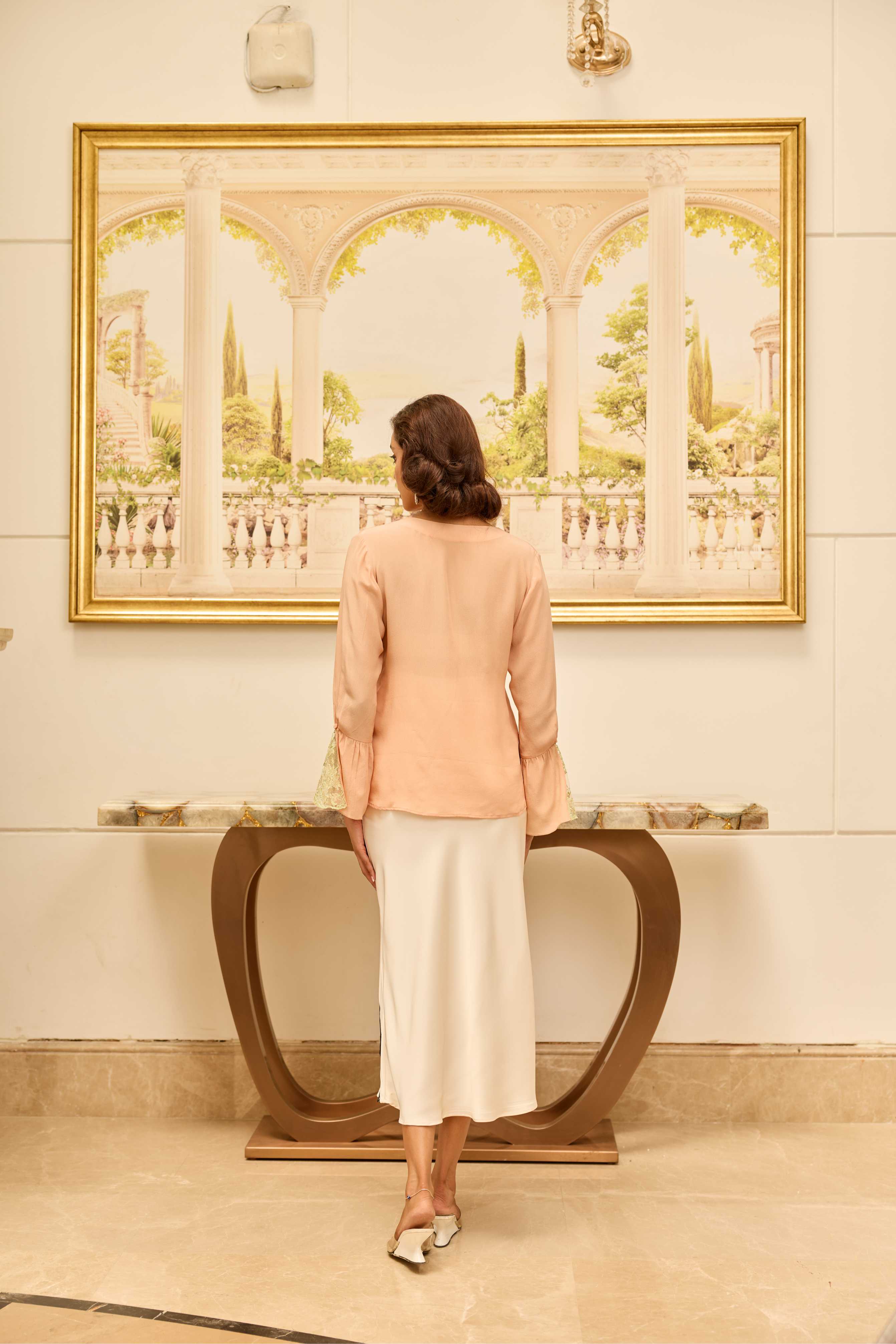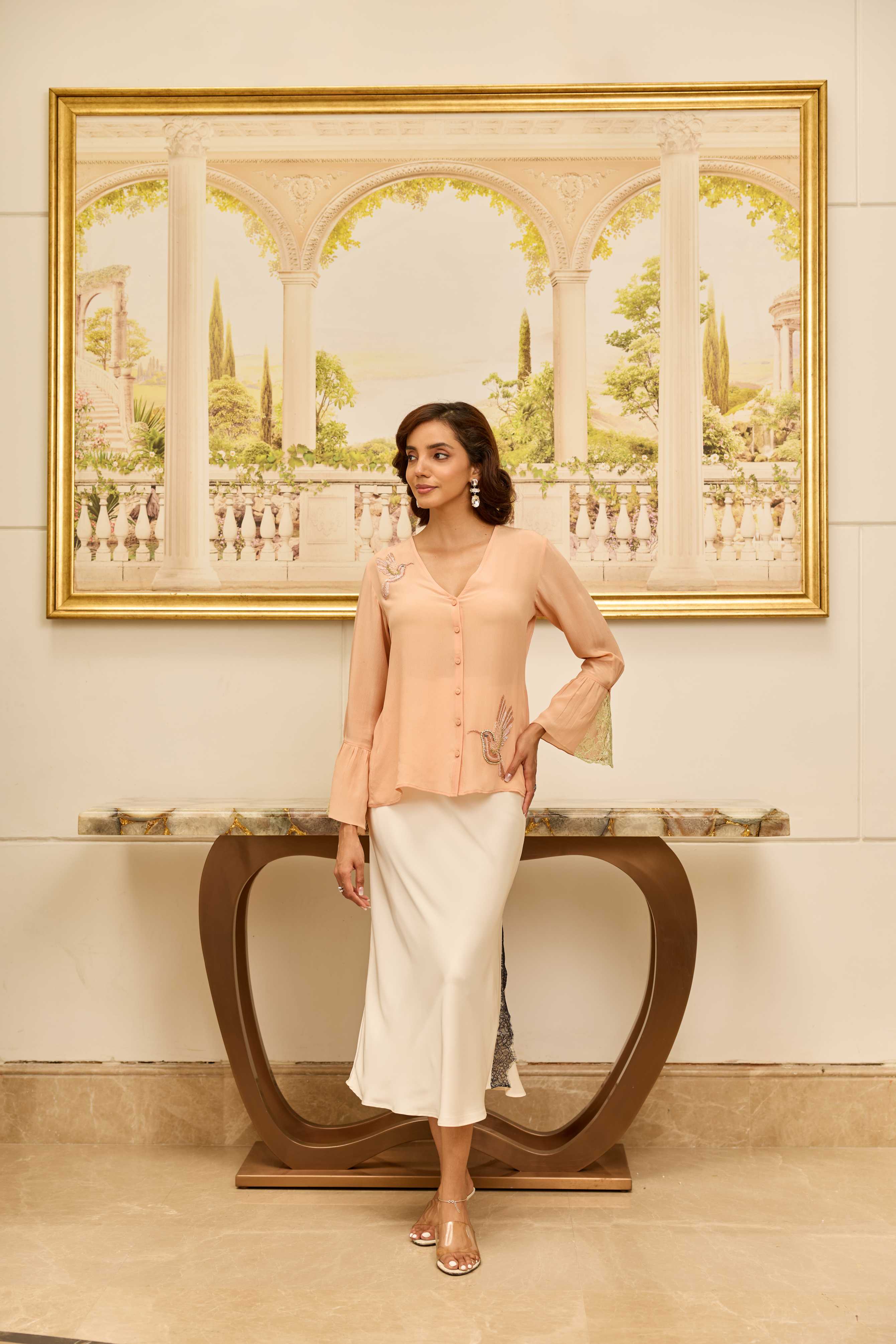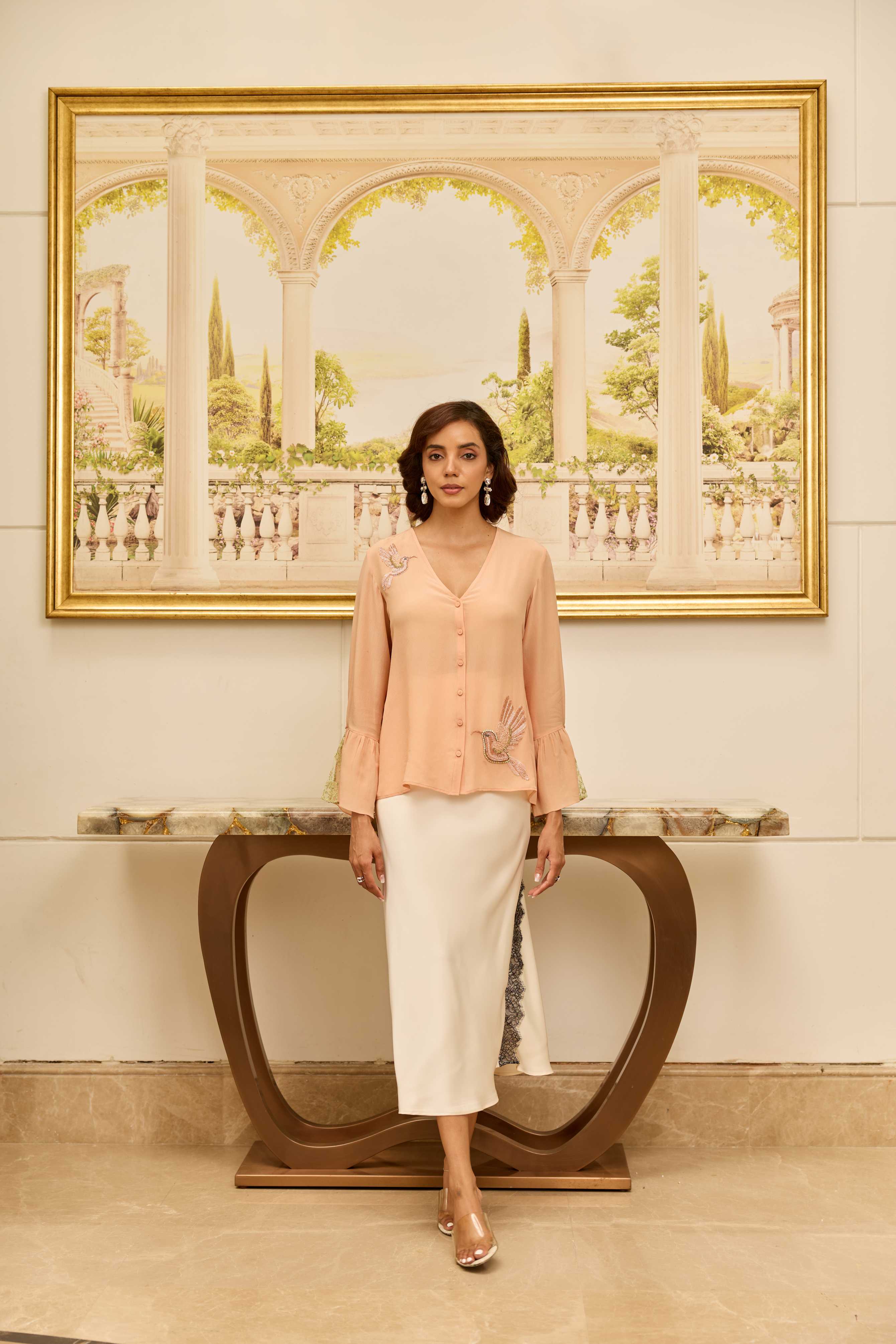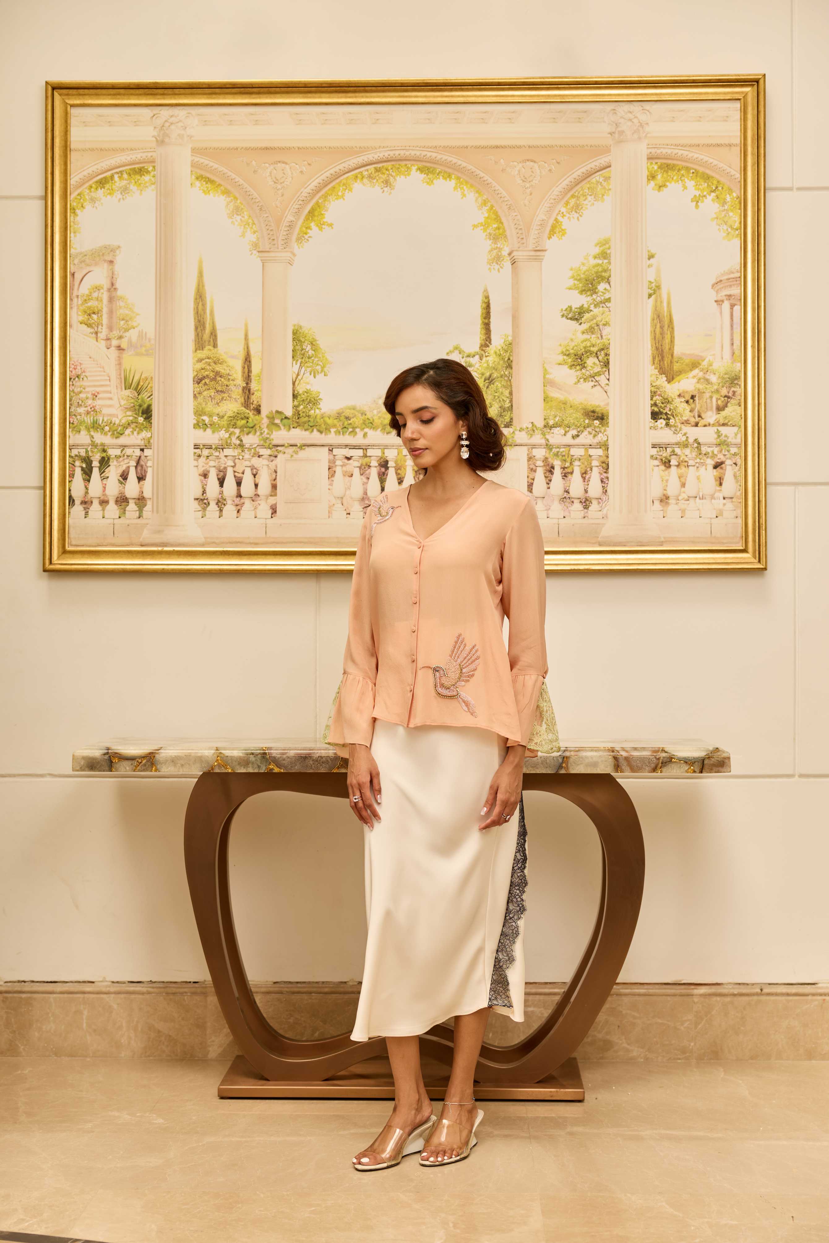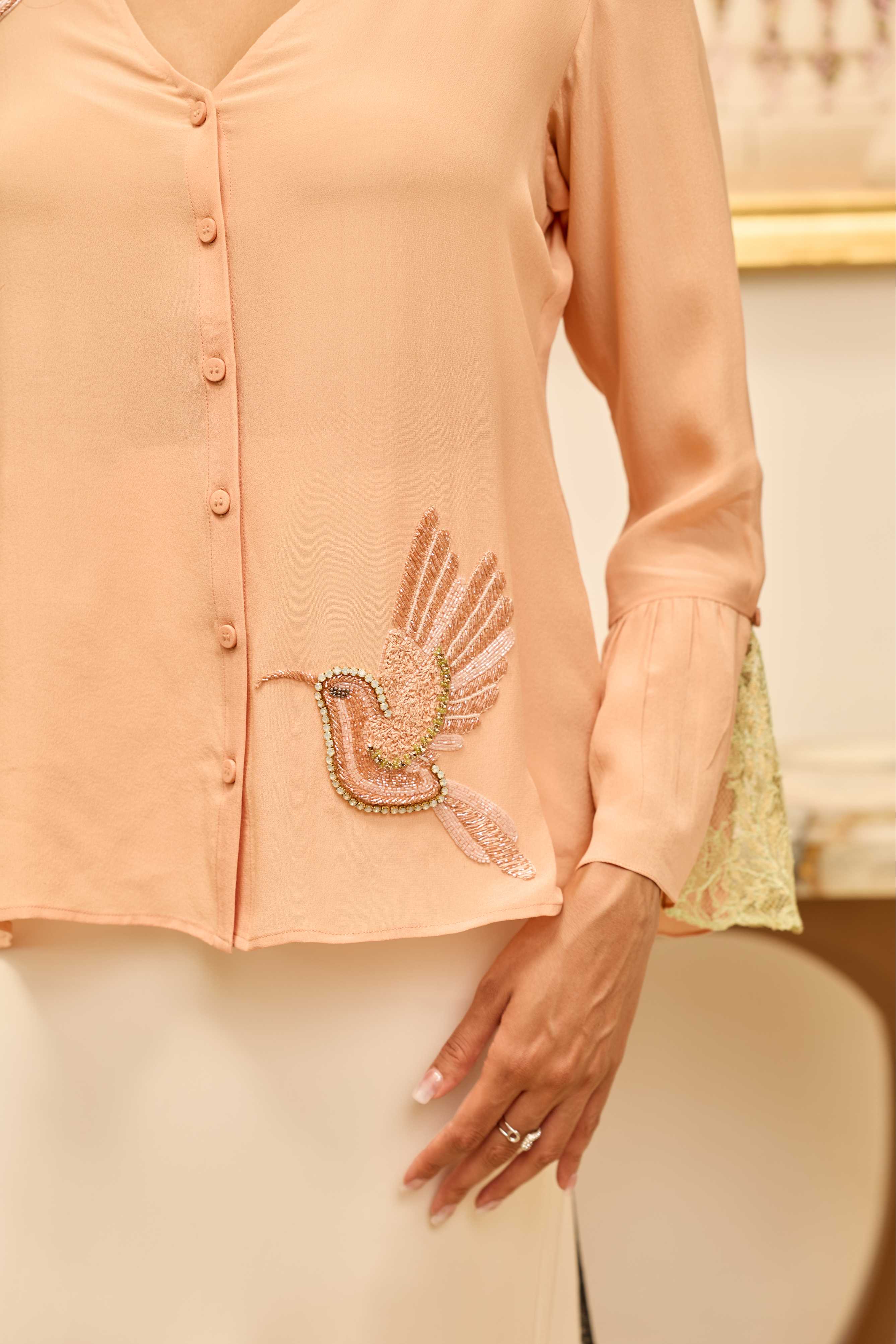 A peach crepe silk shirt adorned with hand-embroidered bird motifs and lace-inset sleeves, creating a graceful statement for daytime elegance.