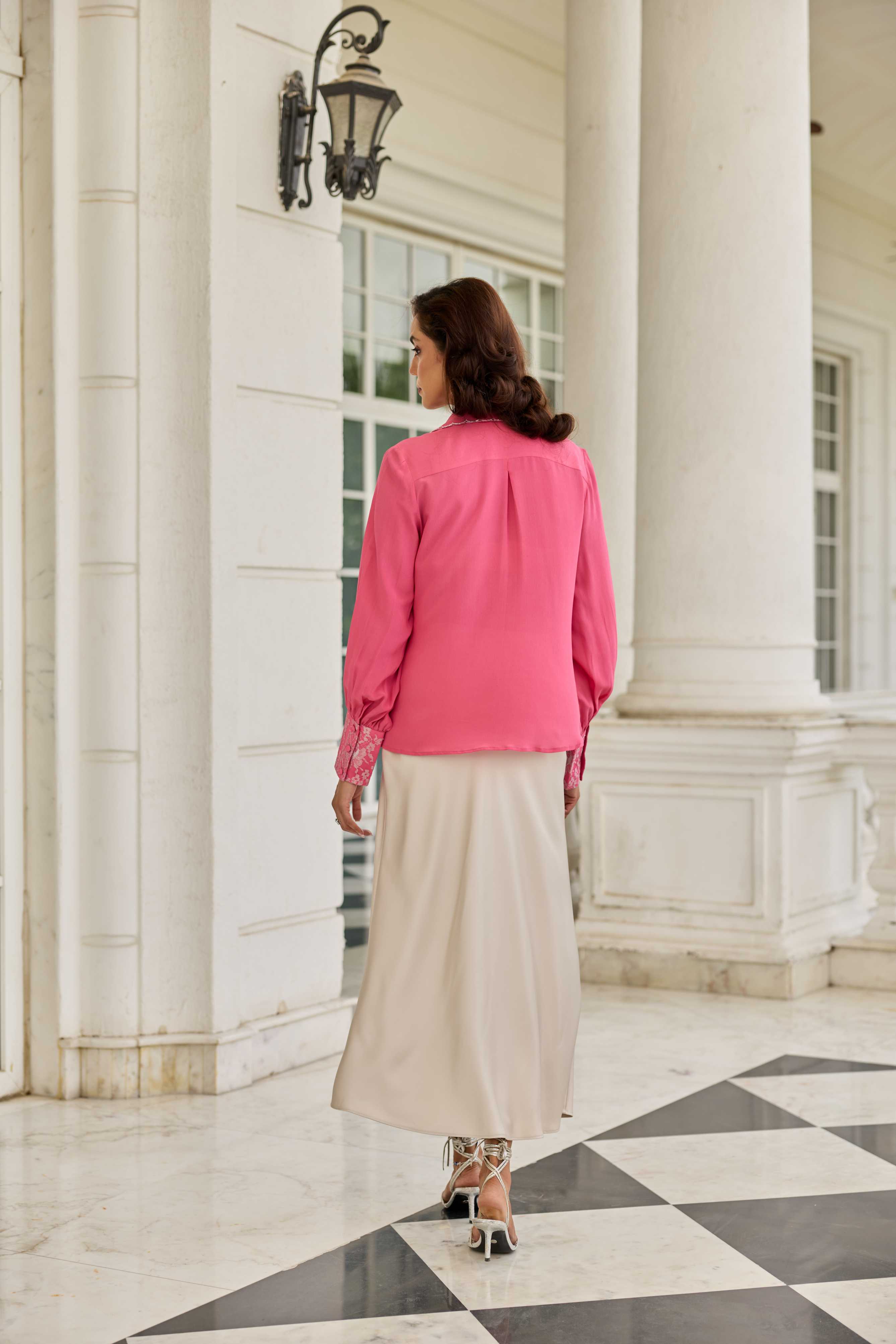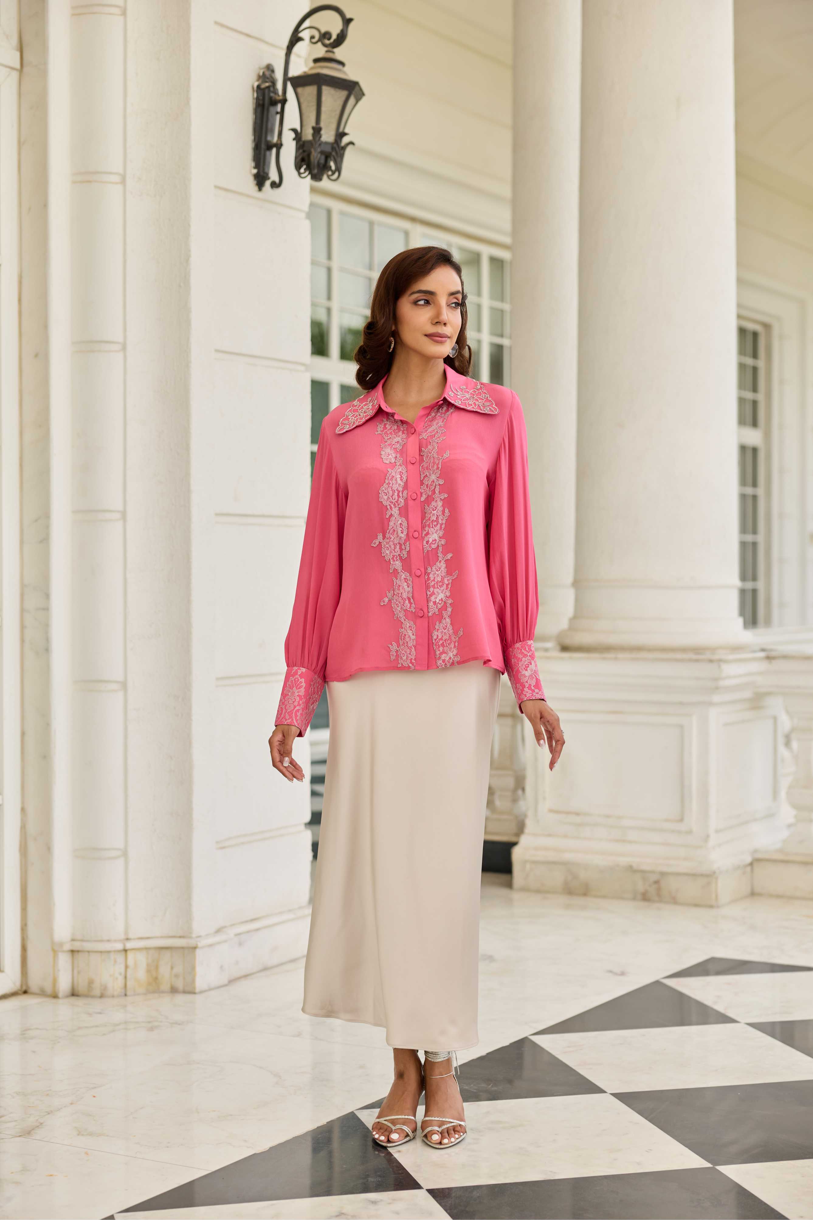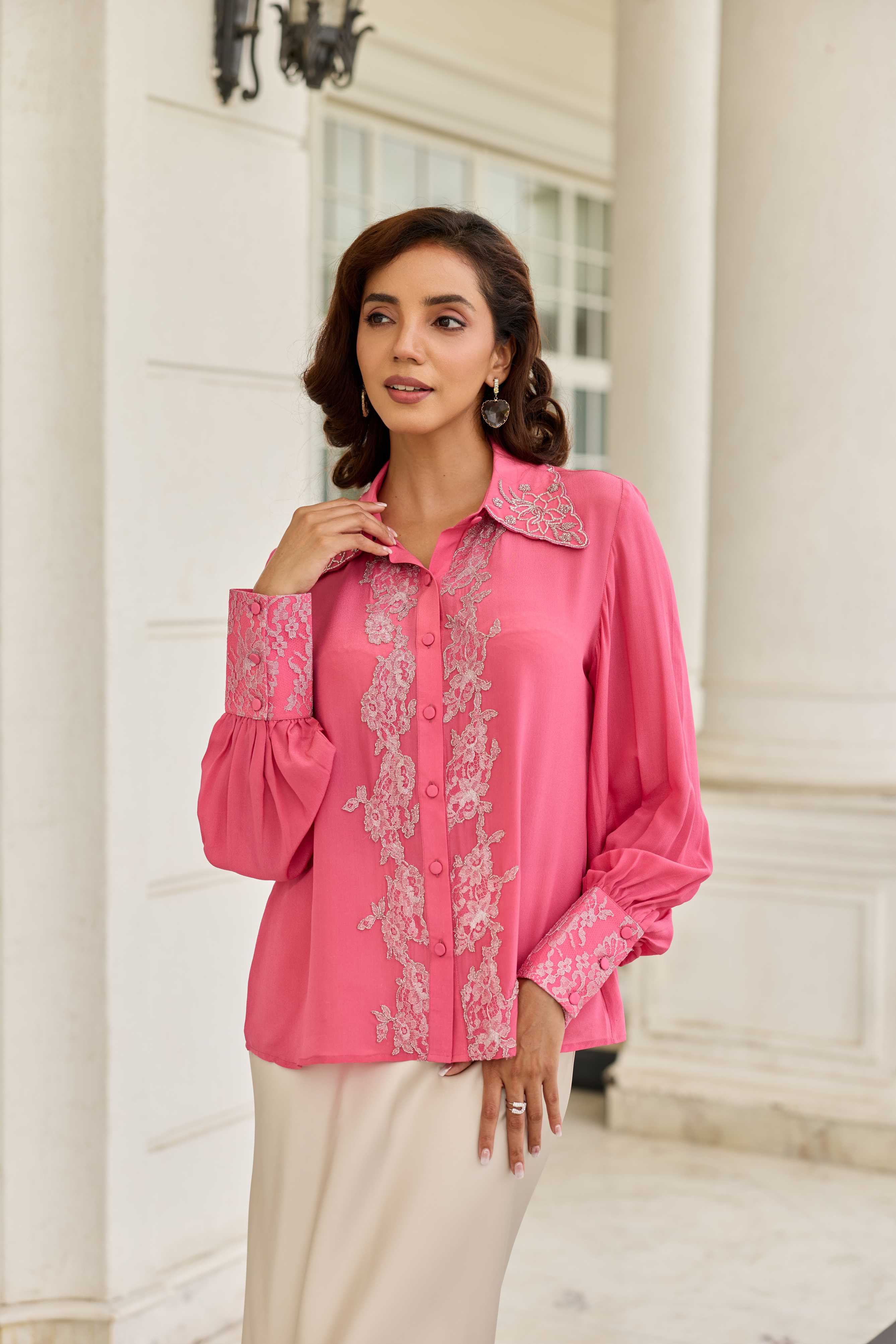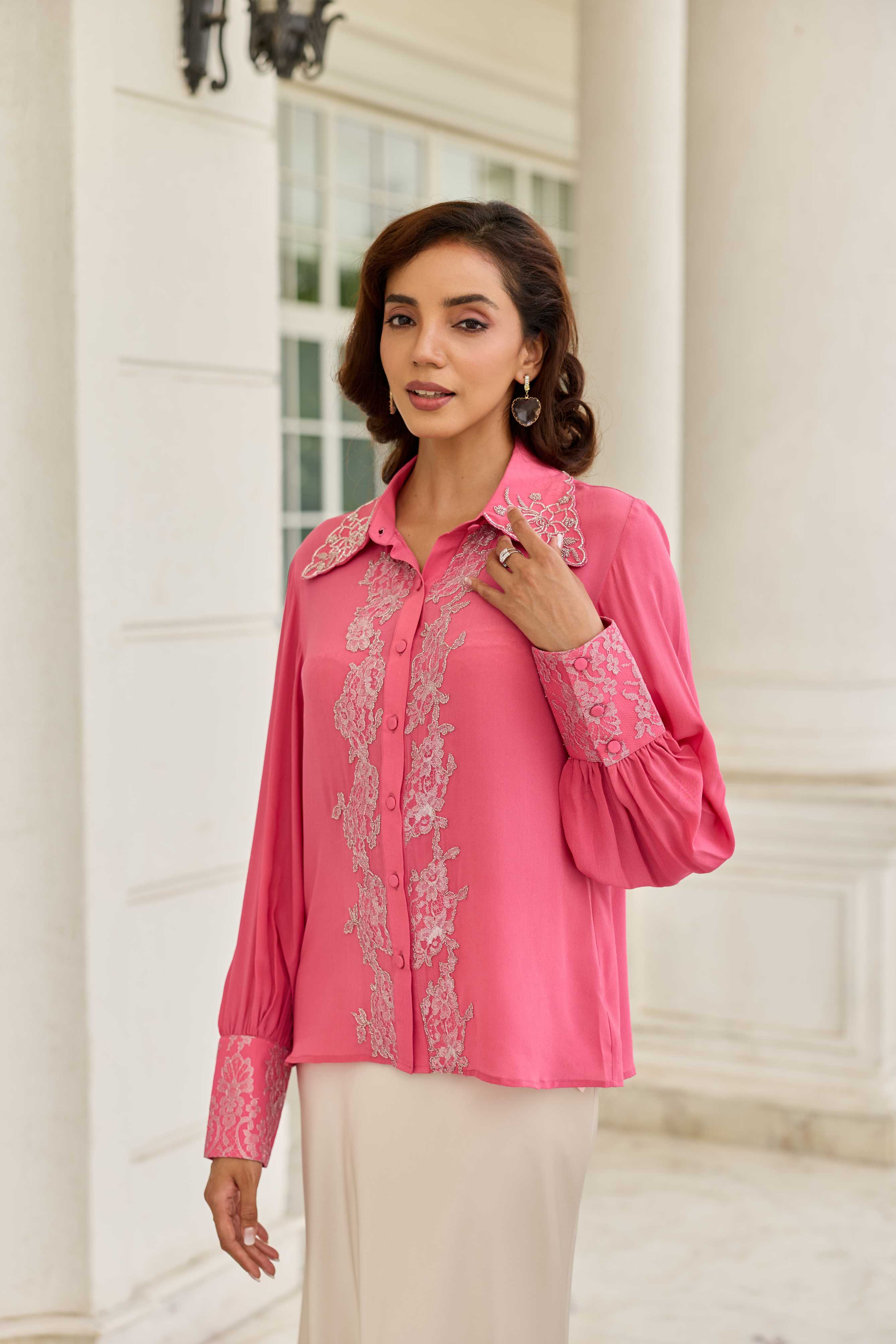 In 100% pure Silk Crepe, this relaxed-fit shirt in vibrant Fuchsia Pink features certified French lace by Dentelle de Calais-Caudry®. Delicate French lace runs along the placket, enhanced with subtle cutdana embellishment, while the scalloped collar dazzles with hand embroidery in cutdana and beads. Finished with French lace cuffs, it’s the perfect blend of artisanal detail and modern femininity. Ideal for refined daywear or intimate evening gatherings.