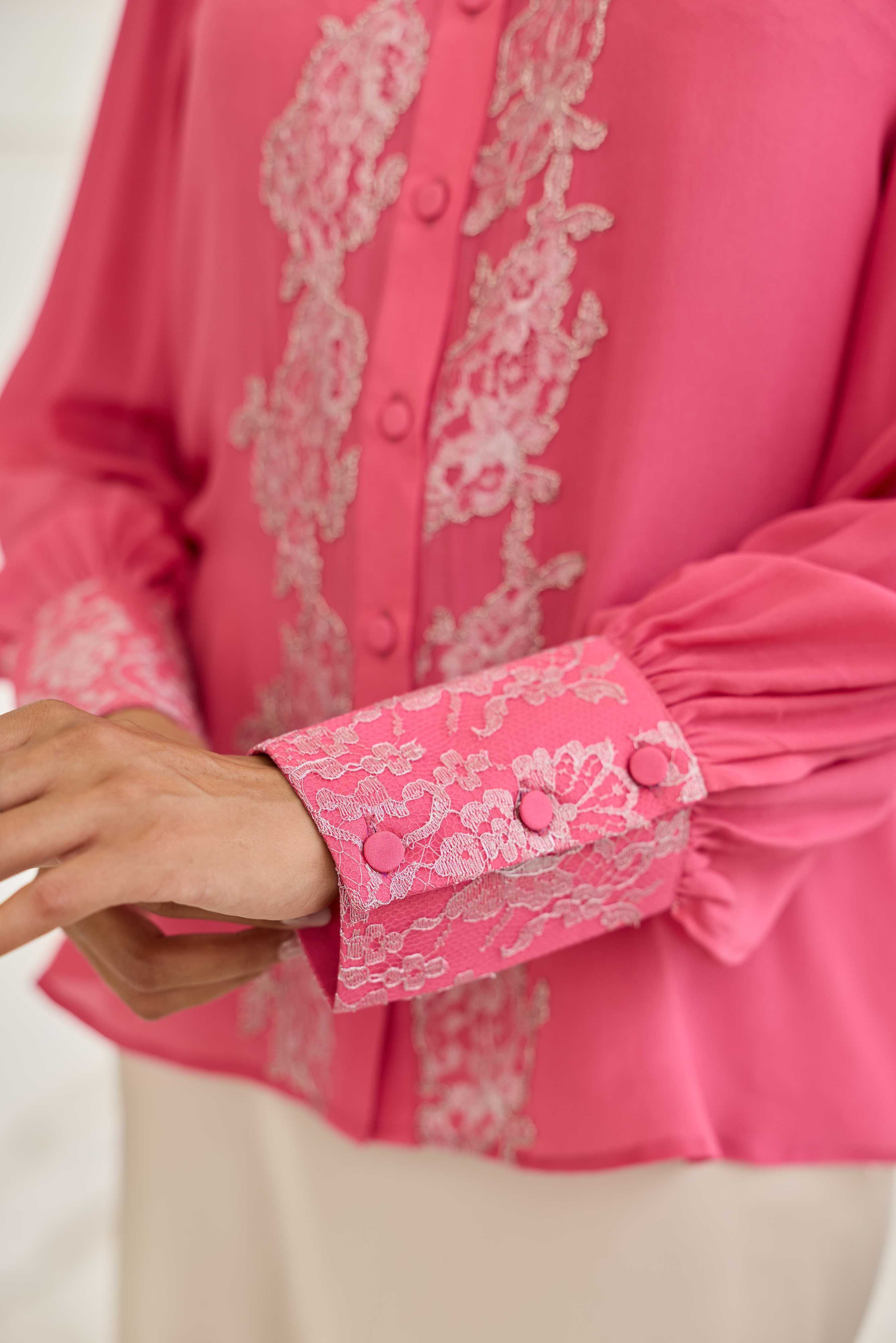 Fuchsia Crepe meets French lace and 30 hours of intricate hand embroidery for a statement of refined romance.