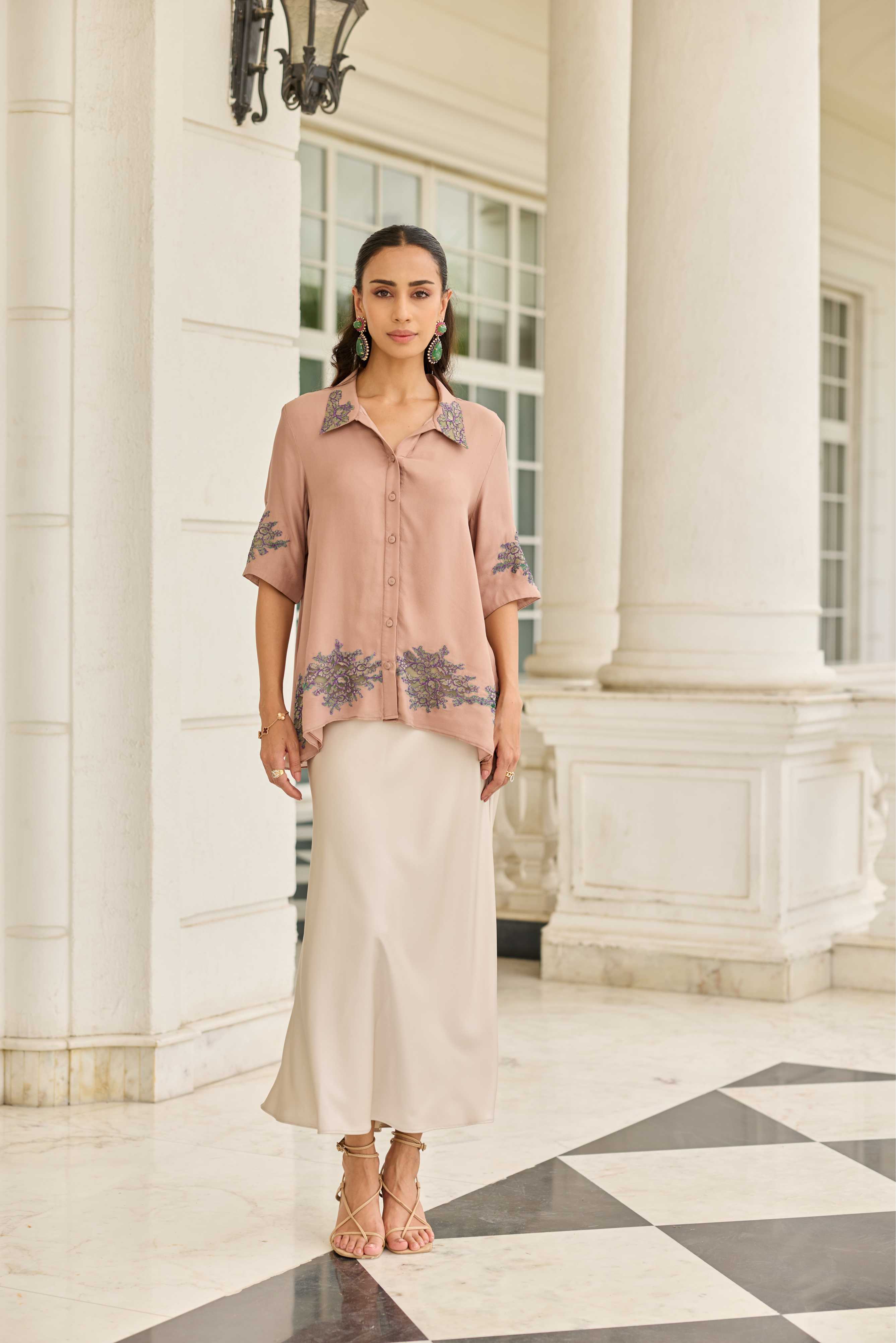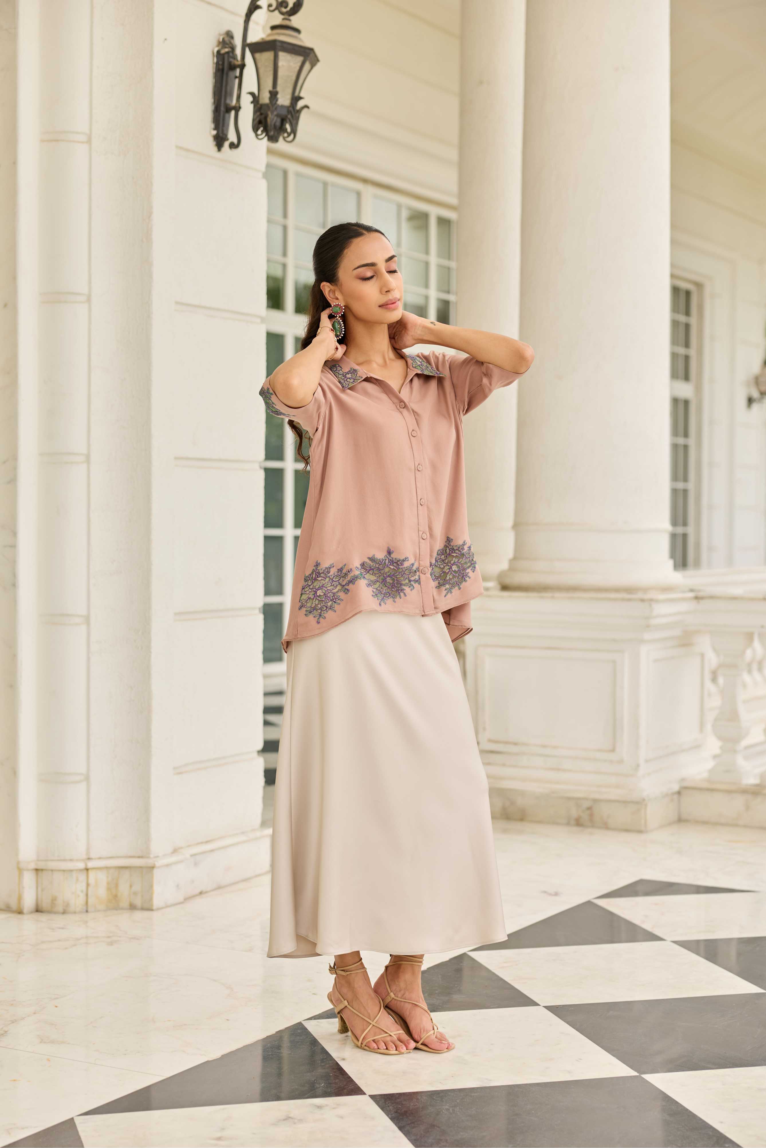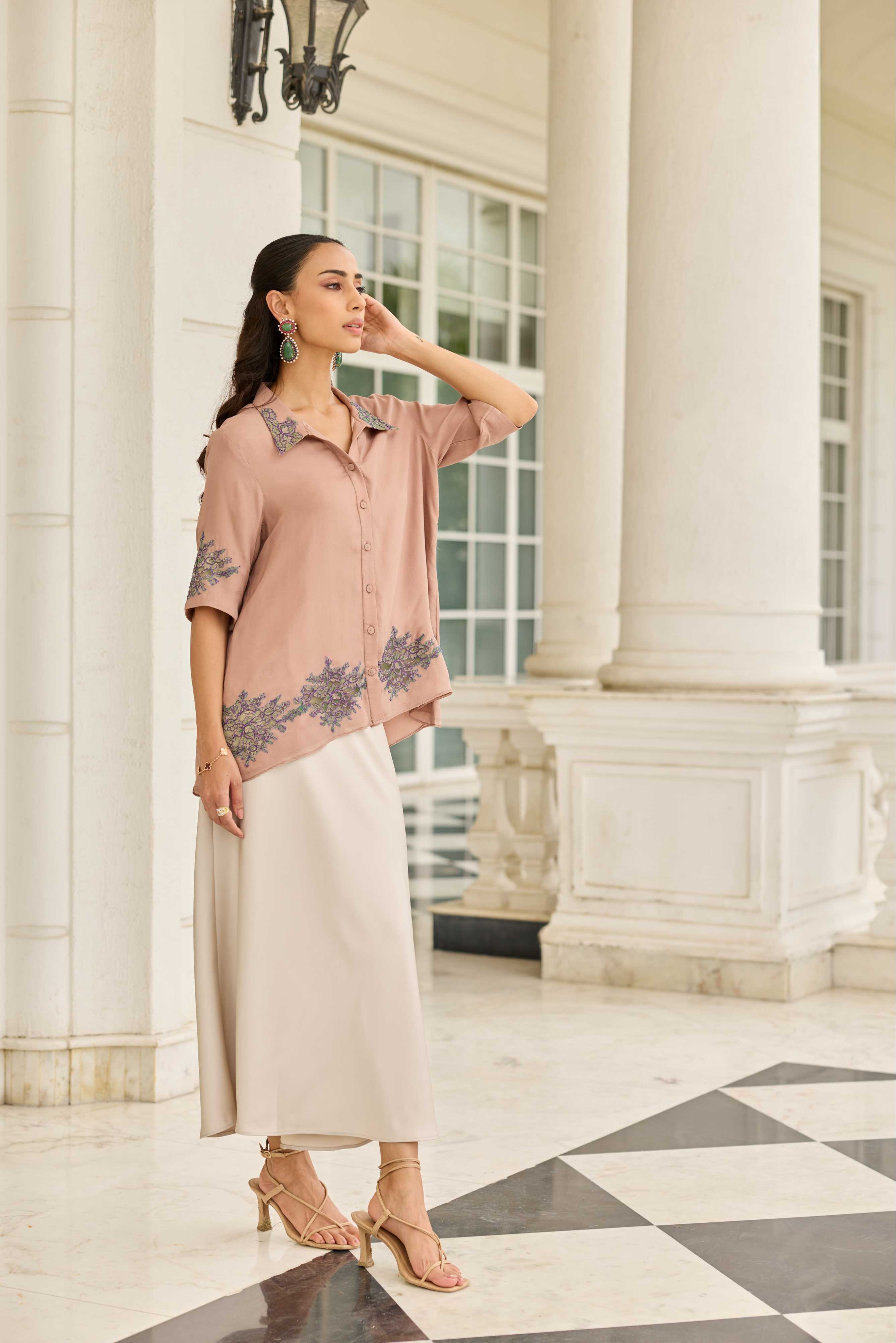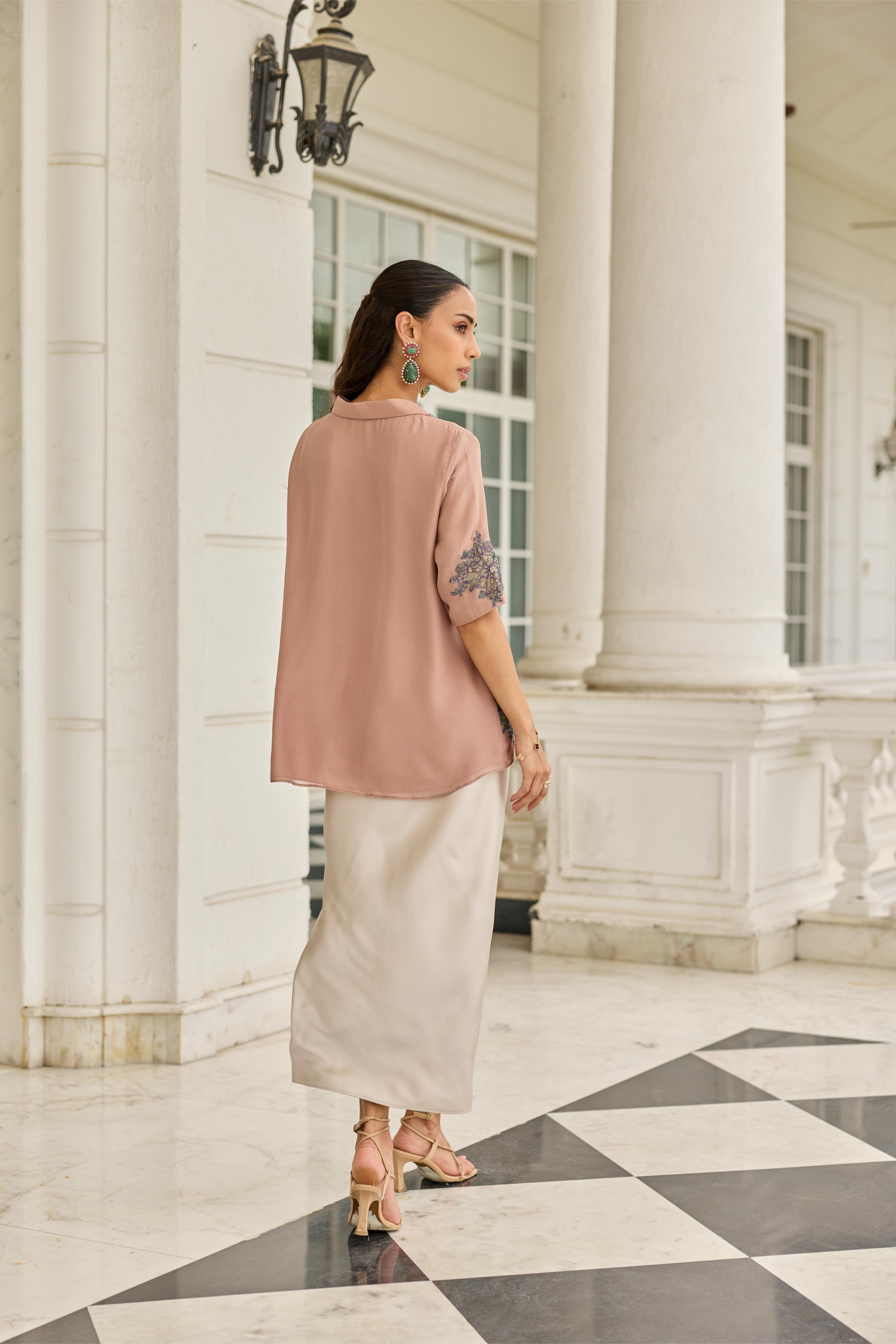 Crafted from airy 100% pure flat Chiffon, this grain Brown shirt is adorned with patches of delicate French lace certified by Dentelle de Calais-Caudry® placed across the collar, sleeves, and hem. The tonal threadwork adds textural richness to its clean silhouette, while the flared hem and soft structure make it a versatile option for polished daytime looks and semi-formal occasions.