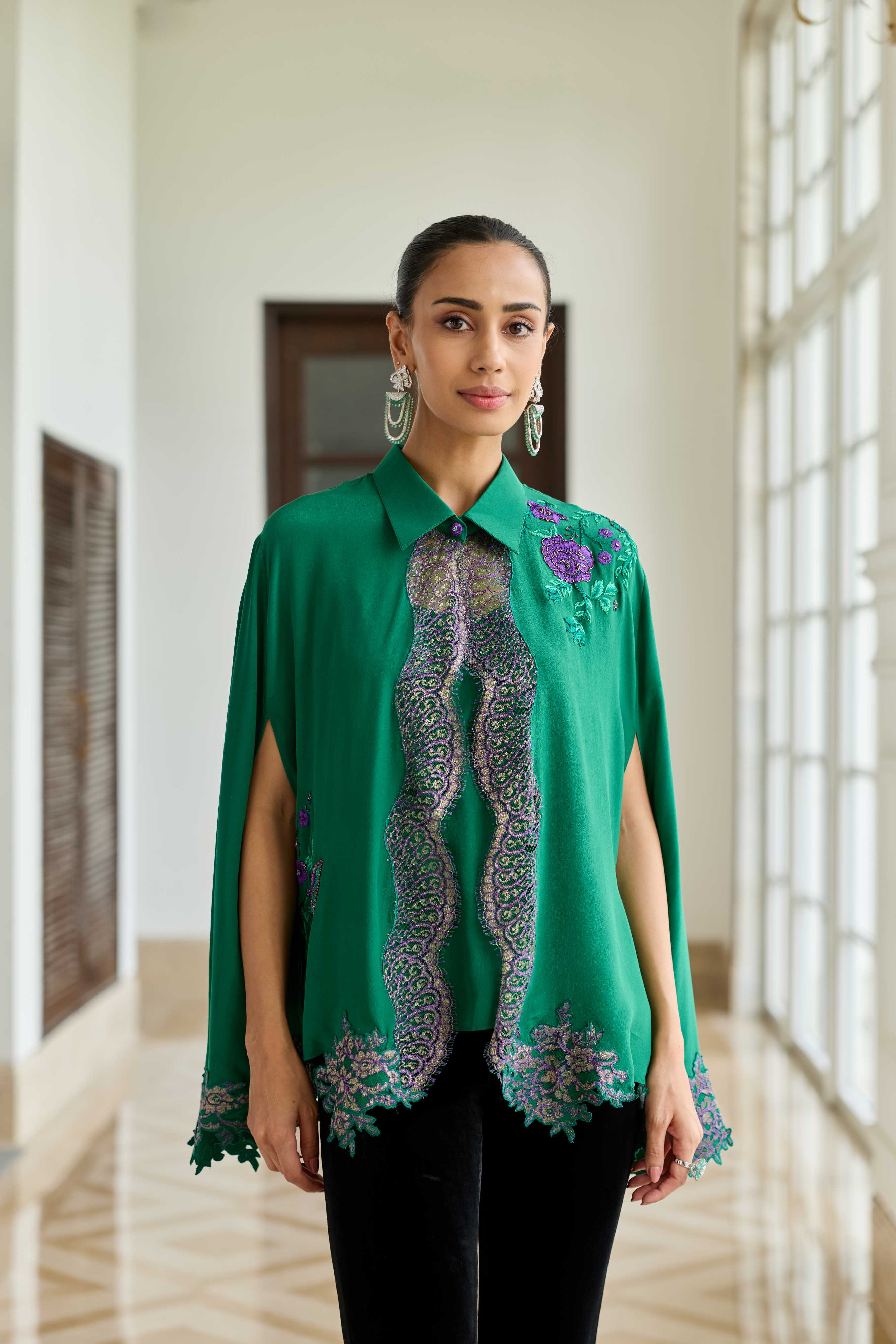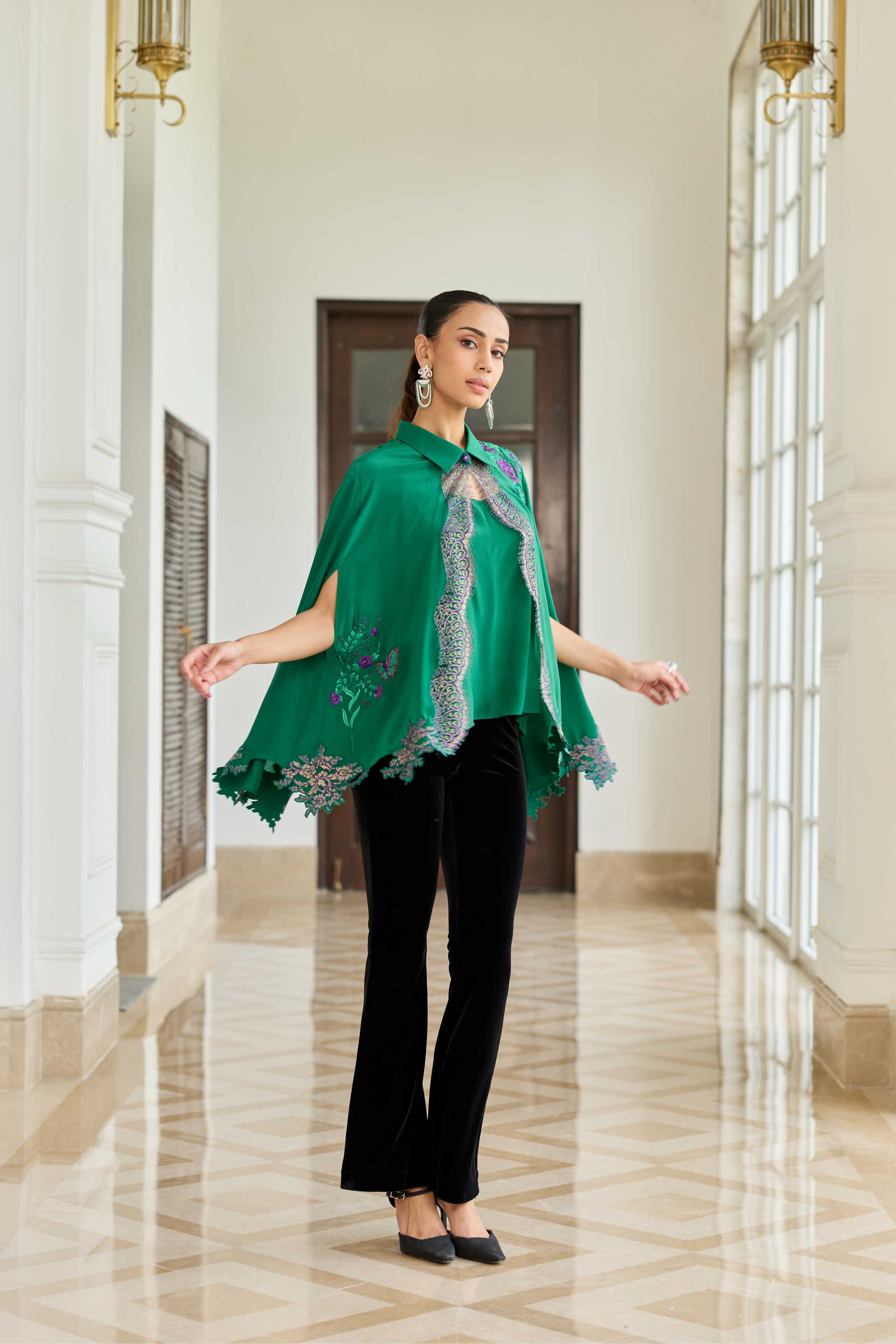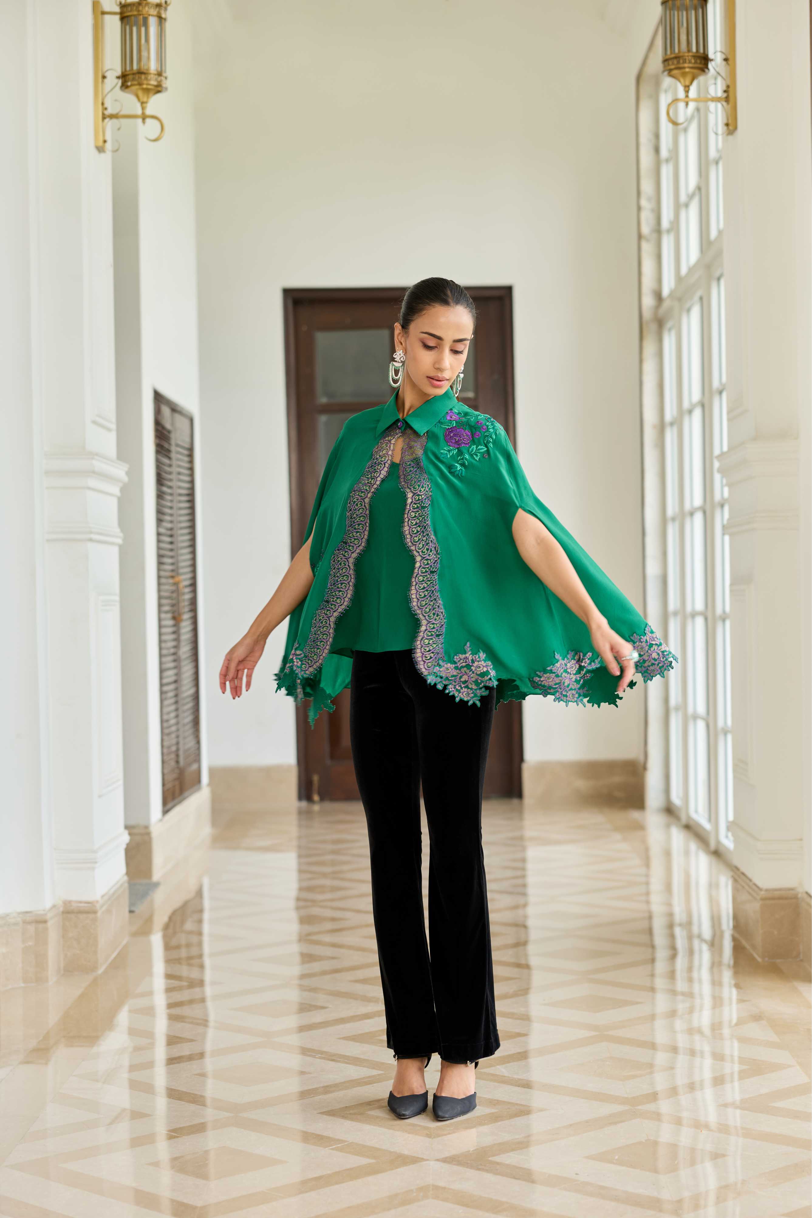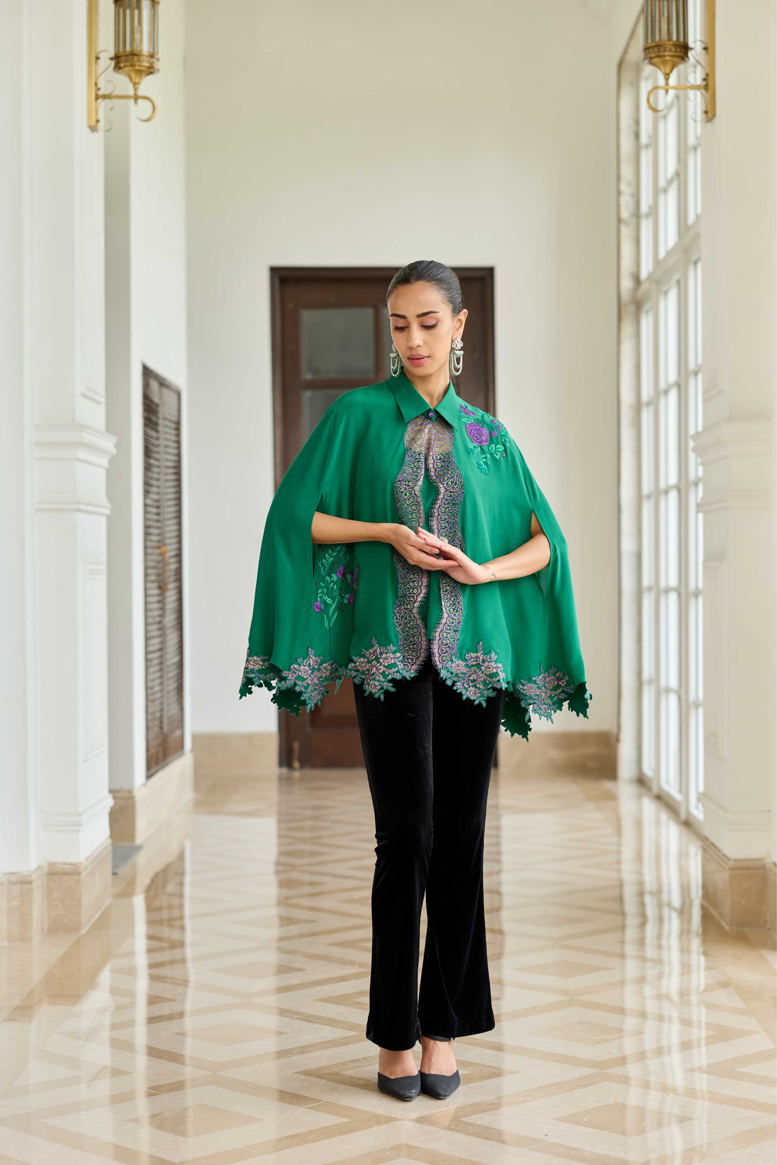 A free-flowing 100% Silk Crepe Emerald Green cape featuring intricate hand embroidery and scalloped French lace detailing, designed for timeless elegance.