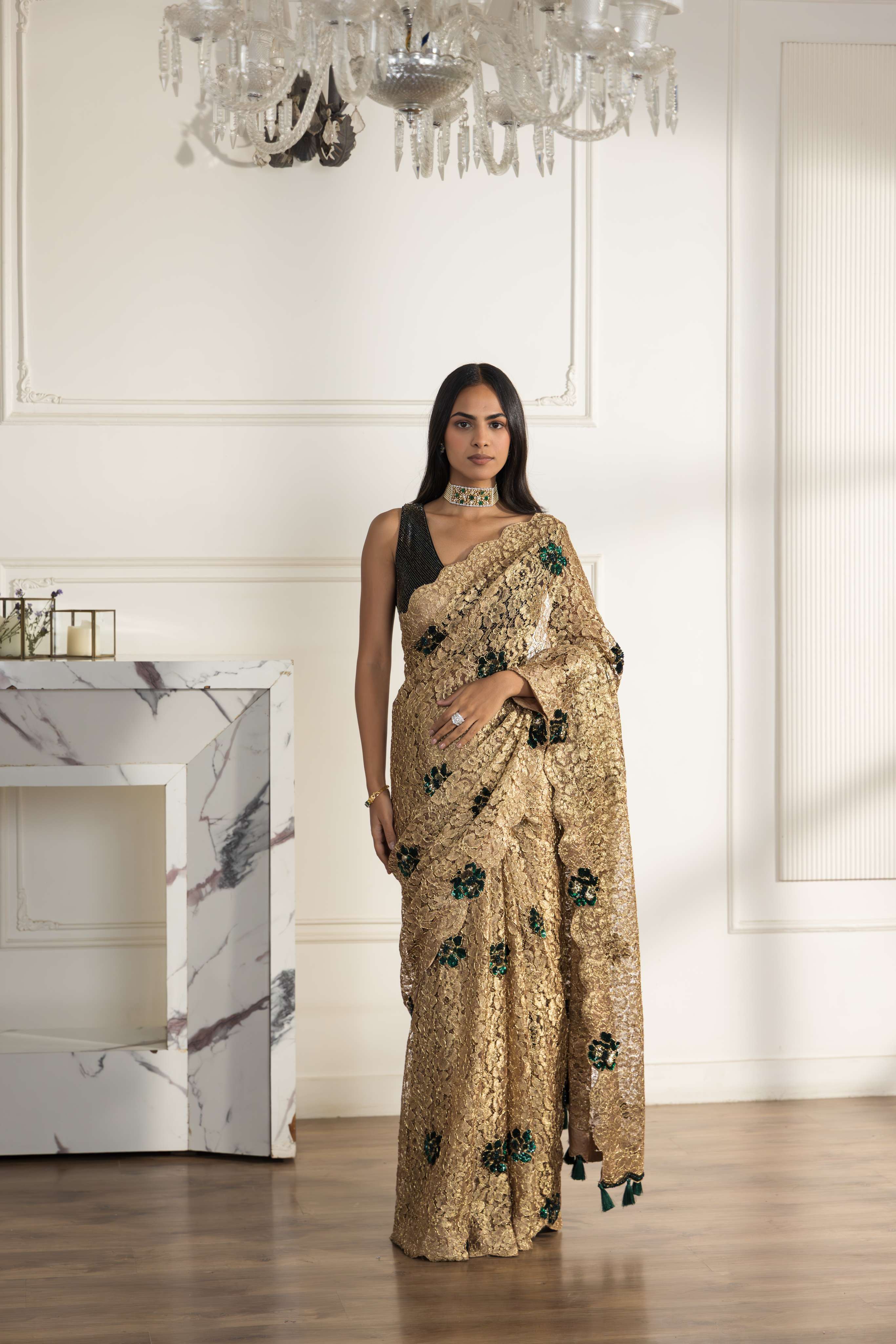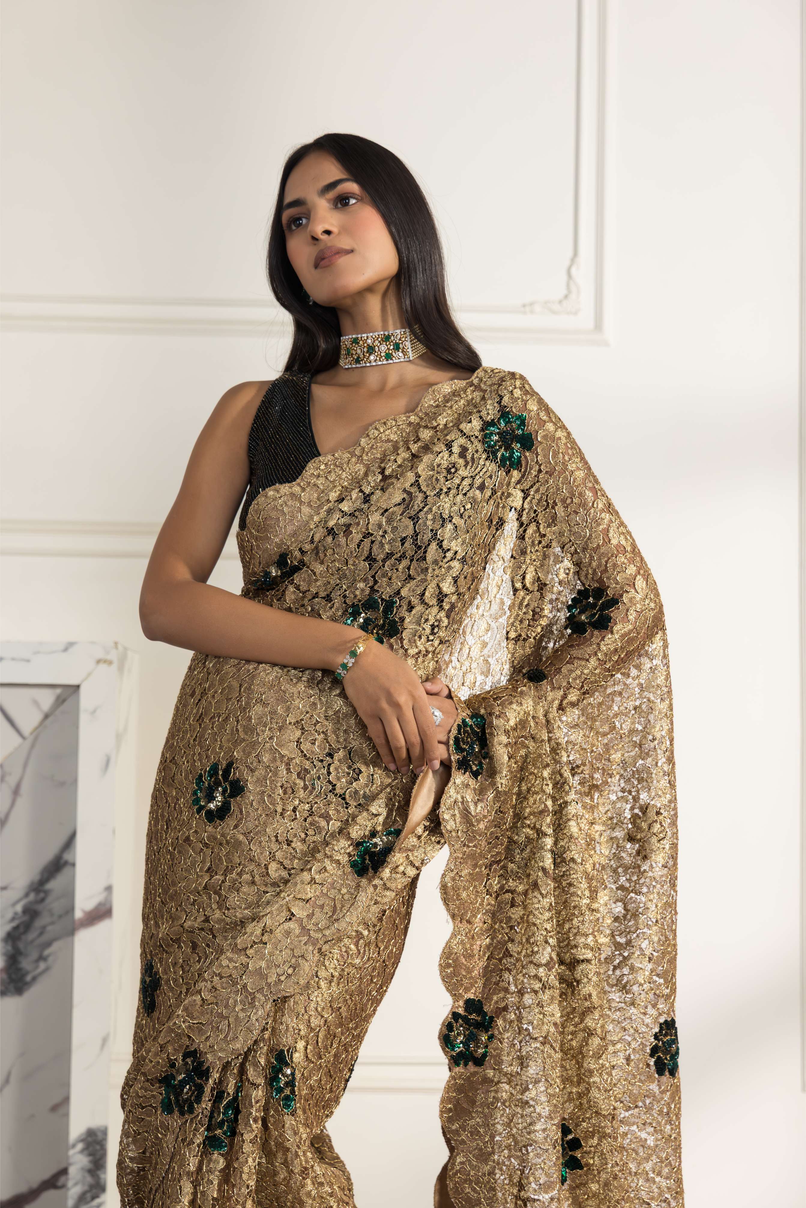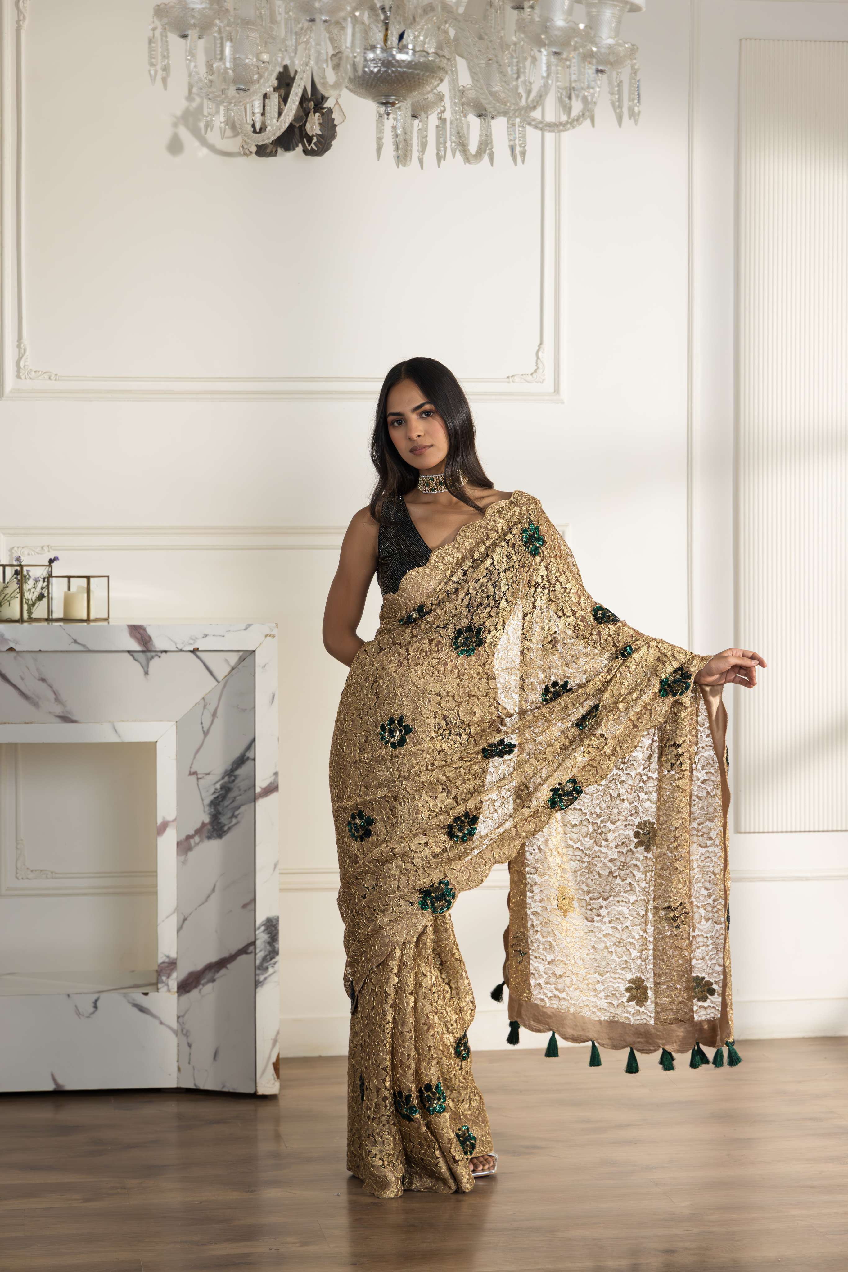 Crafted in full French guipure corded lace, this Rose Gold saree is a striking expression of artisanal detail. Highlighted with Green and Copper sequins in delicate floral motifs, it is further elevated by 200 hours of hand embroidery using Jaipuri beads, Green sequins, and Golden sequins. The intricate work brings depth, texture, and shimmer to the ensemble. Accompanying the saree are matching blouse and petticoat fabrics in 100% Satin Silk, ensuring a refined and coordinated look. This saree is designed for weddings, festive occasions, and special celebrations where craftsmanship and radiance take centre stage.