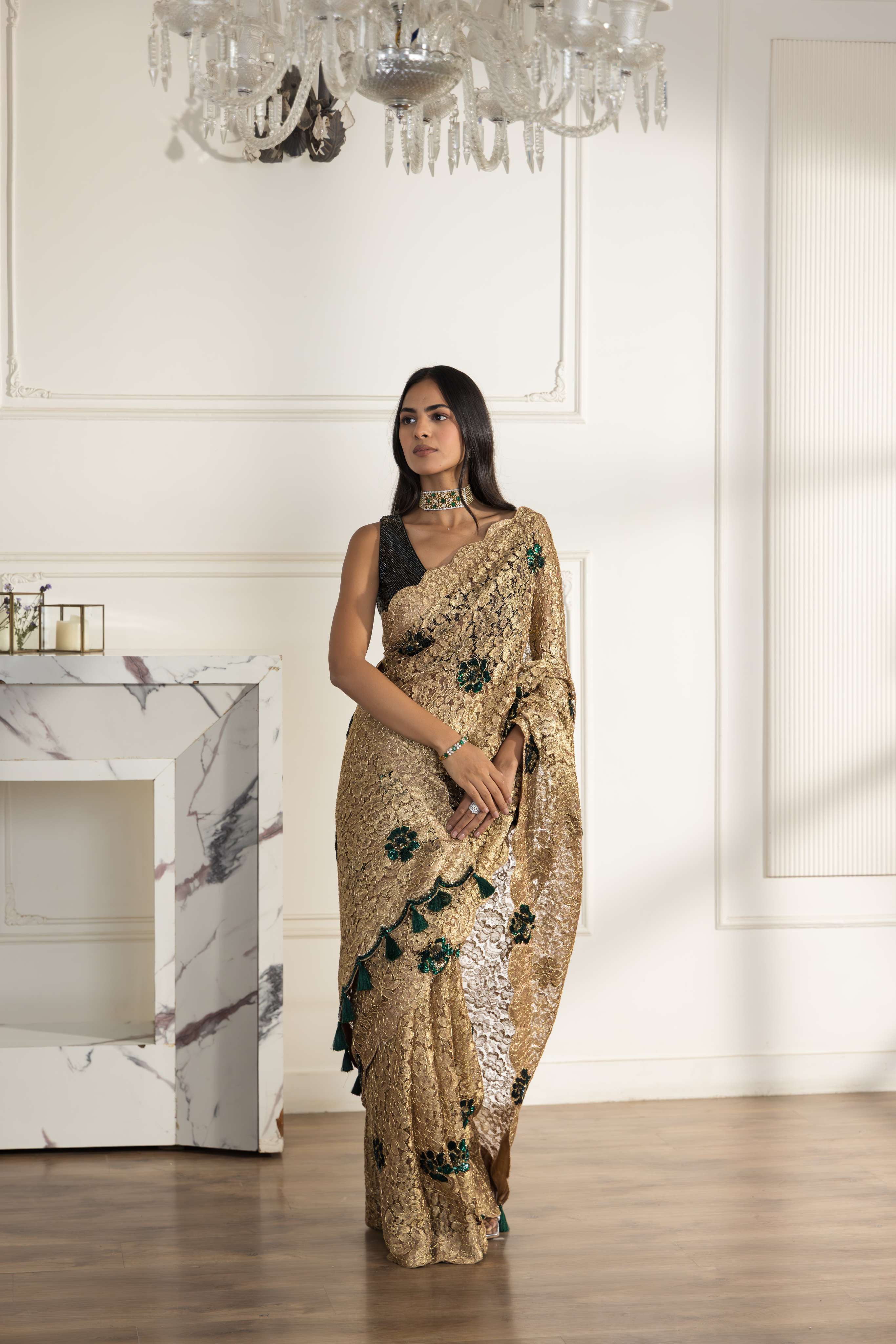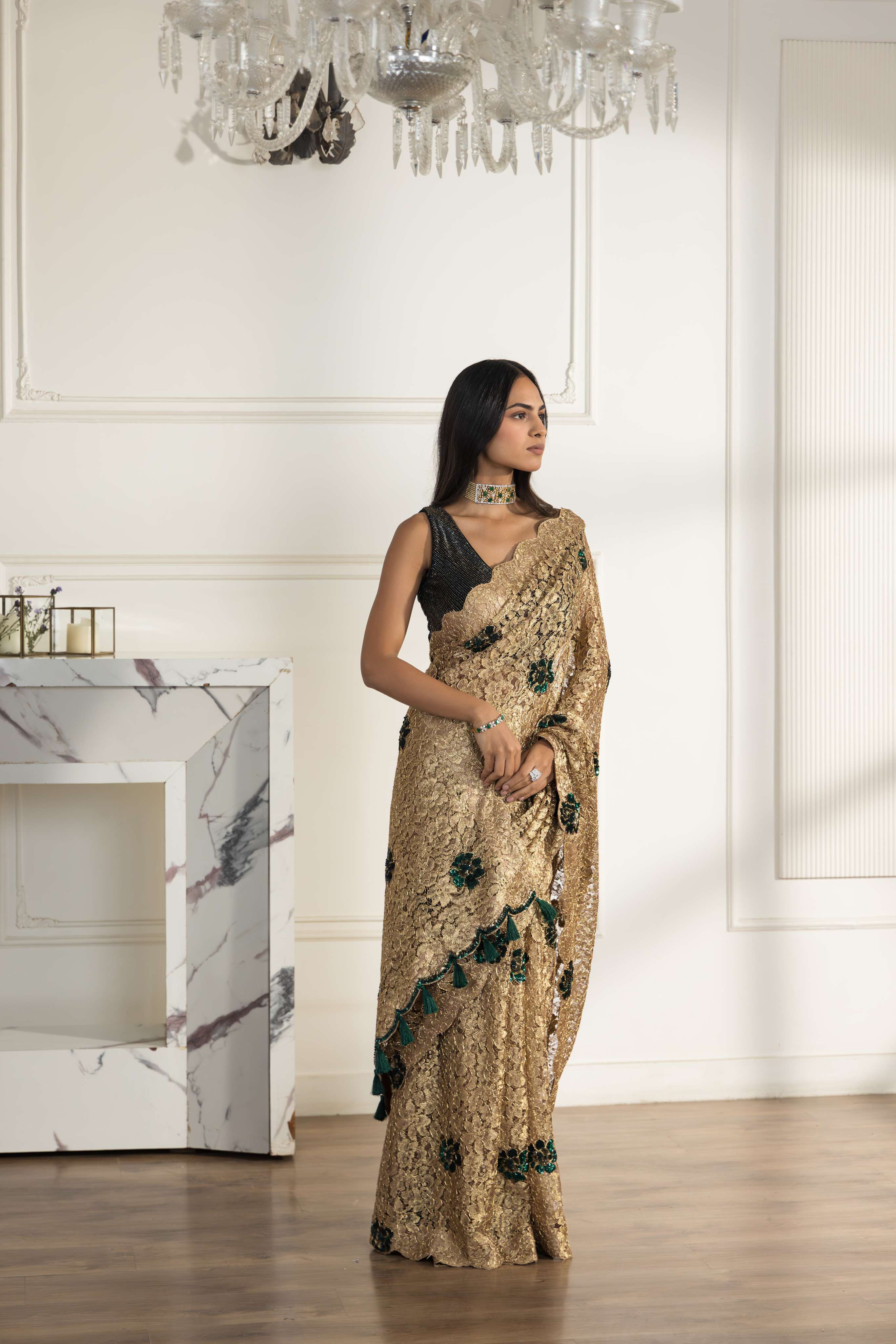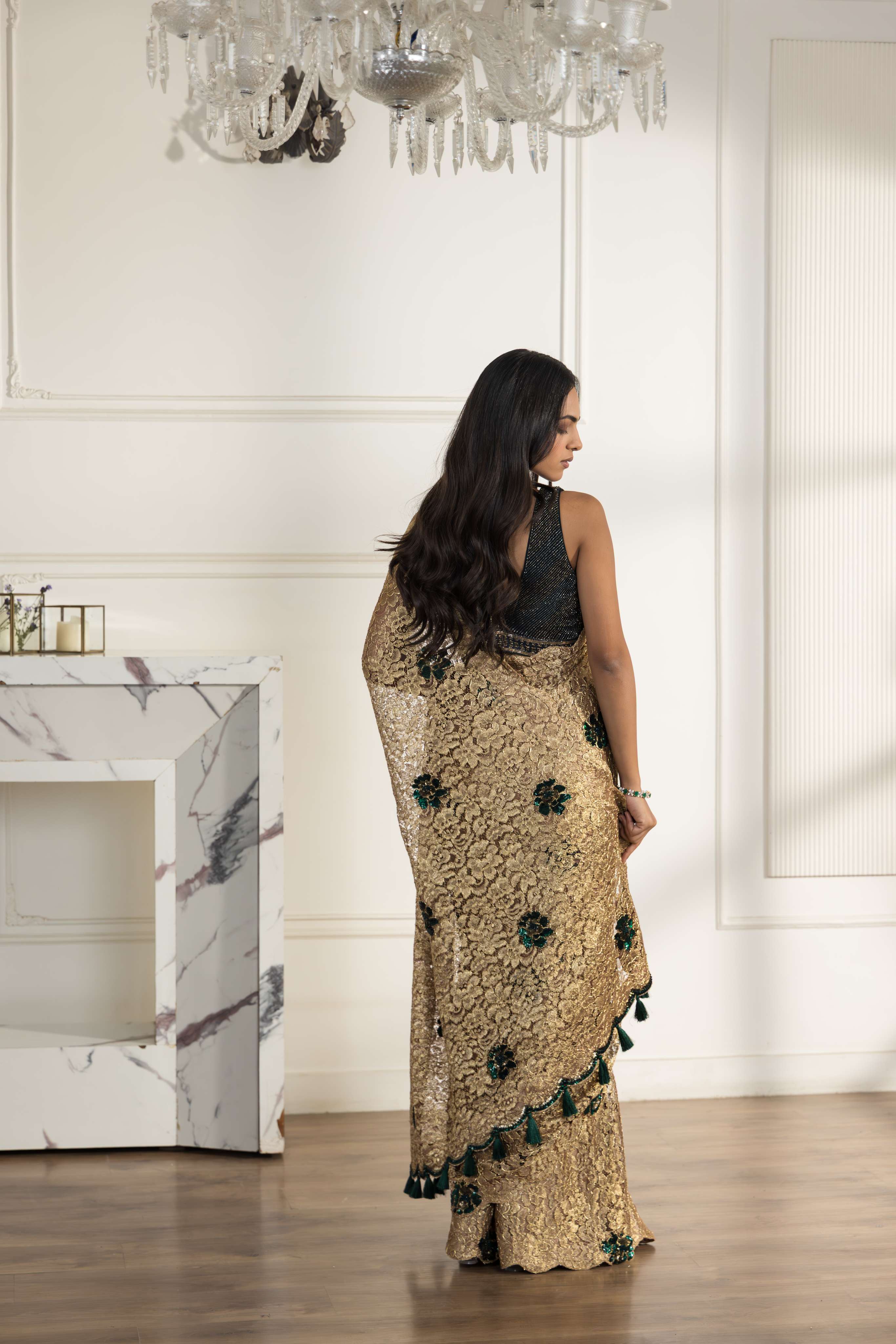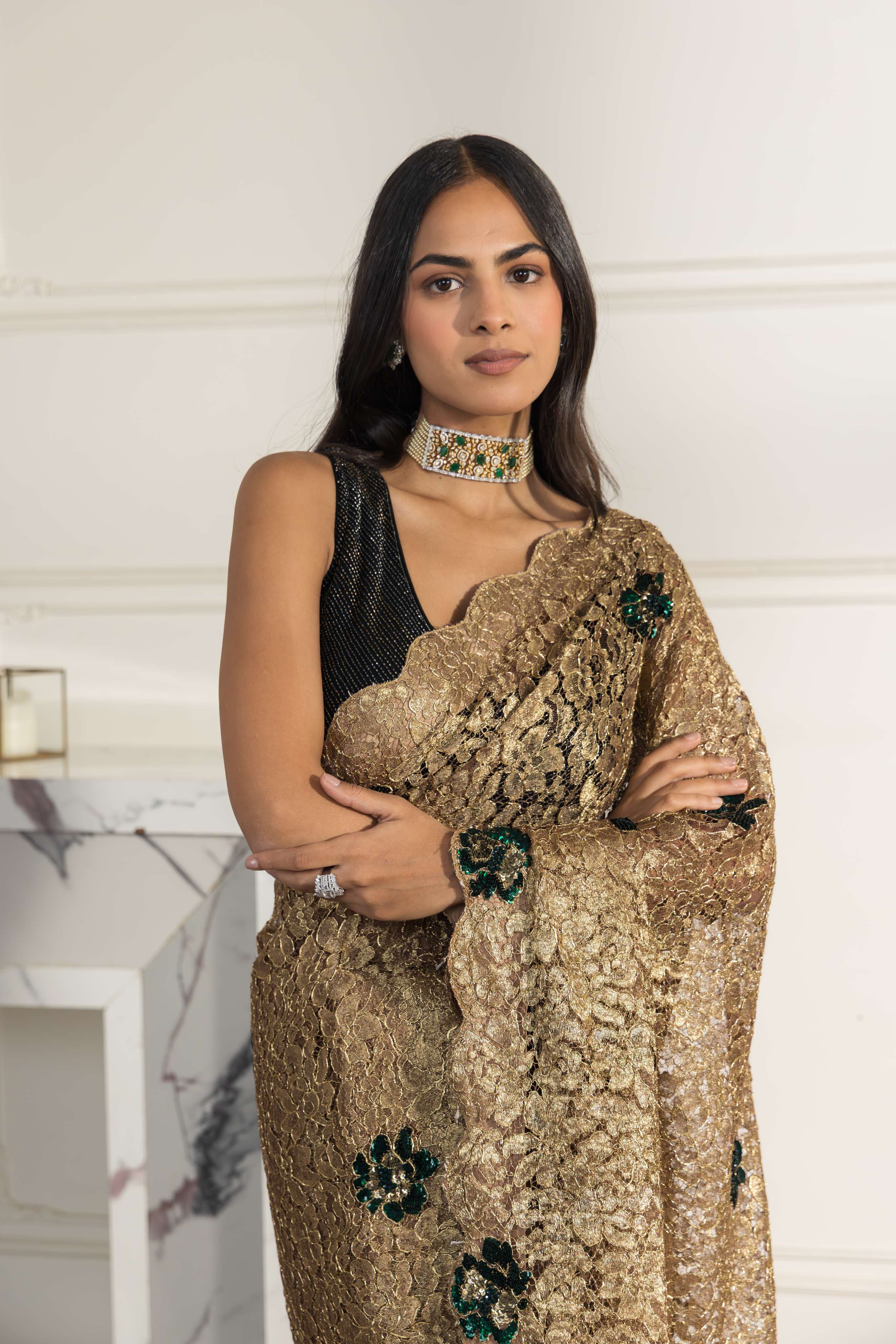 Crafted in full French guipure corded lace, this Rose Gold saree is a striking expression of artisanal detail. Highlighted with Green and Copper sequins in delicate floral motifs, it is further elevated by 200 hours of hand embroidery using Jaipuri beads, Green sequins, and Golden sequins. The intricate work brings depth, texture, and shimmer to the ensemble. Accompanying the saree are matching blouse and petticoat fabrics in 100% Satin Silk, ensuring a refined and coordinated look. This saree is designed for weddings, festive occasions, and special celebrations where craftsmanship and radiance take centre stage.